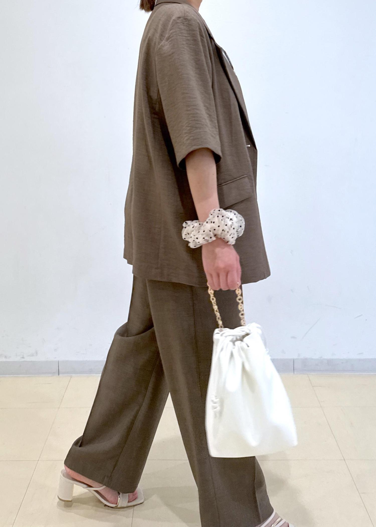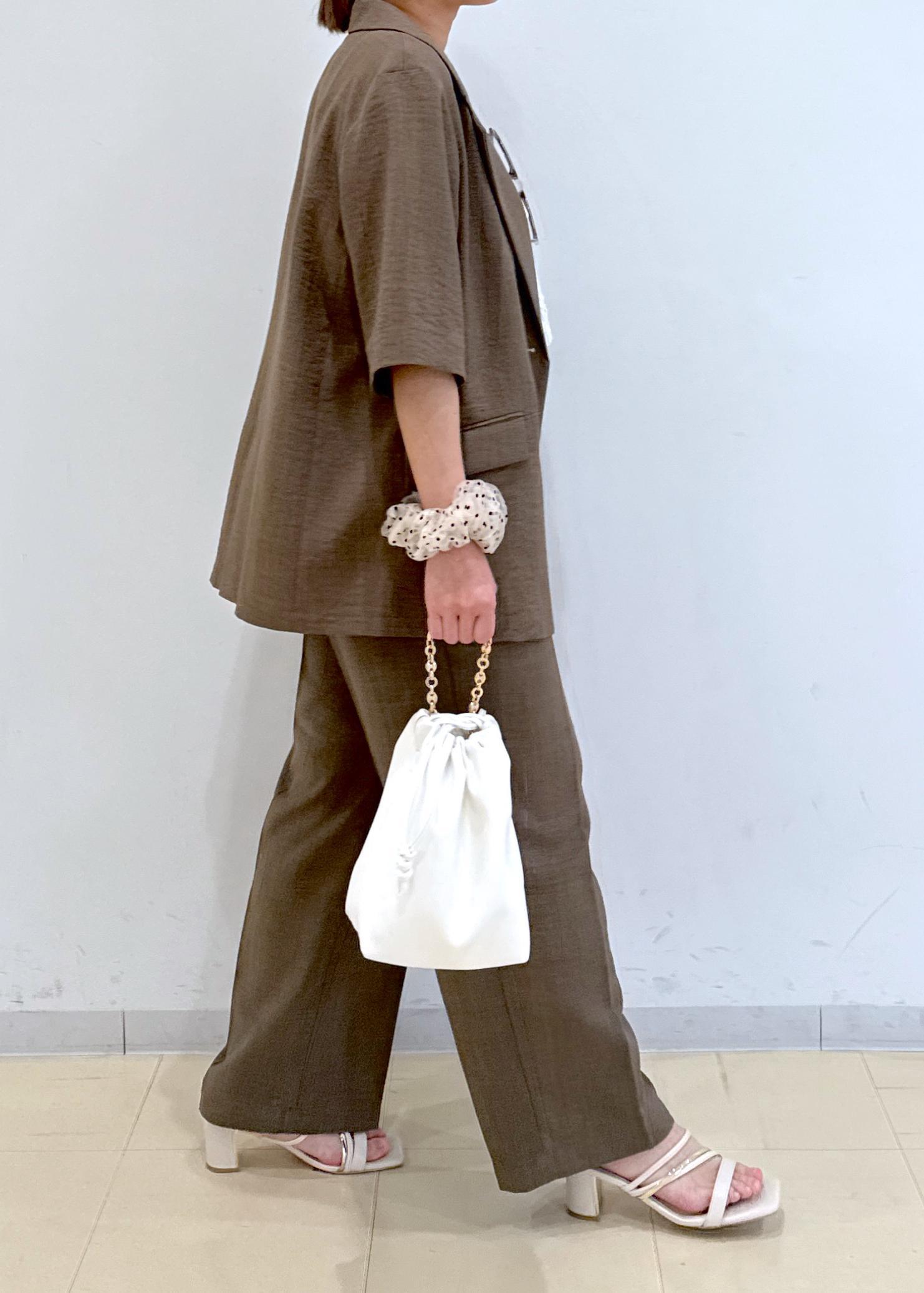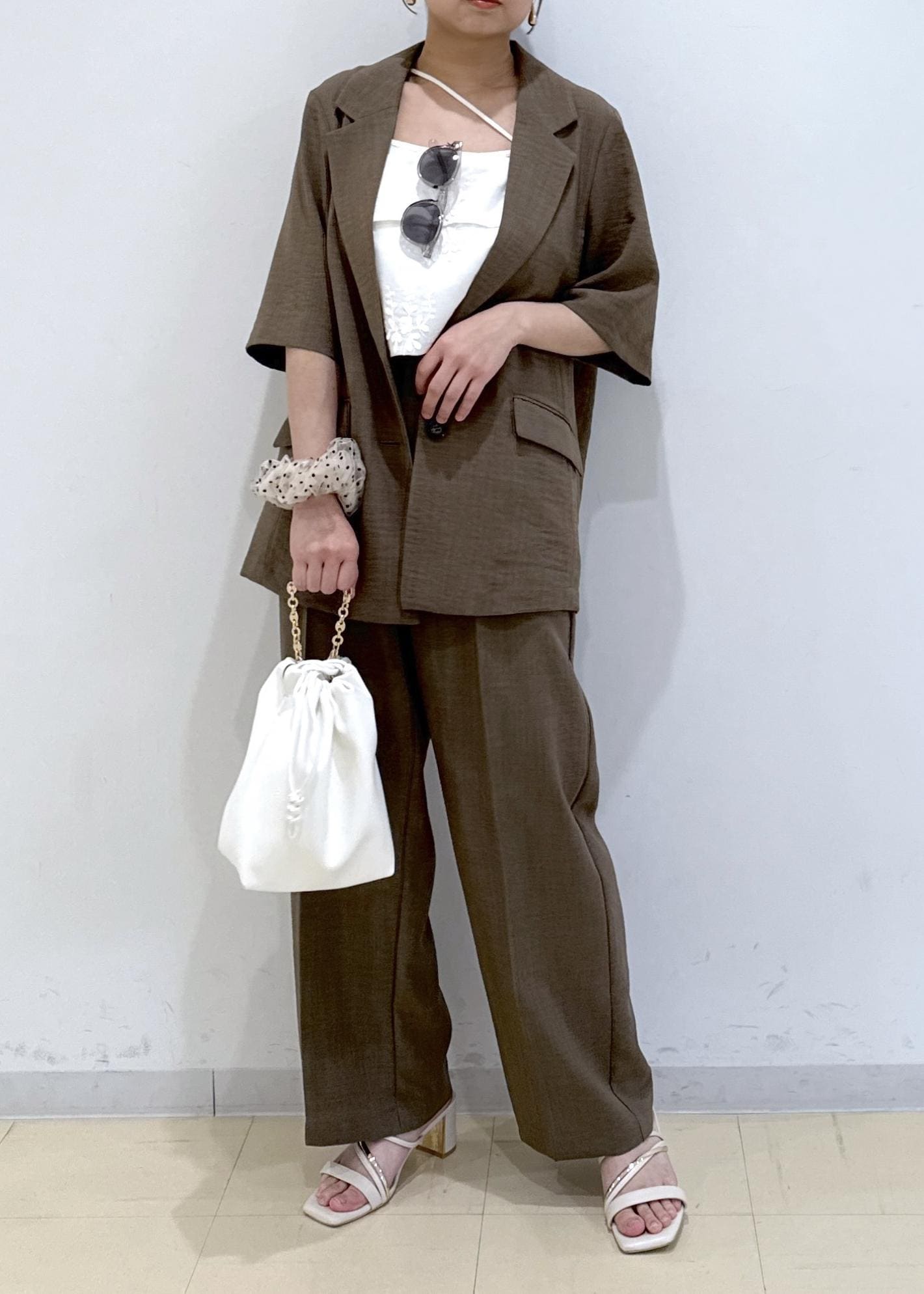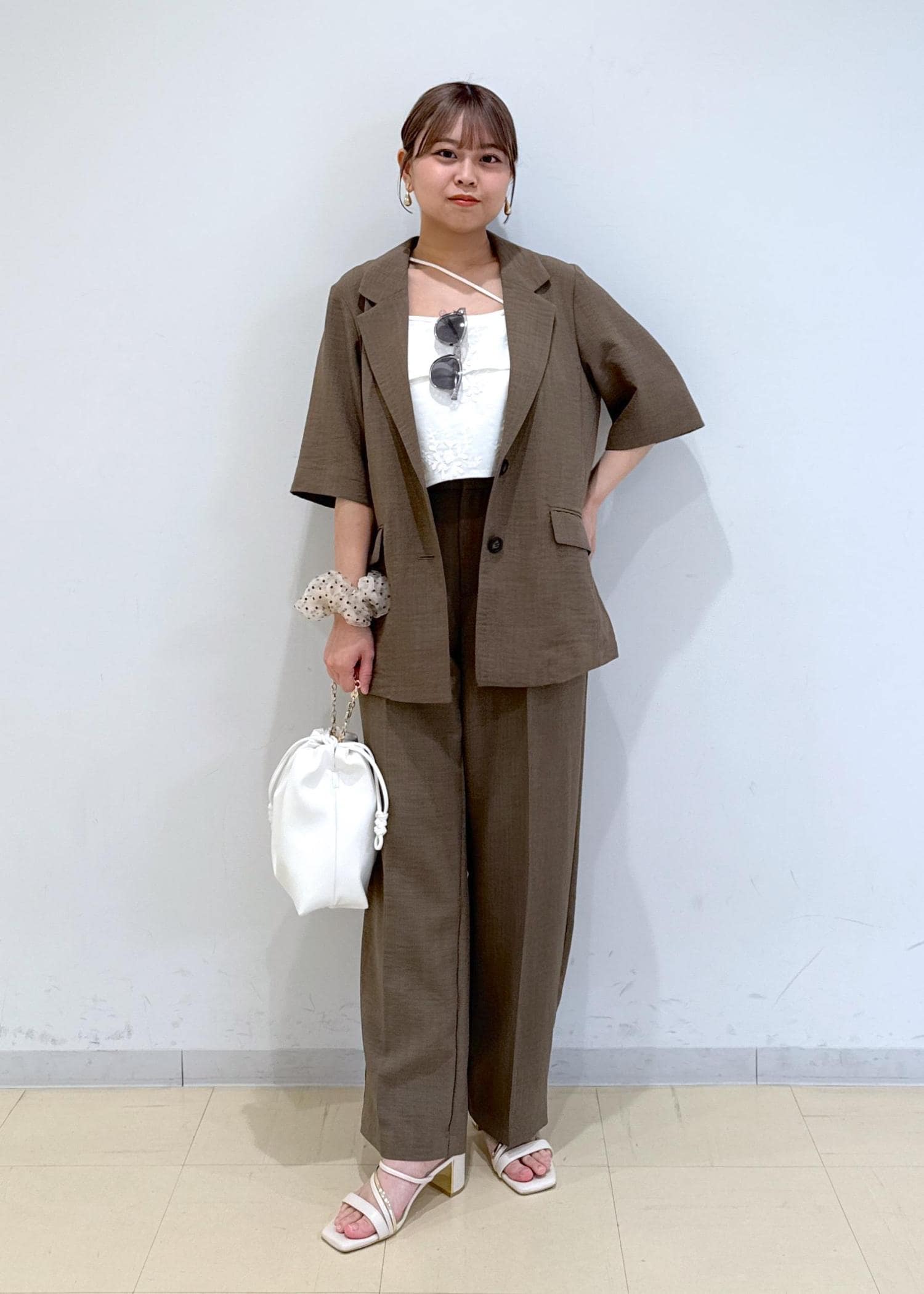 セットアップをビスチェ合わせで着用し、アシンメトリーのインナーと合わせることで一癖ある大人スタイルにしました。