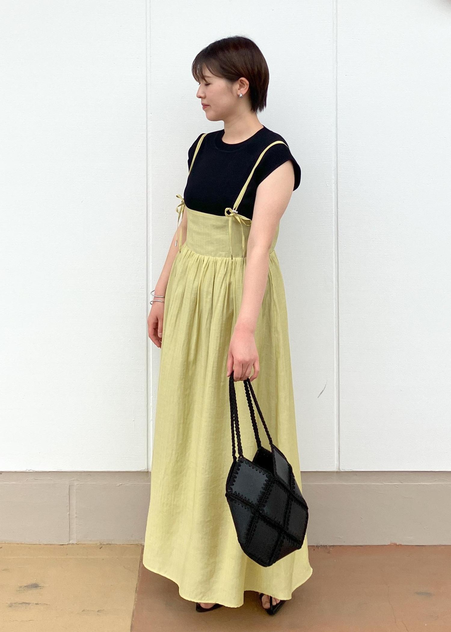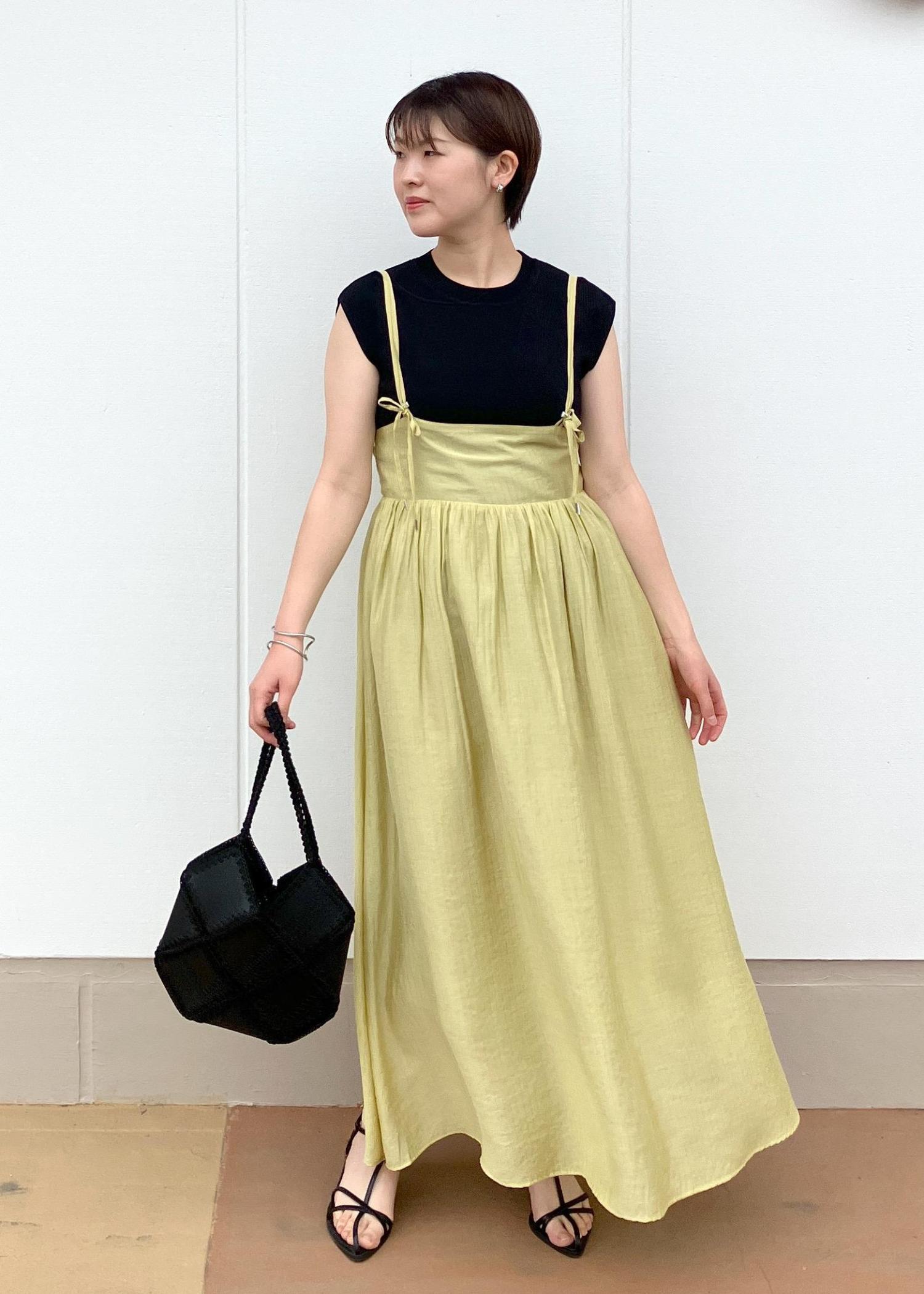 入荷前から気になっていたワンピース!綺麗めが好きなので美人スリーブ合わせでシンプルにしました!Tシャツでカジュアルにしていただくのもおすすめです!寒色よりのカラーが好きでグリーンにしました!他はブラックでグリーンが目立つようにと引き締め効果を狙いました!