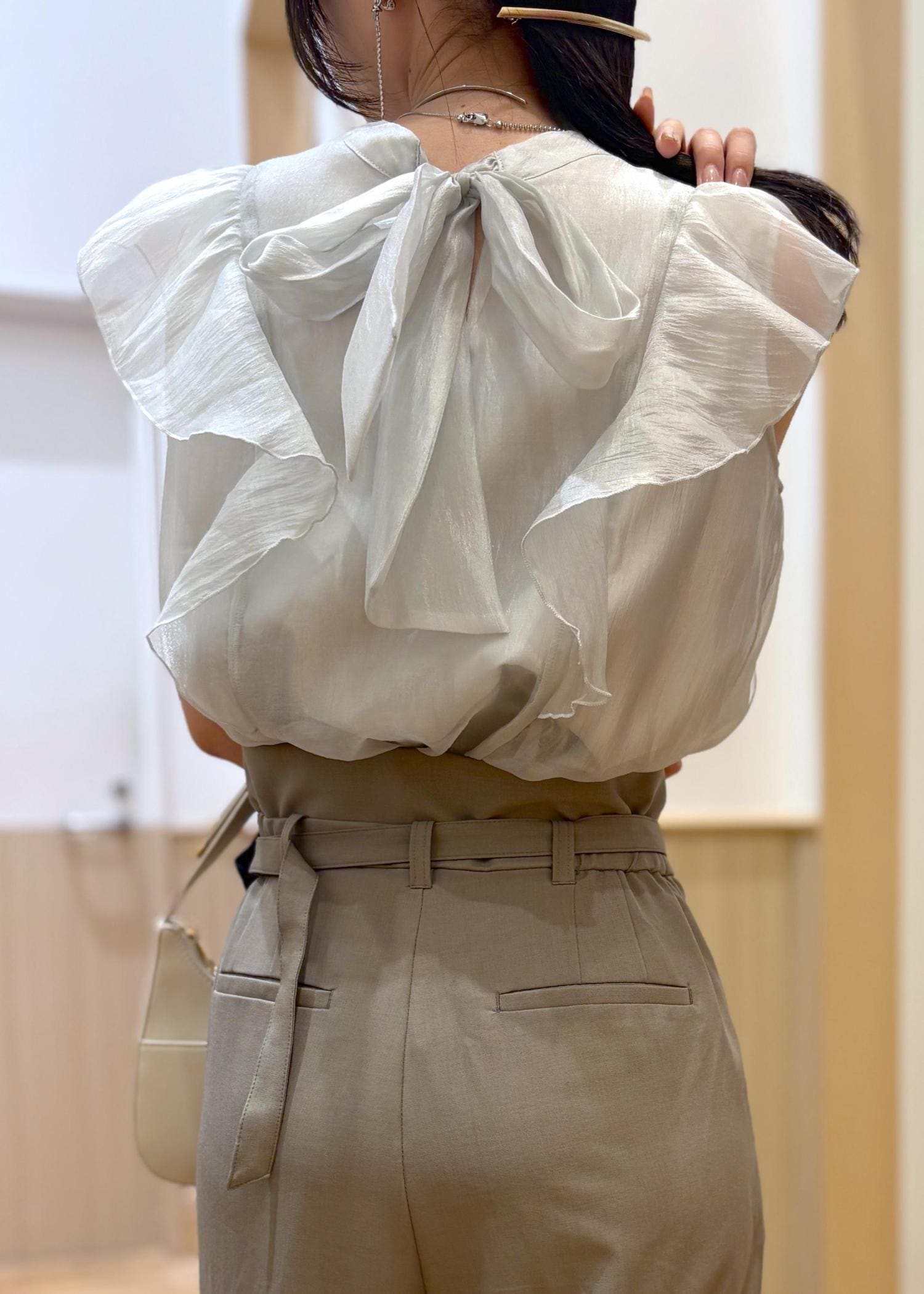 VIS【店頭人気】主役級!華やぎシアーシャイニーボウタイフリルブラウス【前後2WAY】【洗える】ライトグリーン / F¥5,489レビュー上半身が骨格ナチュラルで、肩幅がしっかりあるタイプなのですが、肩のフリル部分がシアーだったので主張しすぎずに着れました。