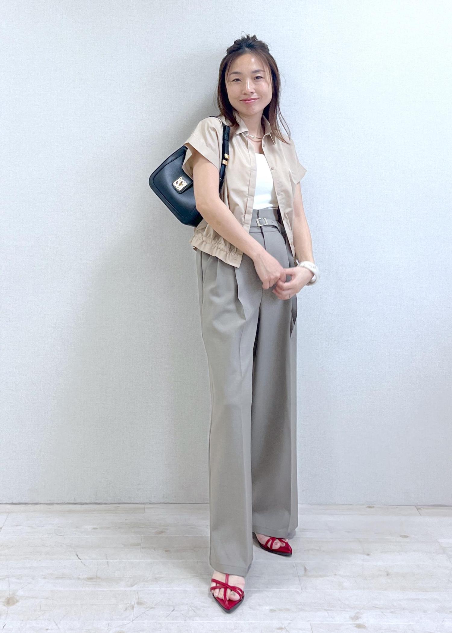 ワントーンでまとめて、足元なやカラーをプラスしてポイントに!キレイめにもカジュアルスタイルにもお勧めです