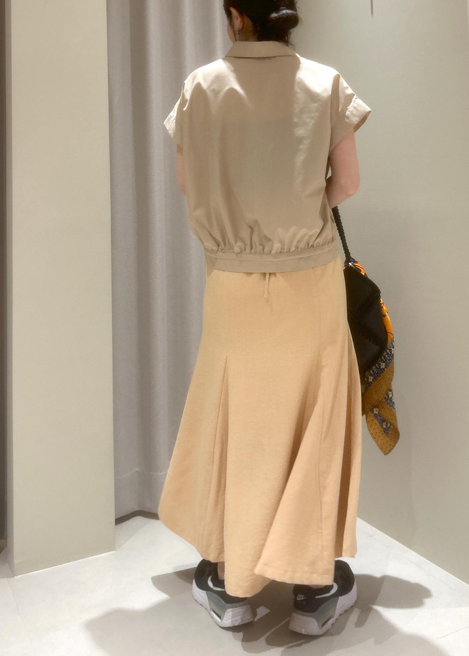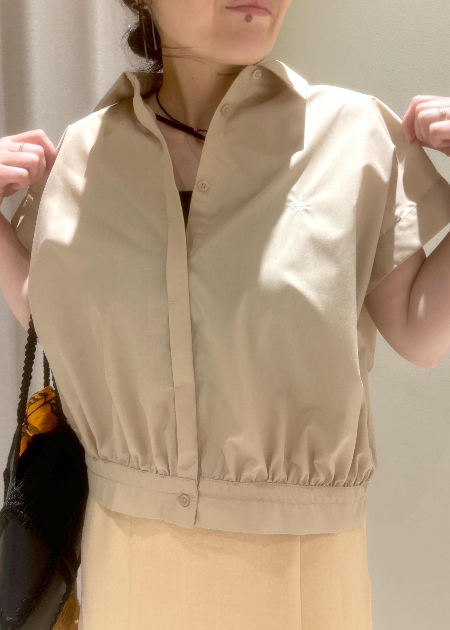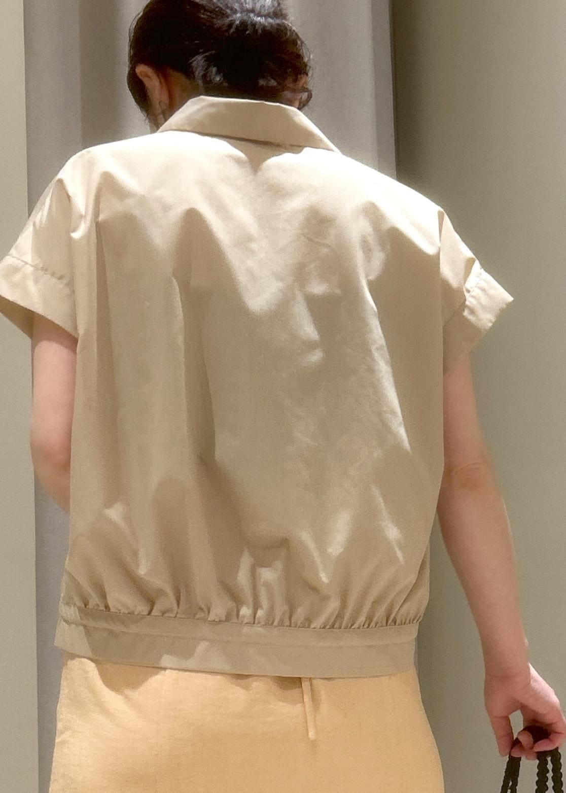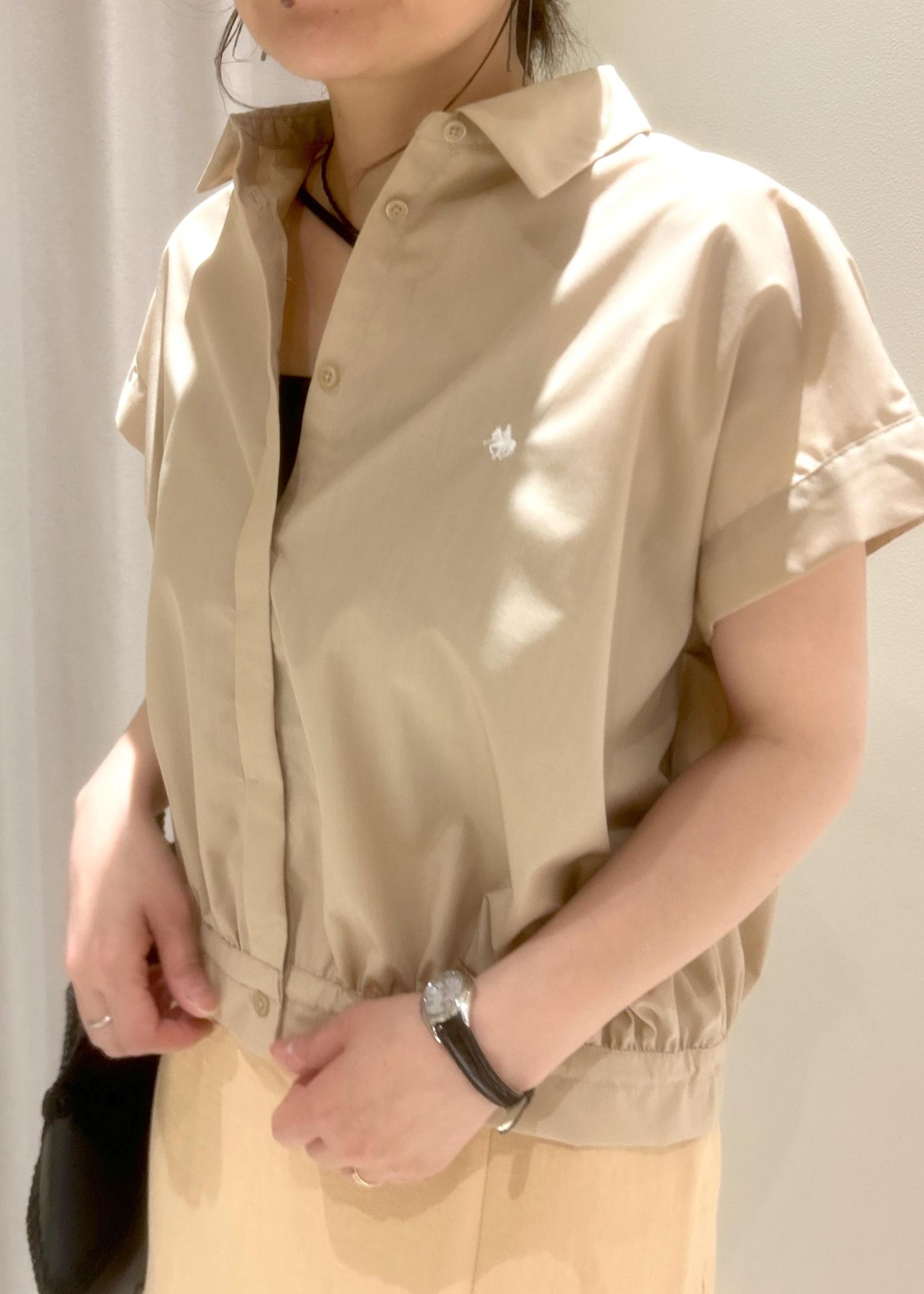腕回りをカバーしてくれるフレンチスリーブのデザイン。肌離れするデザインもこれから暑い時期に向けて嬉しいポイント◎ボタンを止めるときちんと感も出る少しハリ感のあるお素材でく。