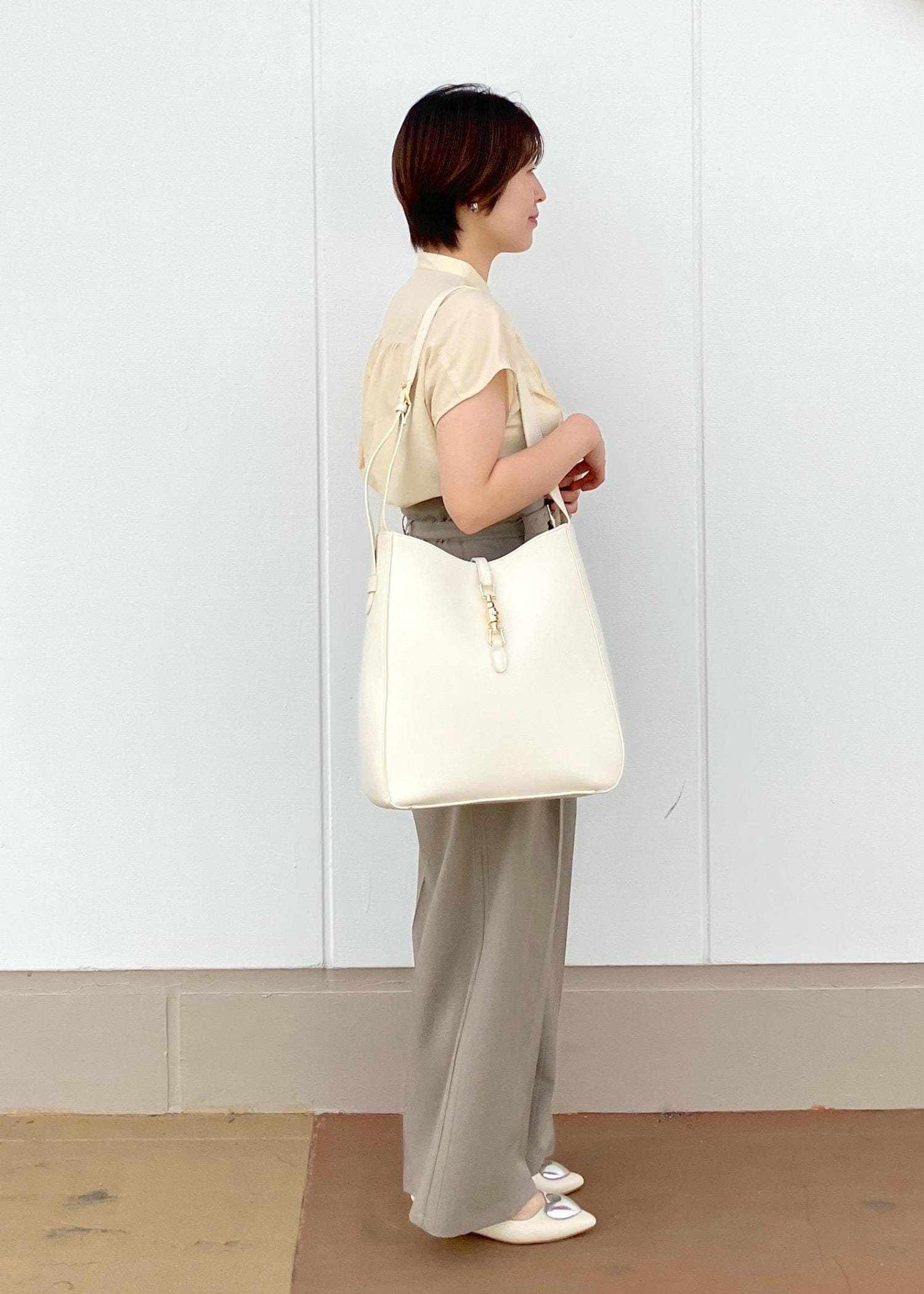洗練されたデザインでオンオフ兼用でお使いいただけます!ファスナーとフロントの金具で口元を留めることが出来るのでダブルの安心感ありです!太めのショルダーが肩に食い込まず肩への負担がありません!パソコンやA4サイズの書類、パッドも入るサイズ感です!