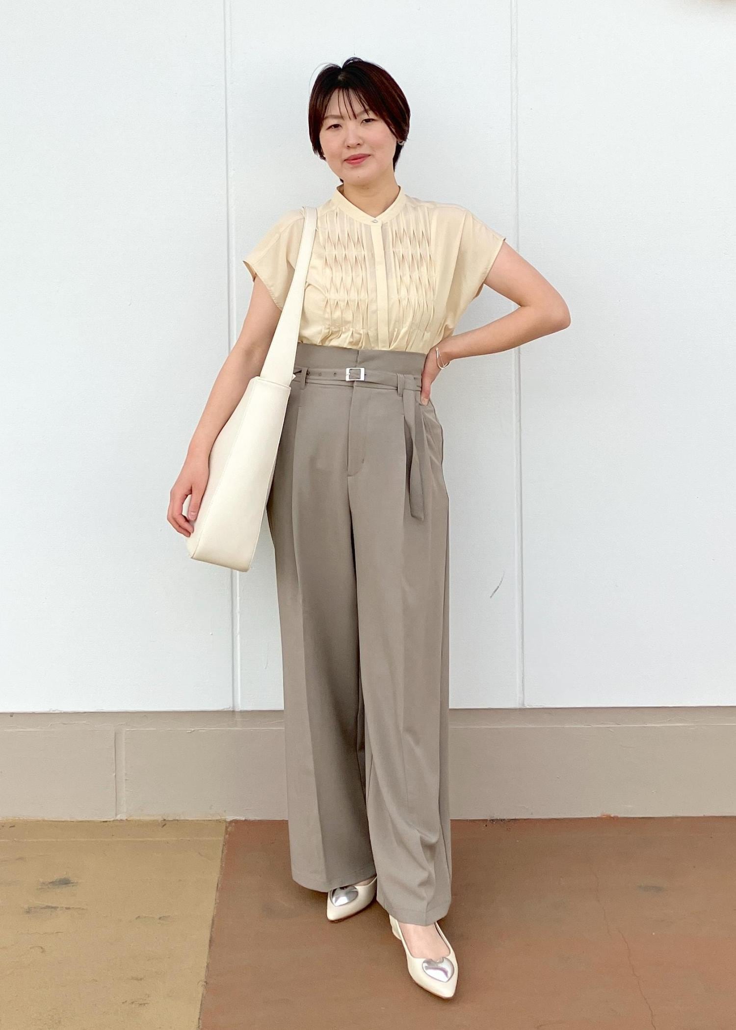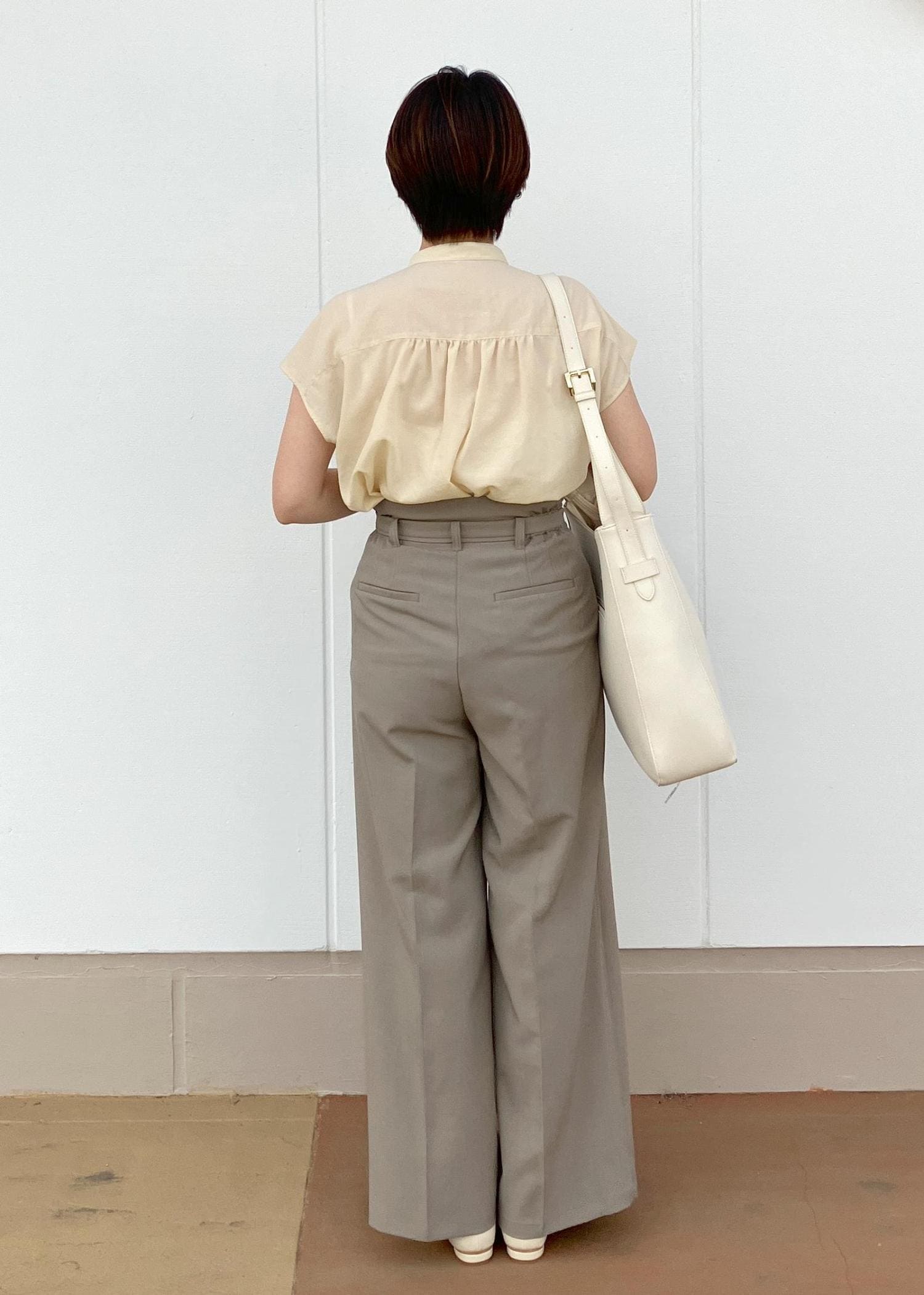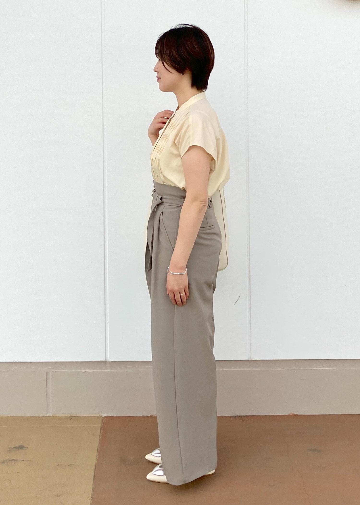 お店でも人気の組み合わせを着用してみました!こちらのワイドパンツ、ベージュの色味に気流染めブラウスのイエローやブルーの組み合わせが人気です!いつも寒色を選びがちなので明るくイエローにしてみました!