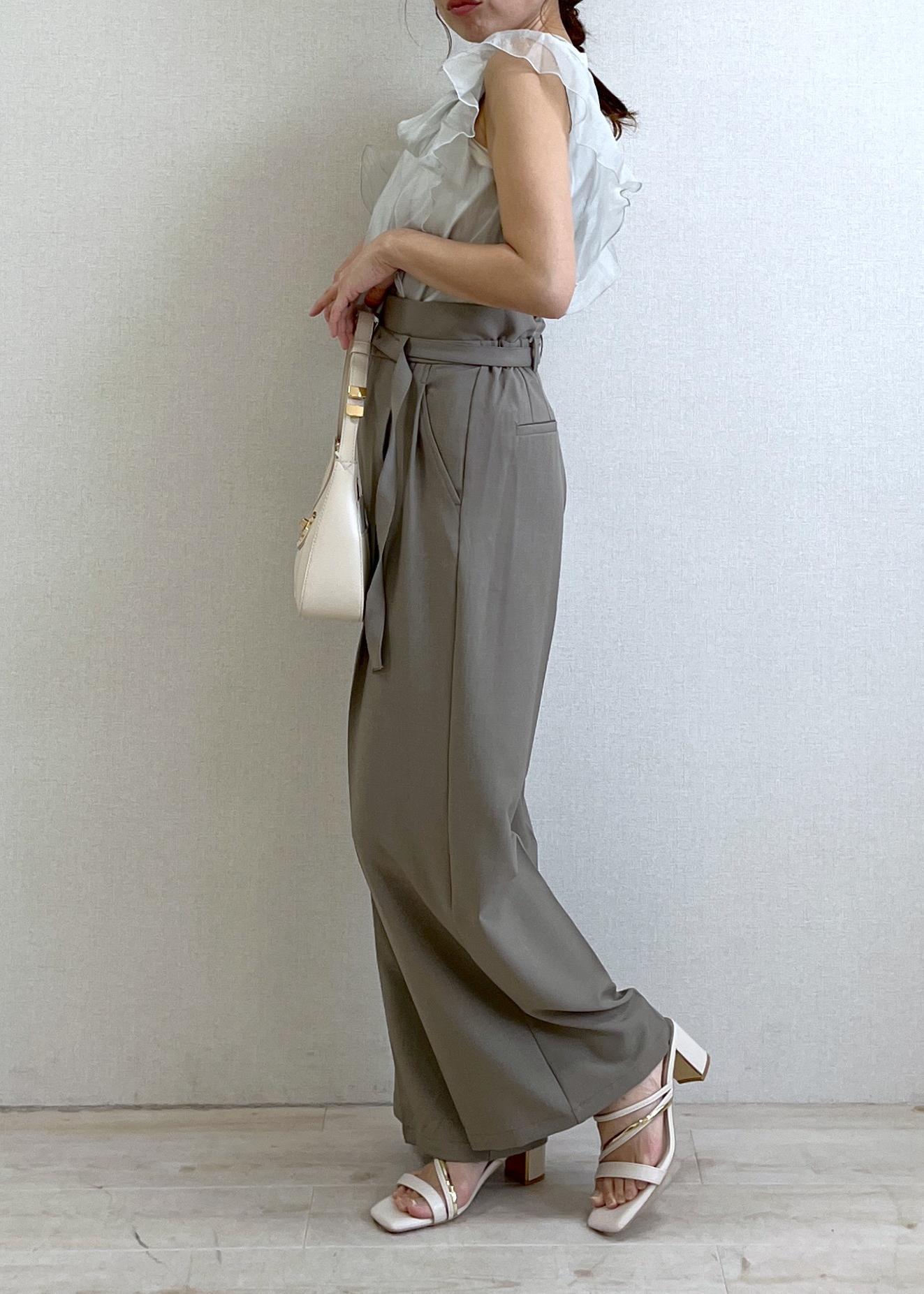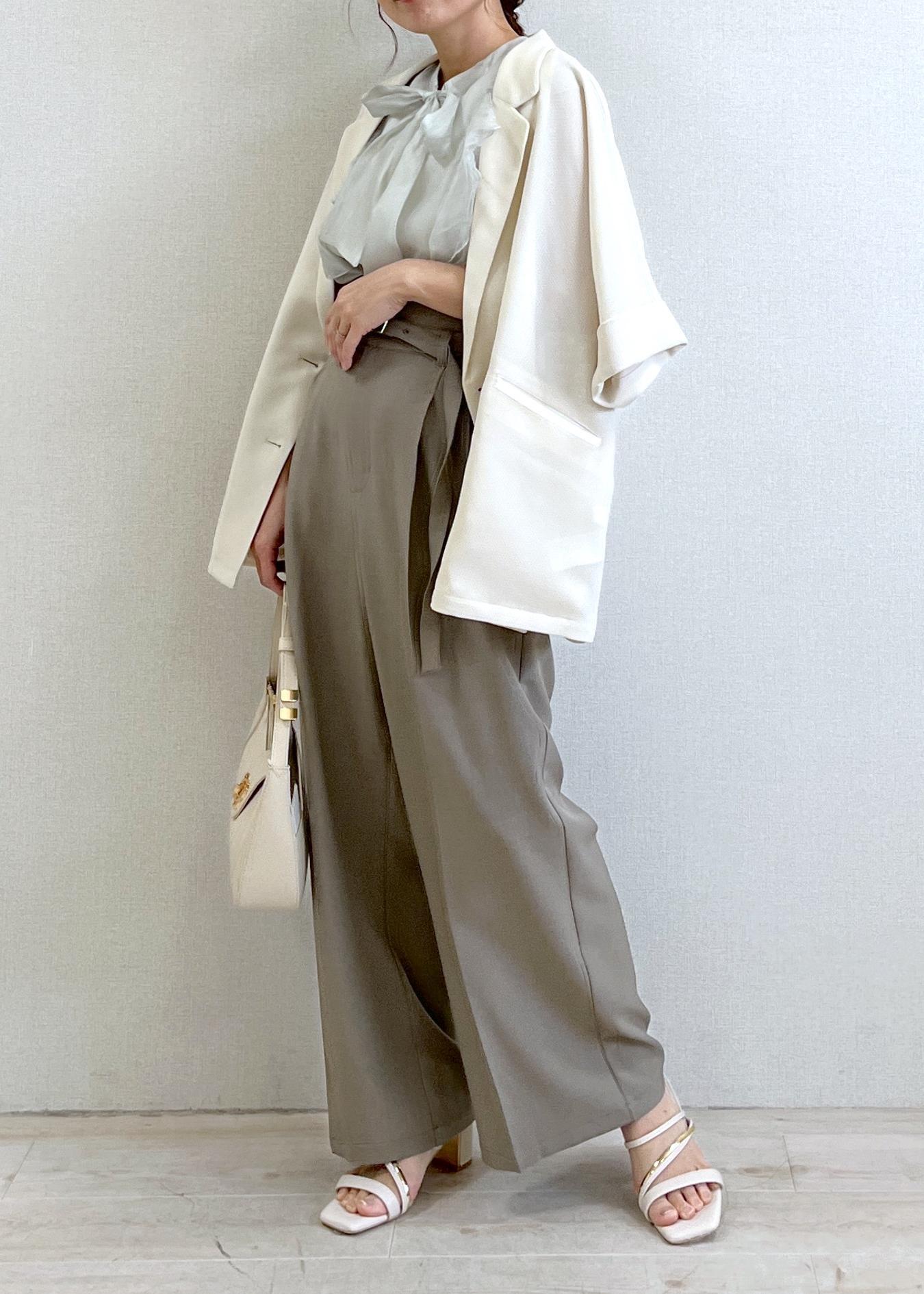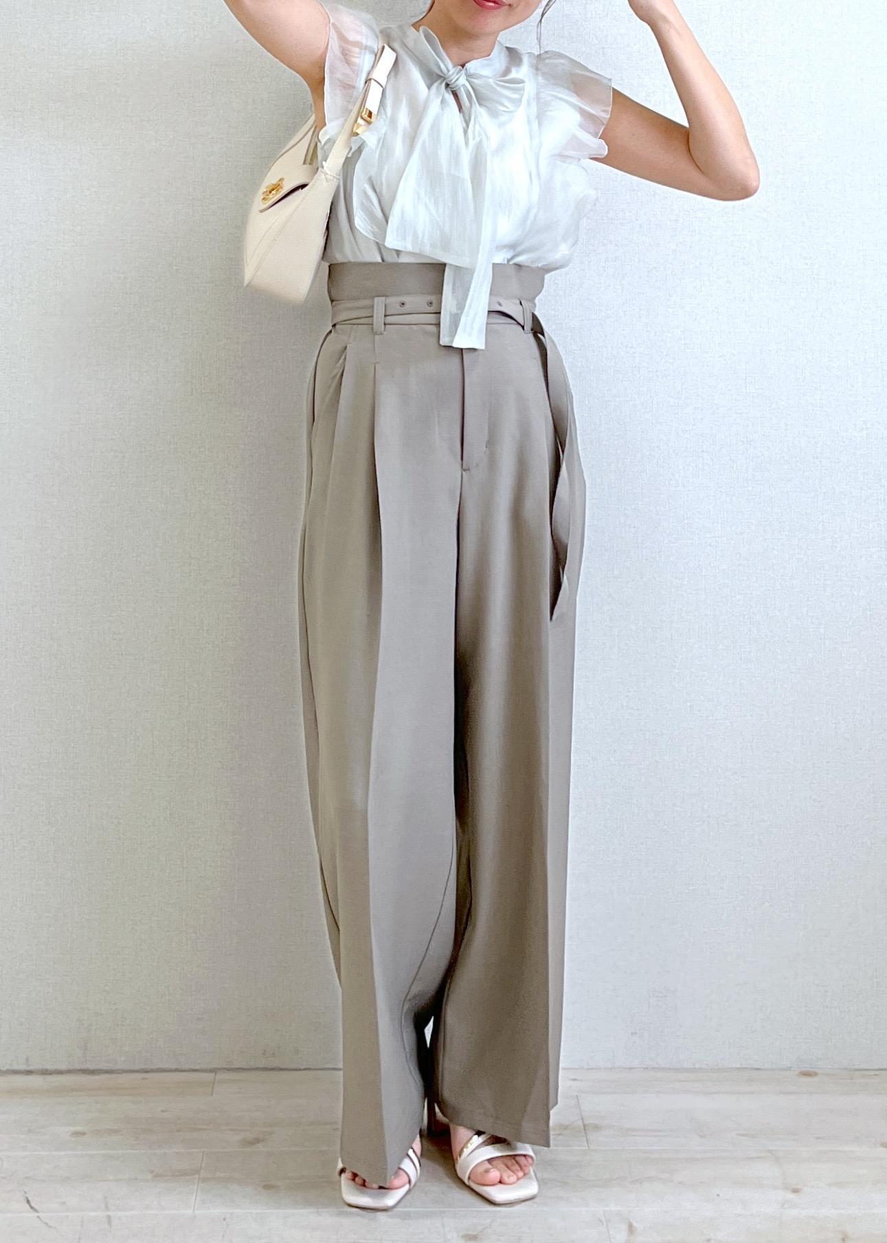 リボン×シフォンの甘めなブラウスにシンプル美脚パンツで