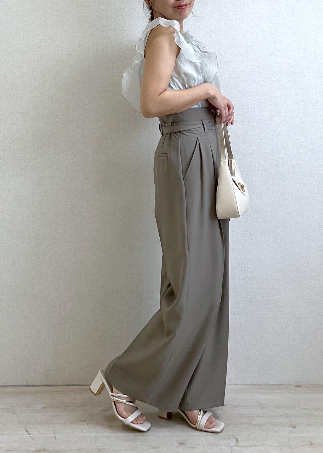 VIS【新色追加】【防シワ/接触冷感】ベルトディテールタックワイドスラックスパンツベージュ系 / S¥6,589レビュー152cmでSサイズ着用し高めの位置で付属のベルトでしめてペタンコ靴でギリギリ床につかないくらいの長め丈。オチ感のある素材でシワにもなりにくく、とっても履きやすかったです。太すぎないワイドシルエットでどんなスタイリングにも使えそうです!