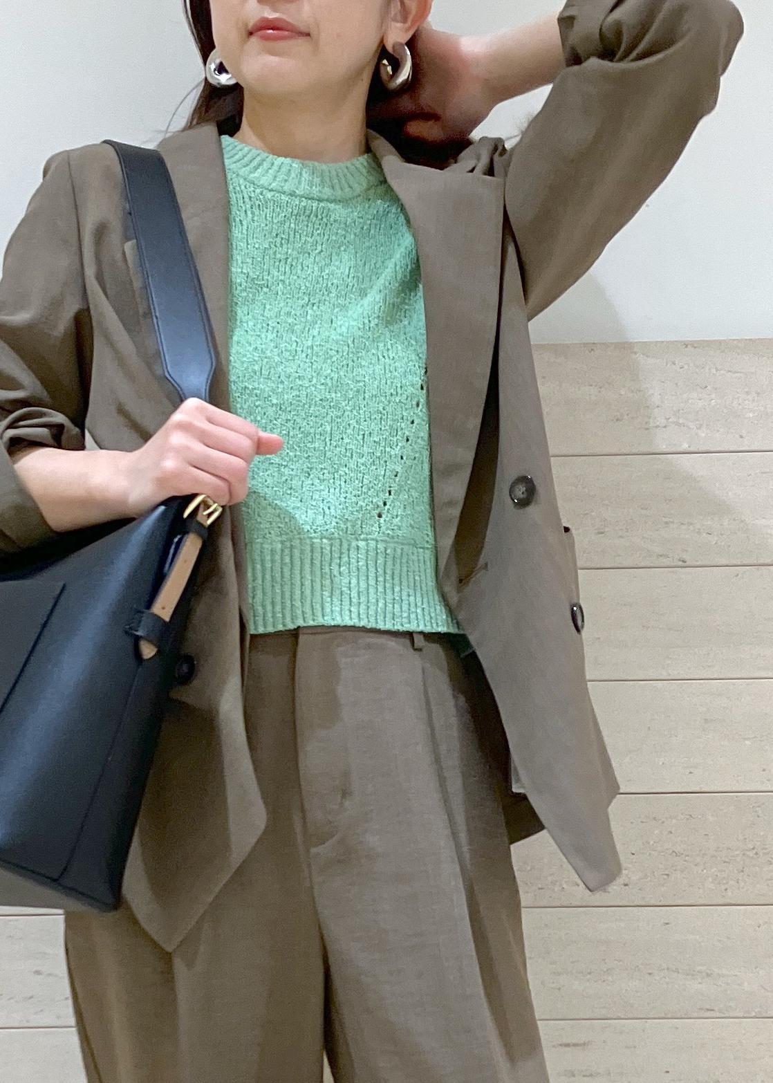 インナーに合わせたグリーンのサマーニットがポイントです。