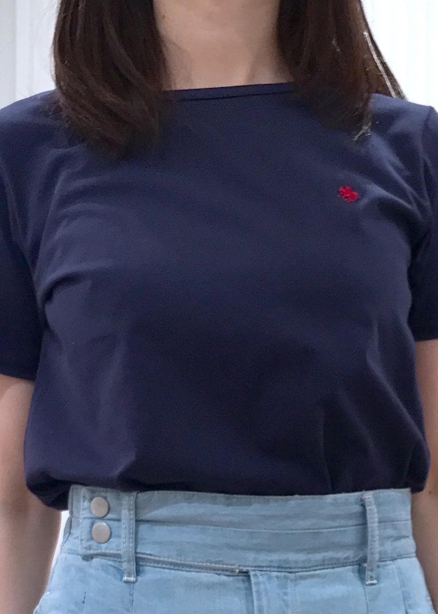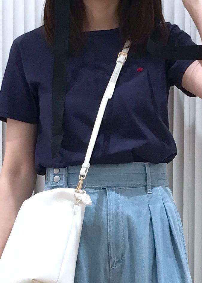 スッキリ見えするタイト目なTシャツでサイズはSとMの2サイズあり、カラーもホワイト、ネイビー、ブラックの3色展開なので着回しもしやすいですよ。