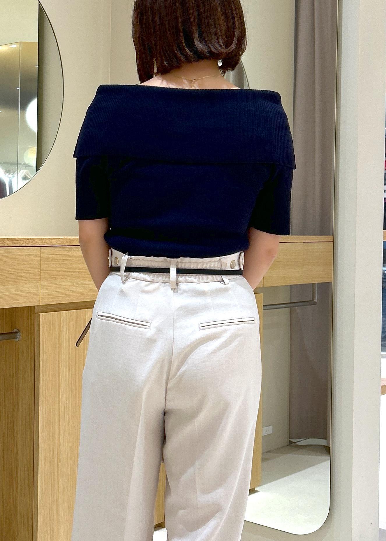 程よい肌見せで女性らしさが出るオフショルニットのコーディネートです。
