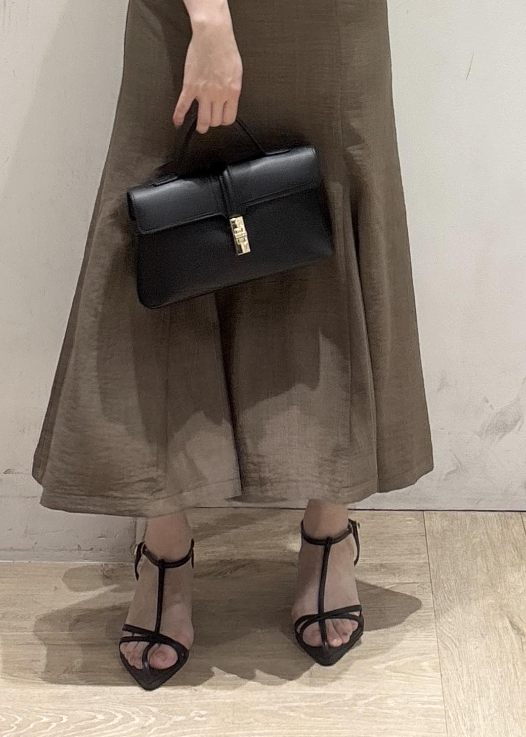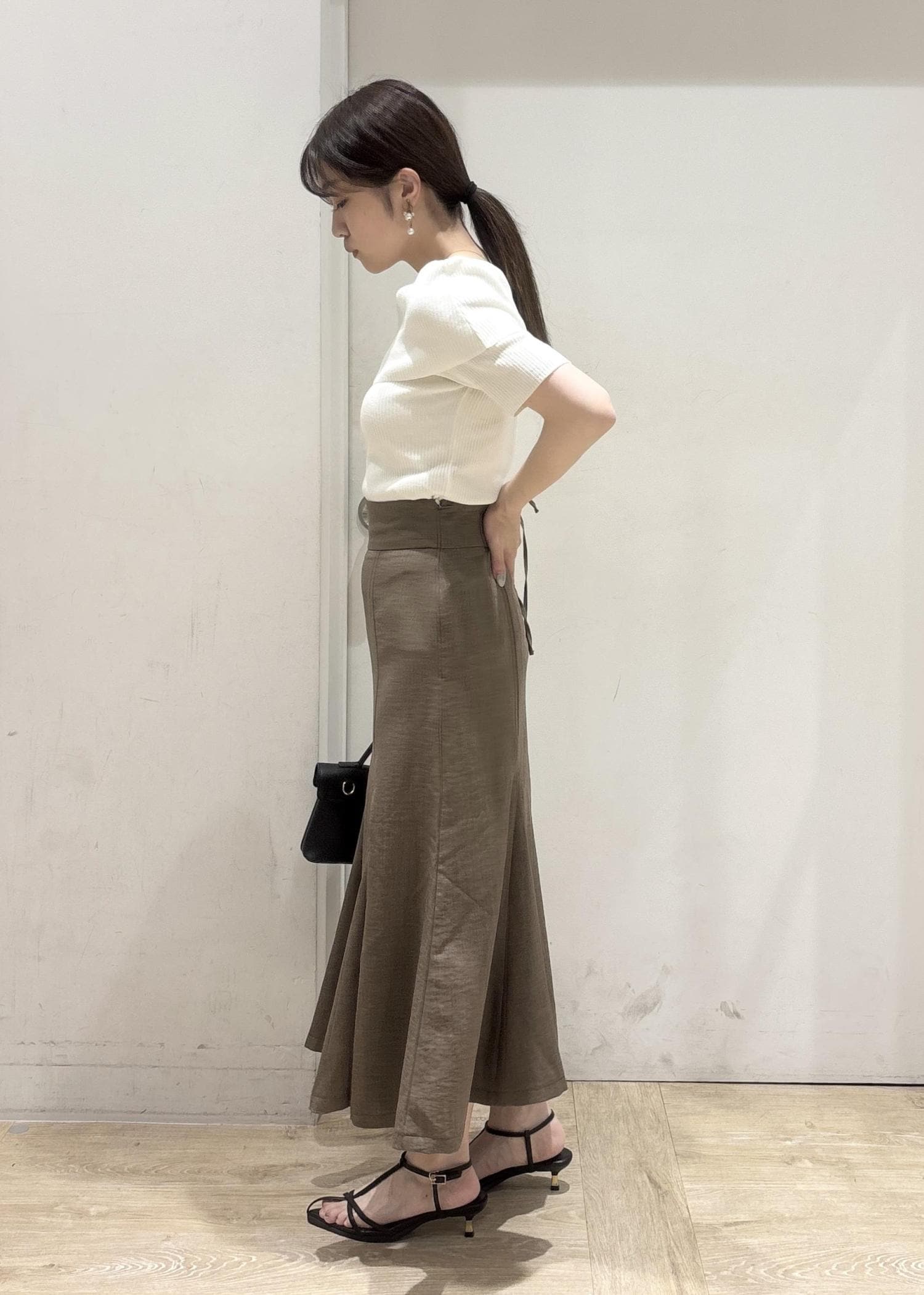 158cmSサイズ着用、着丈は足首より少し上の感じでした。サラッとしていて、マーメイドスカートにしては、ヒップの膨らみもあまり気になりませんでした◎