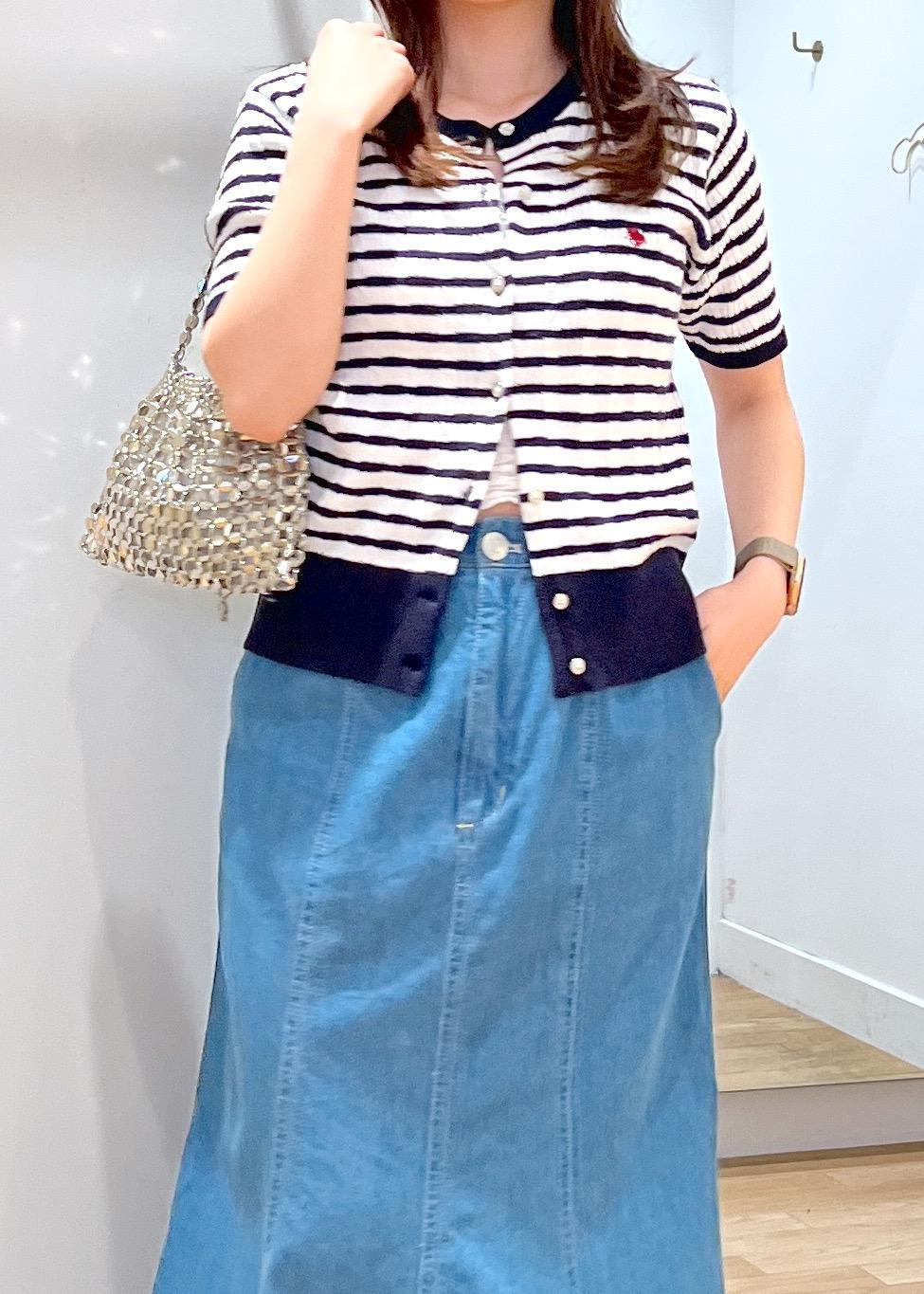 着丈はヒップにかかるくらいで丈がすっきりしているので、ワンピースの羽織りにもおすすめです。 -