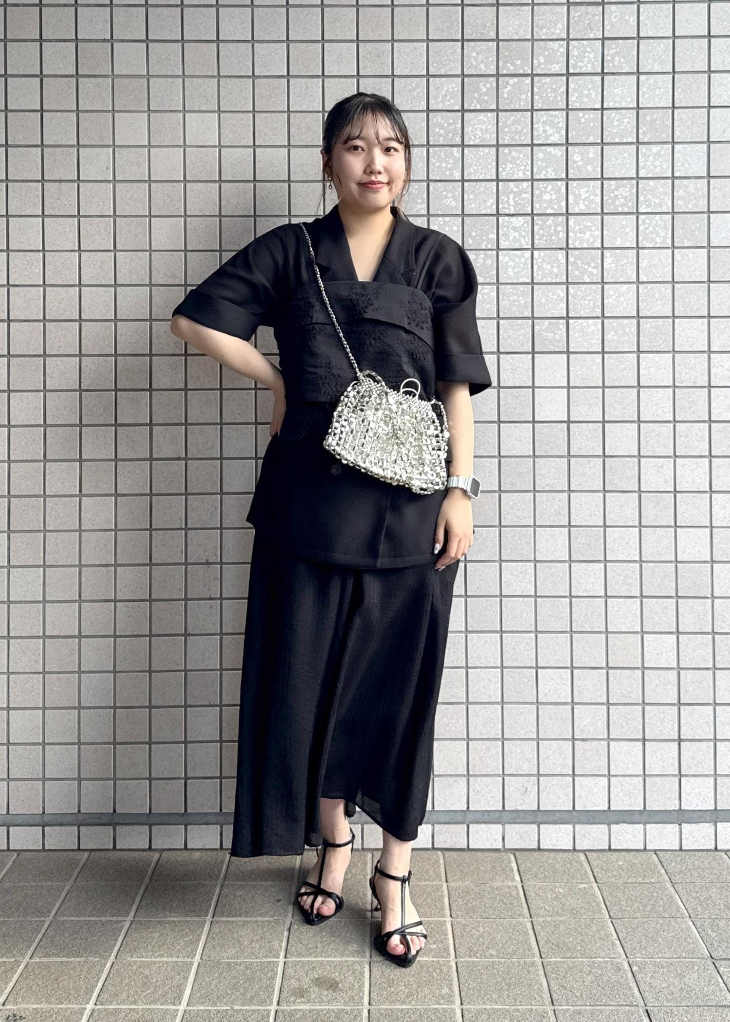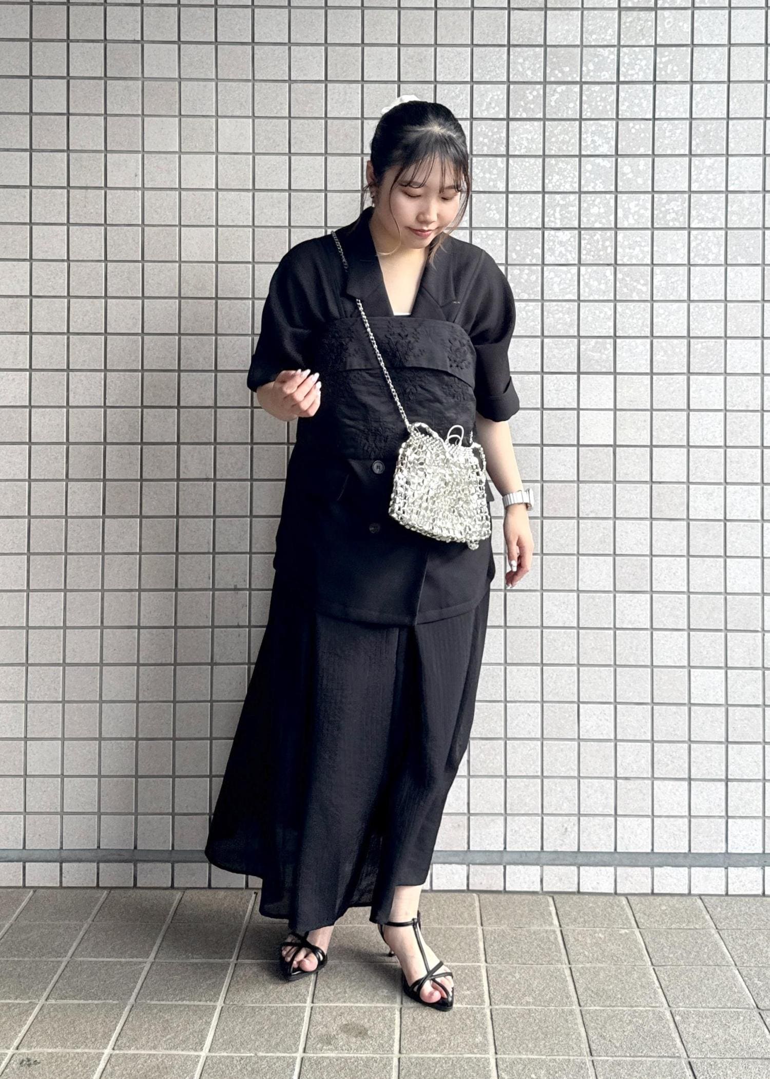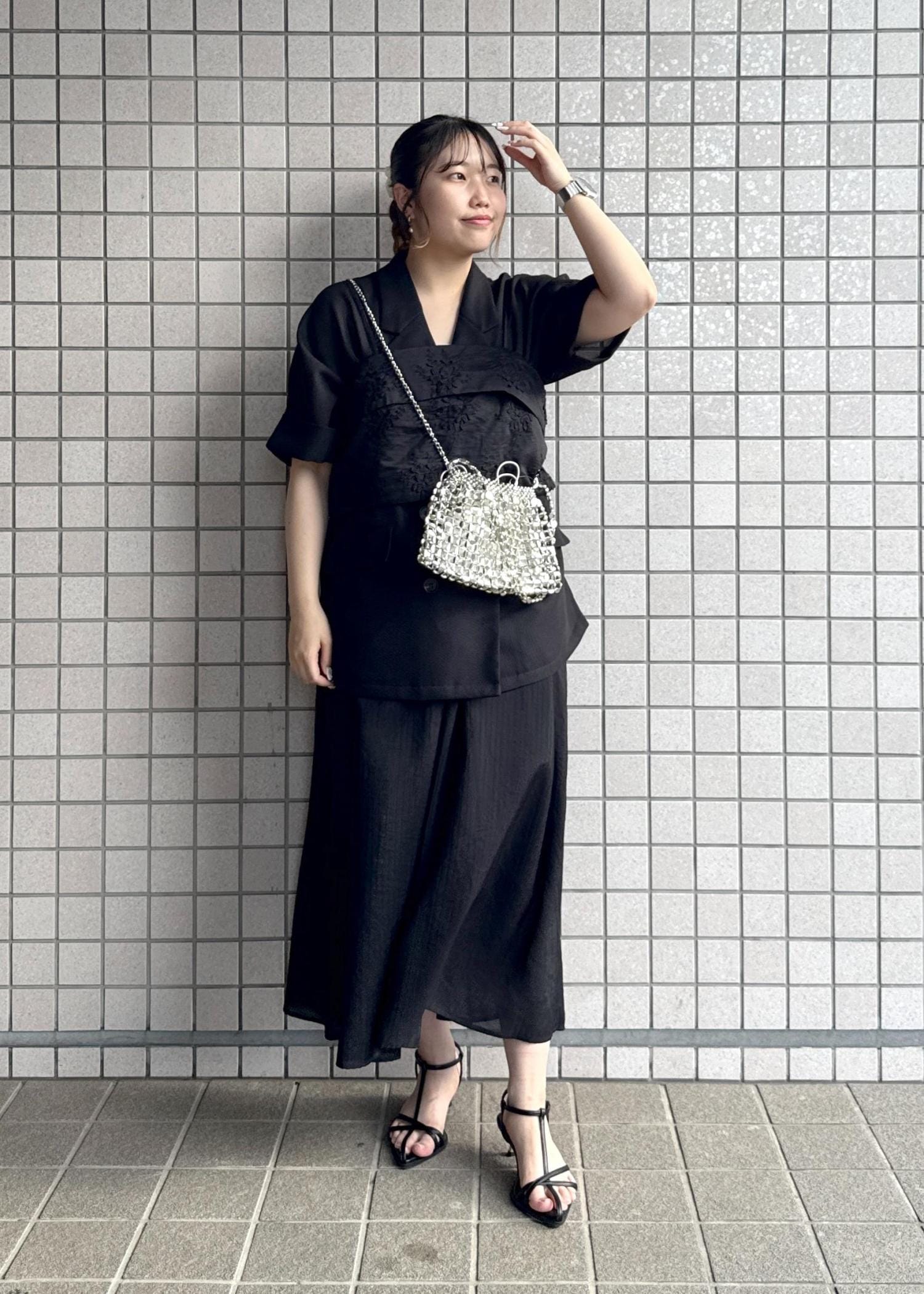 暗くて夏には重たい印象になりがちなブラックですが、メッシュジャケットや涼し気な印象のワンピースで合わせ、インナーはキャミソールで首元をスッキリ見せました。