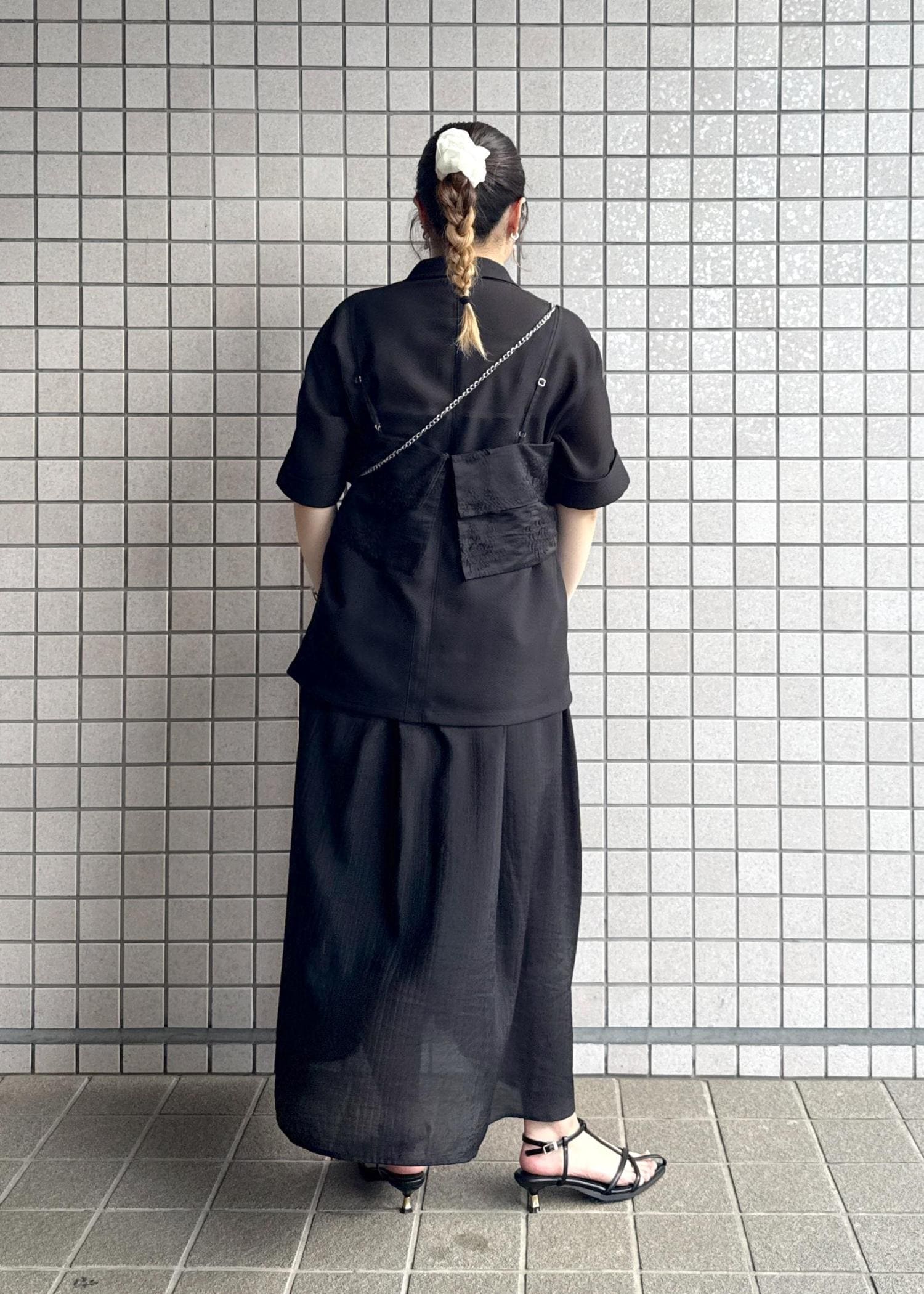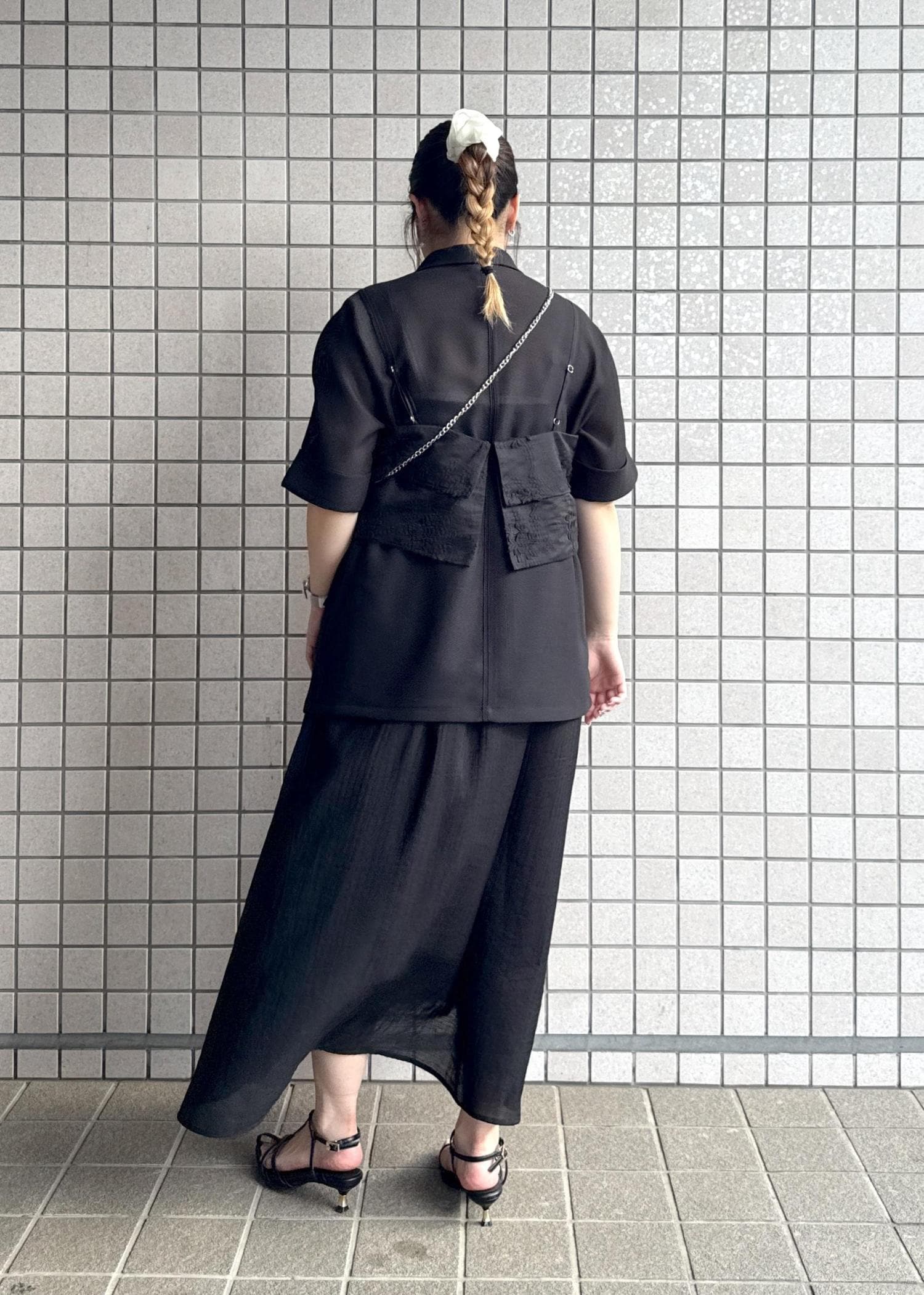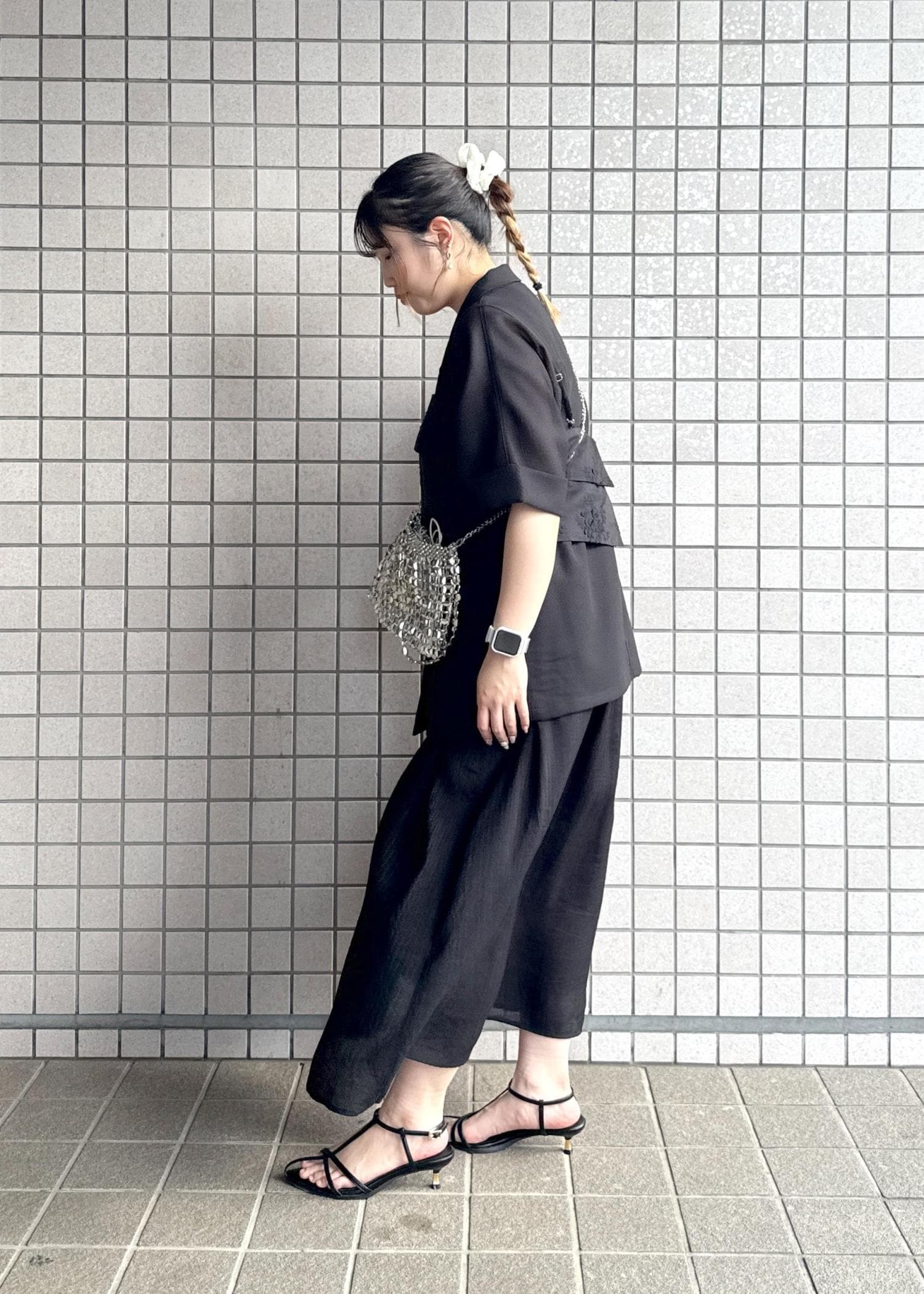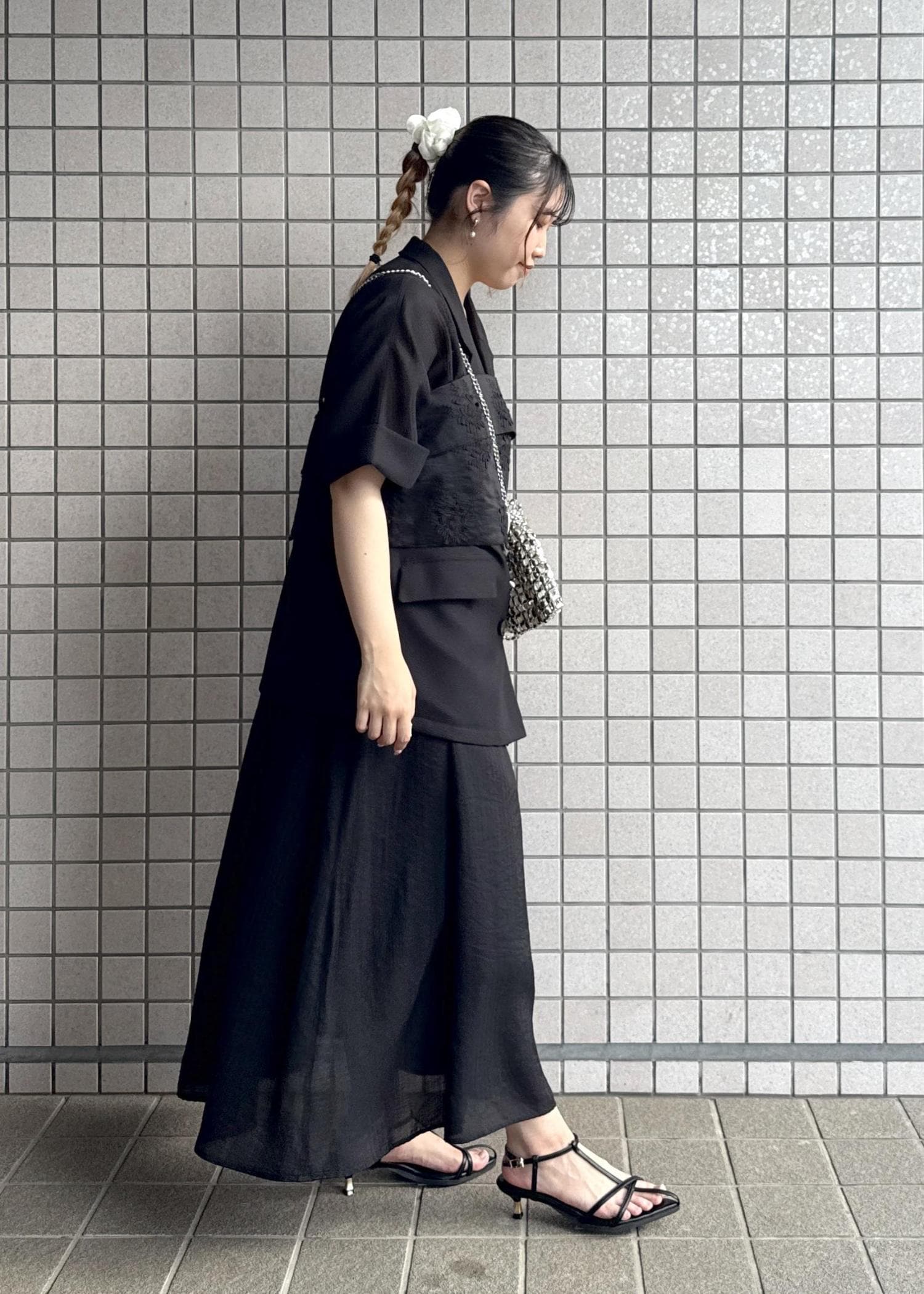 暗くて夏には重たい印象になりがちなブラックですが、メッシュジャケットや涼し気な印象のワンピースで合わせ、インナーはキャミソールで首元をスッキリ見せました。