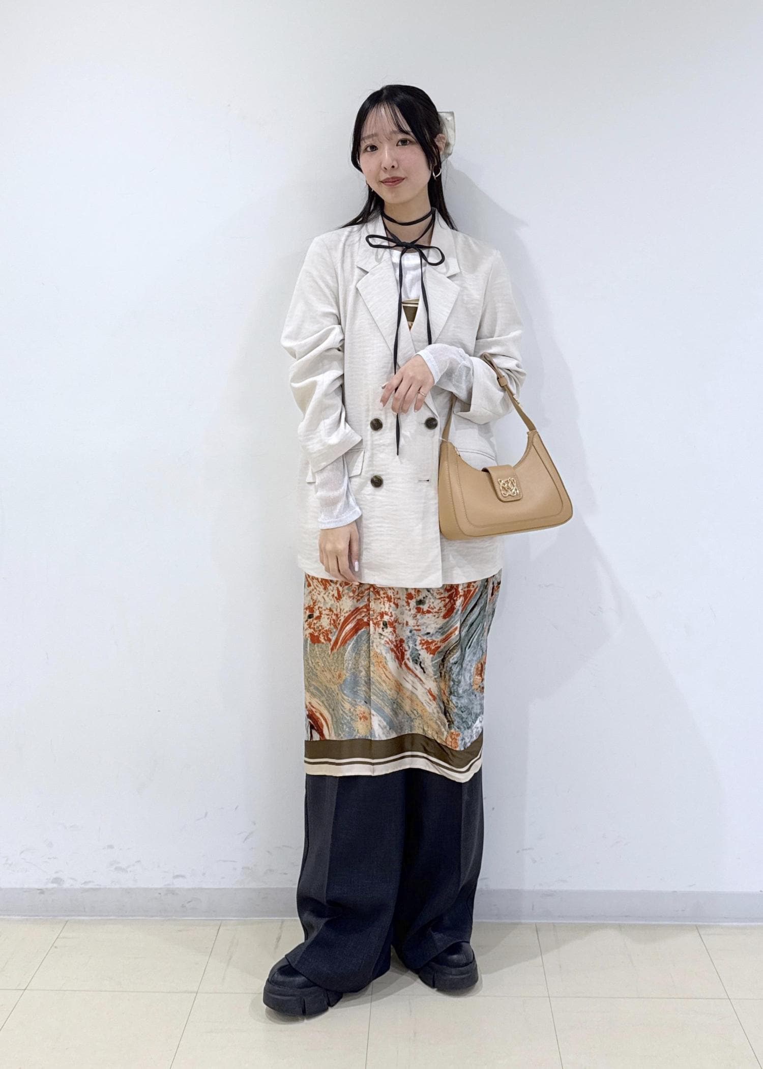 バッグにスカーフをつけて華やかさをプラス♡