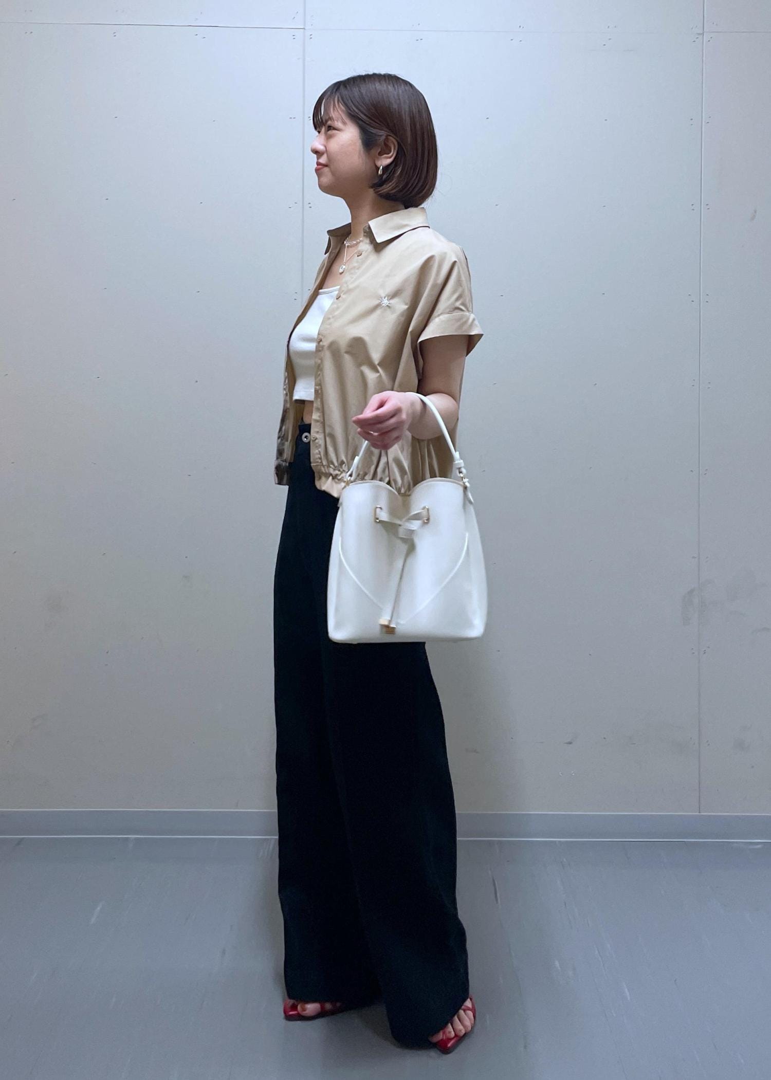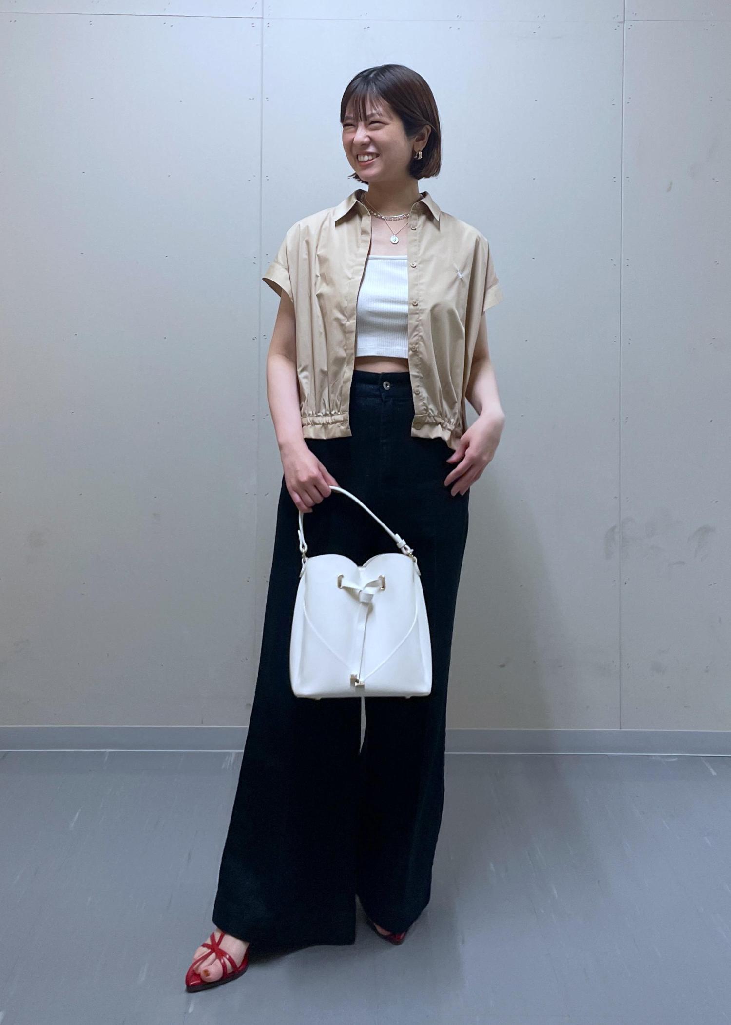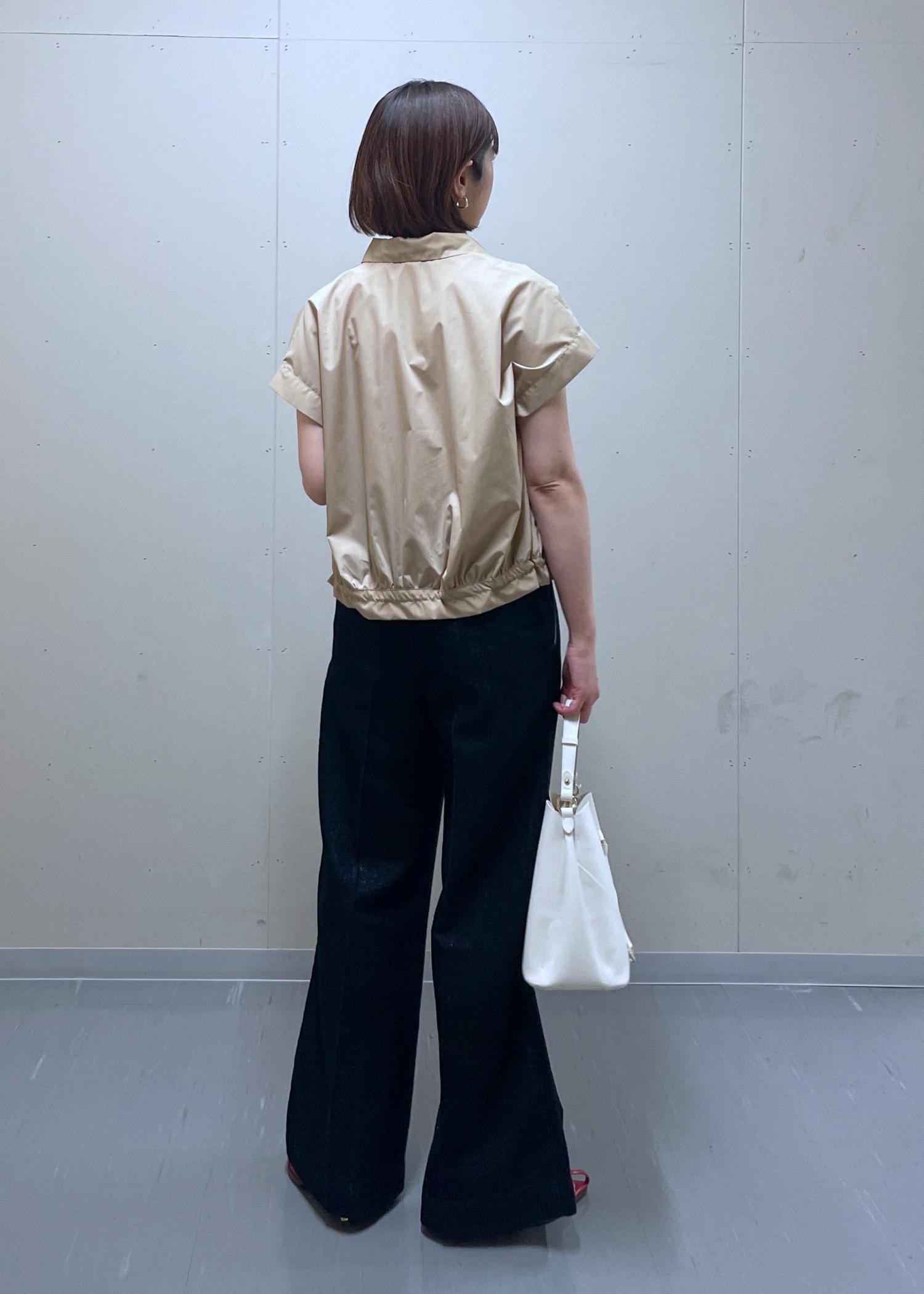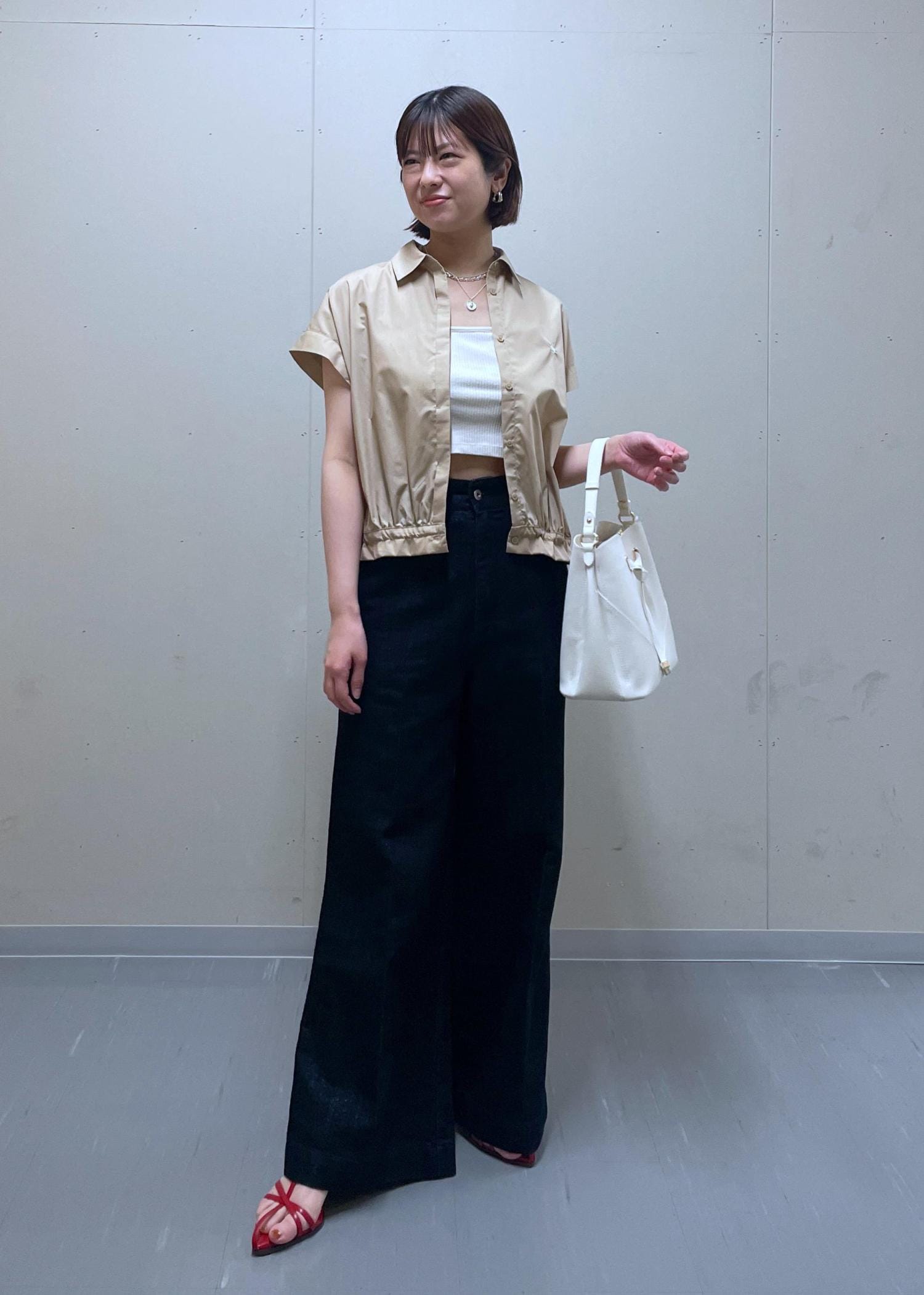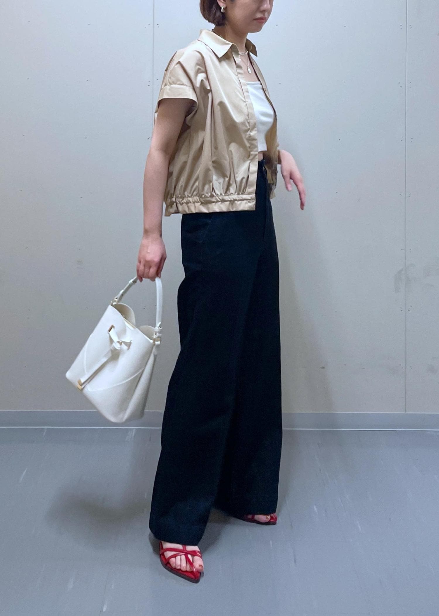 ハイウエストで履いてフラットシューズだと床にギリギリの着丈なので、ヒール合わせの方が裾を気にせず履けます。