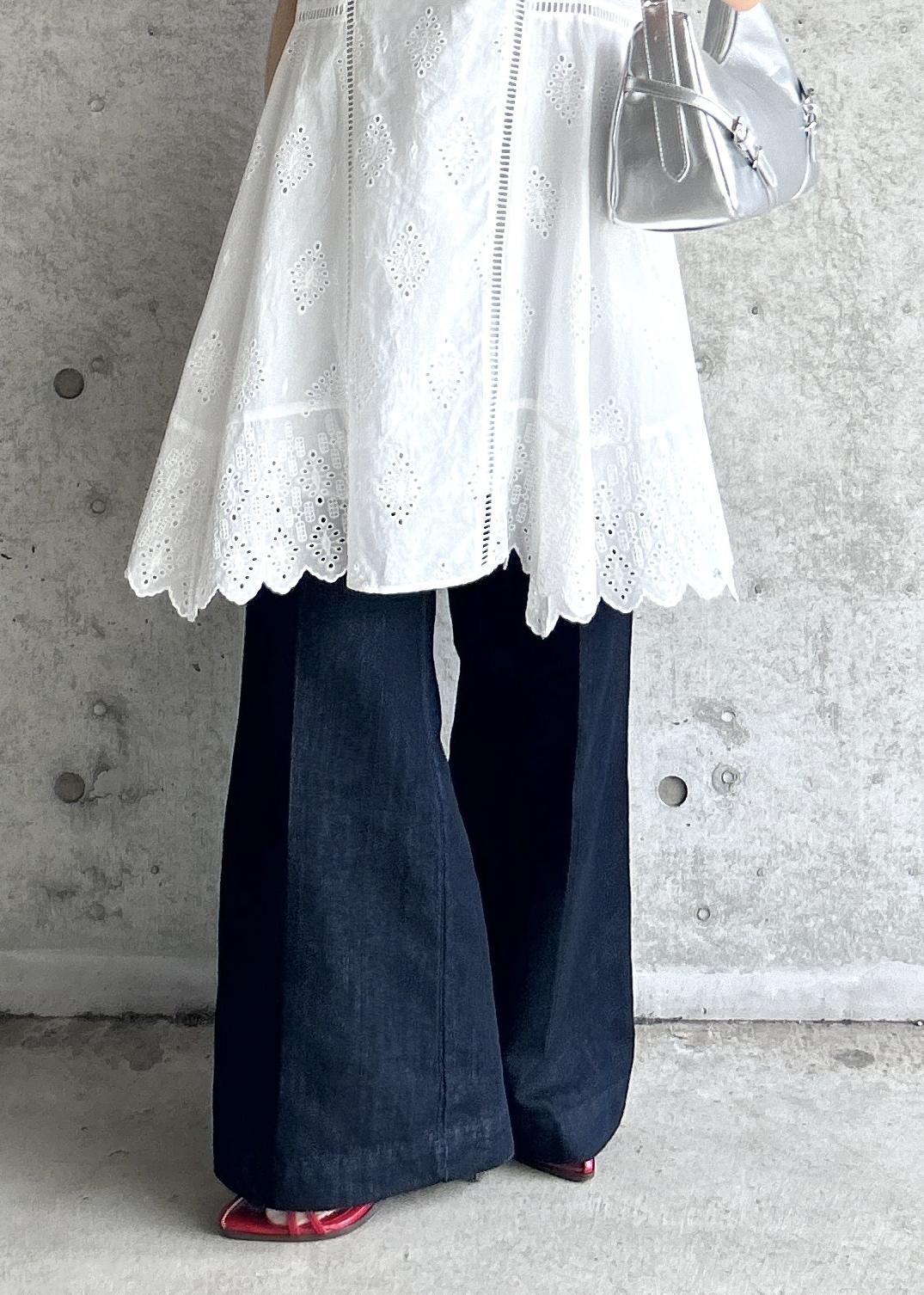 着丈はフラットシューズでジャストなので、他のデニムと比べると少し長めに感じました。