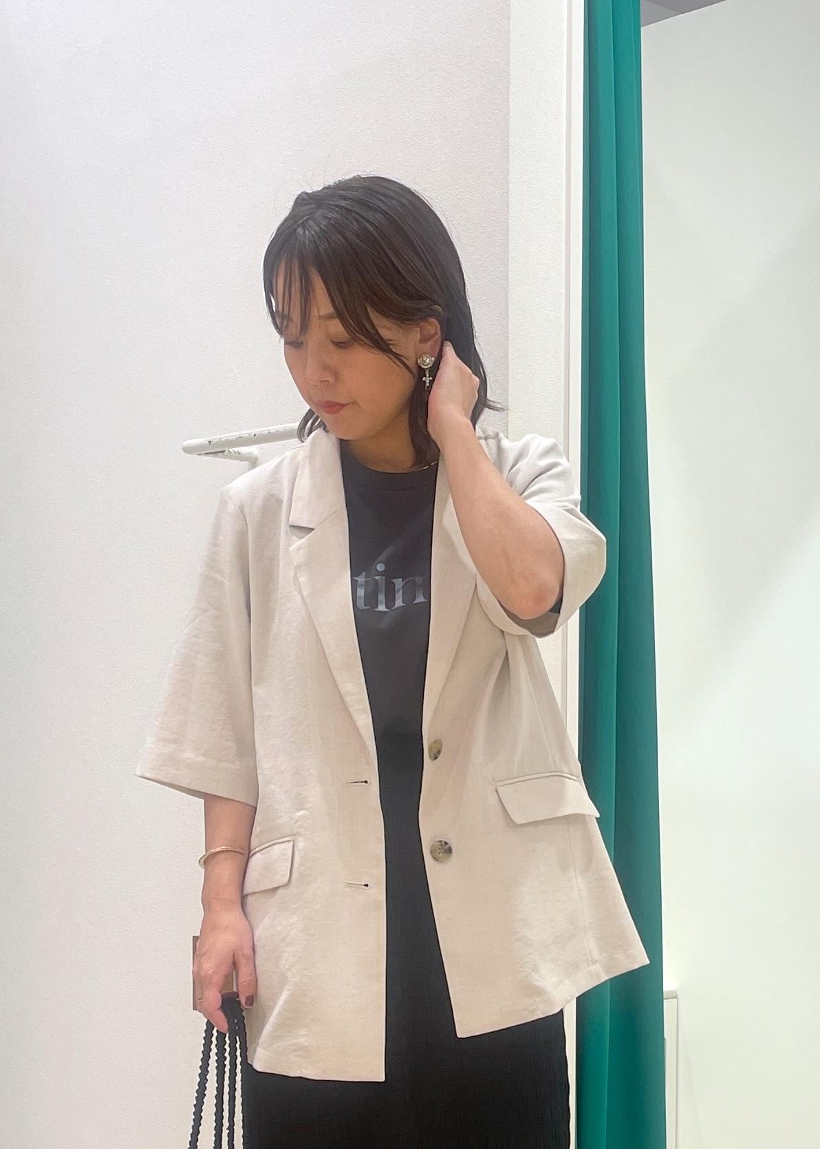 トップスはゆったりしたシルエットのアイテムがおすすめですが、コンパクトなTシャツも女っぽくマッチ