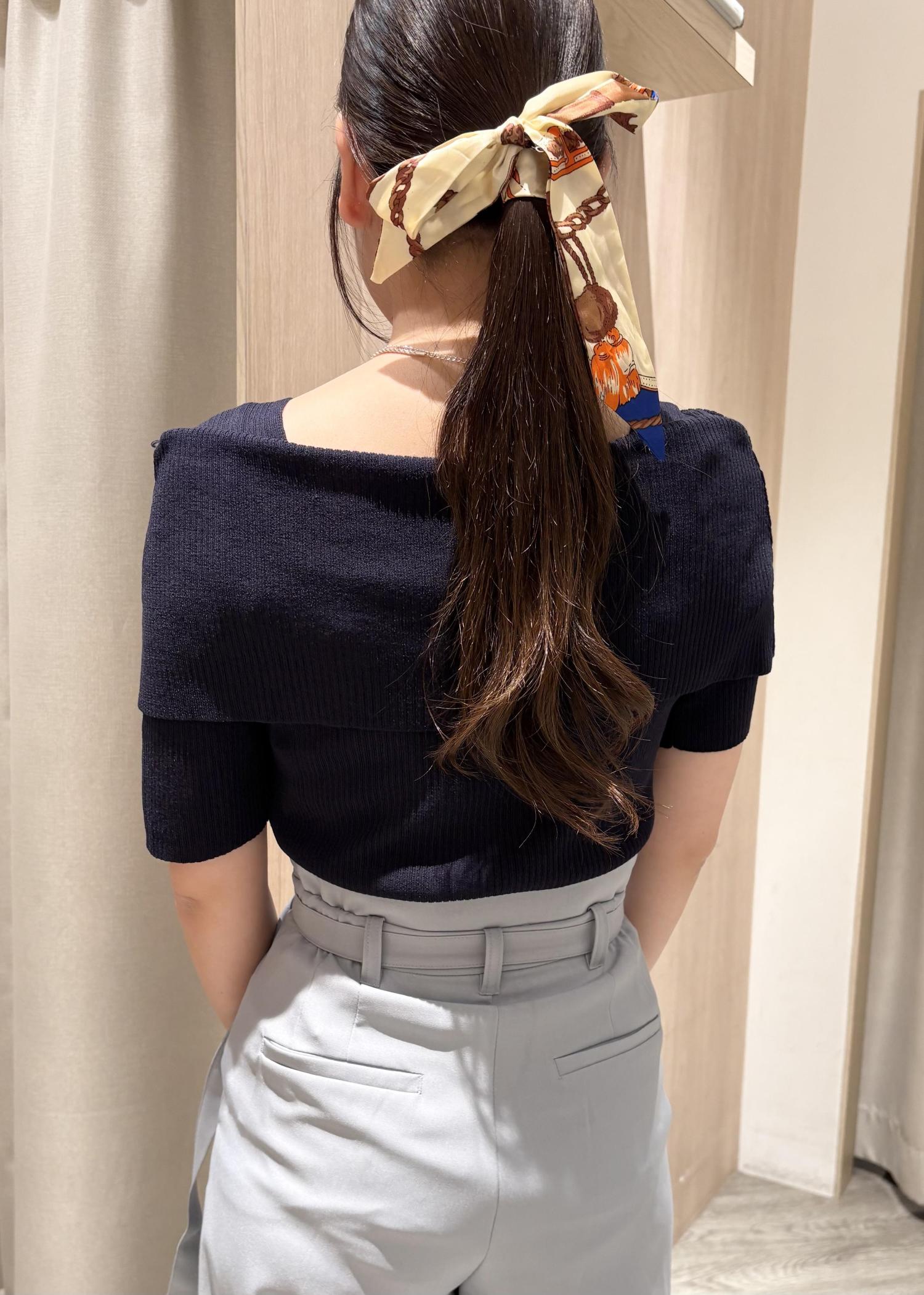 VIS【アンチピリング/UVケア/洗える】オフショルハーフスリーブニットネイビー / F¥4,939レビューオフショル風デザインになってます!肩紐はマチで隠れるので、気にせず着用できますよ。