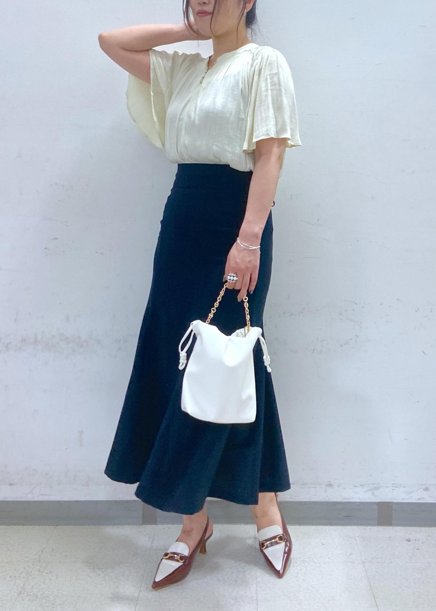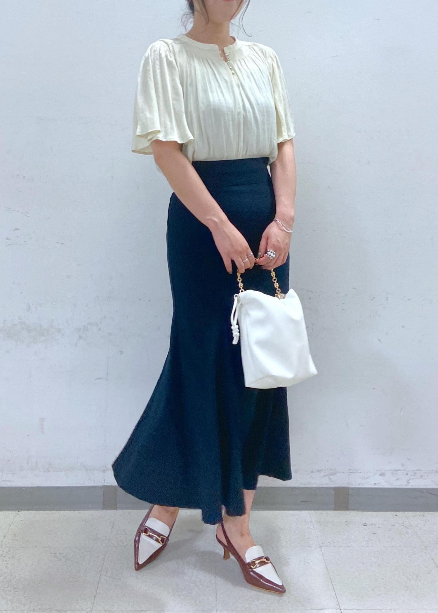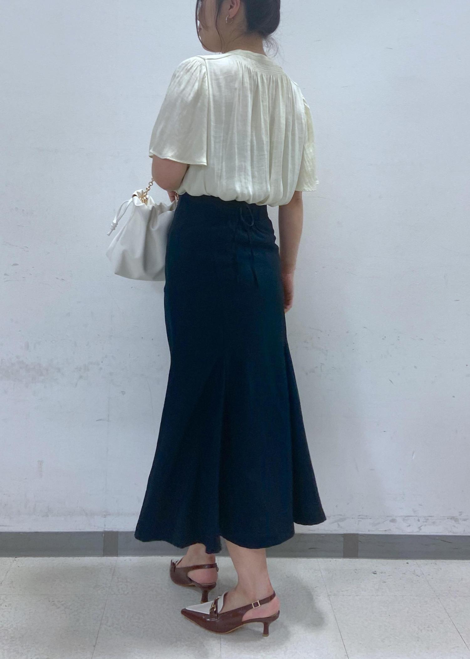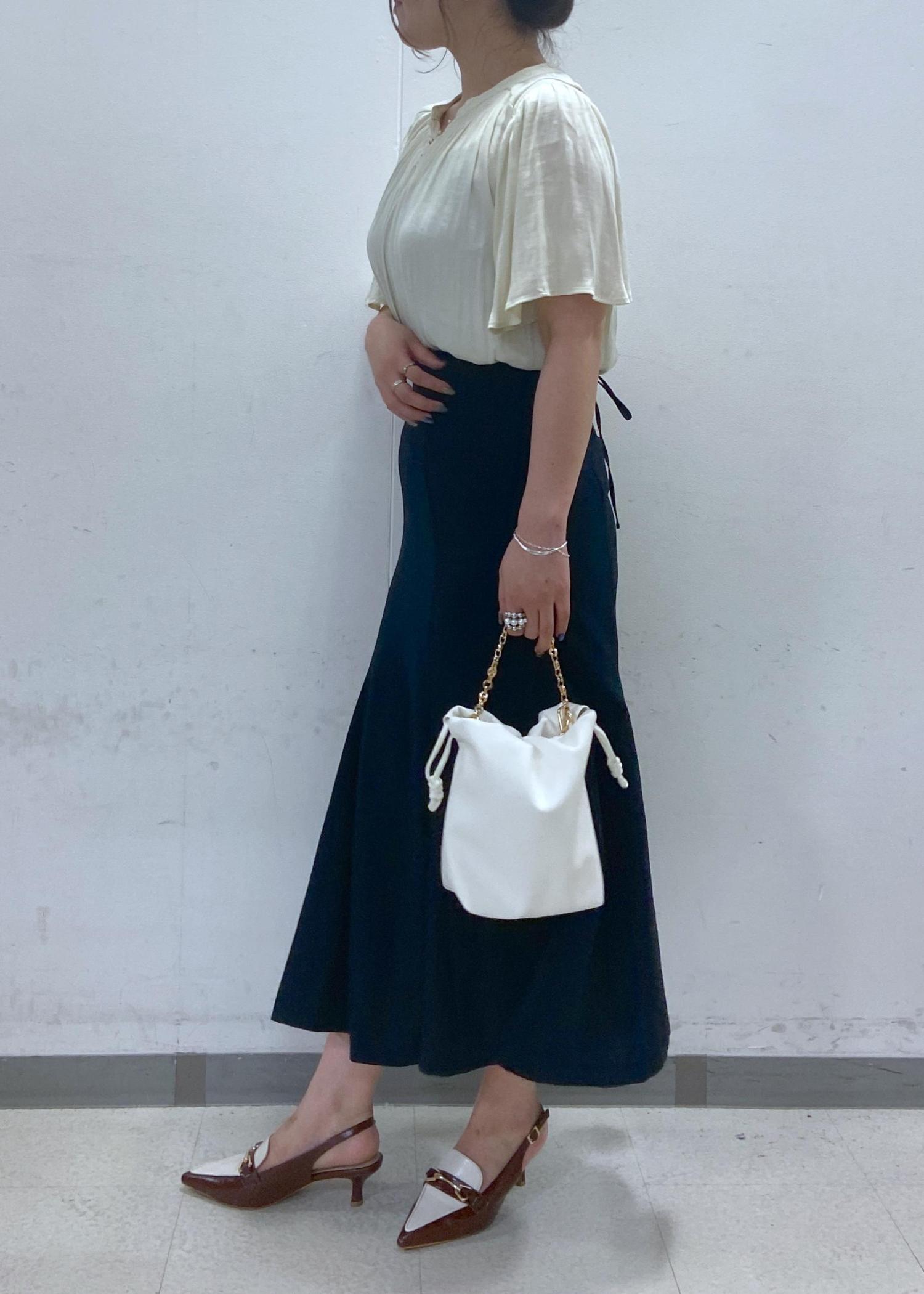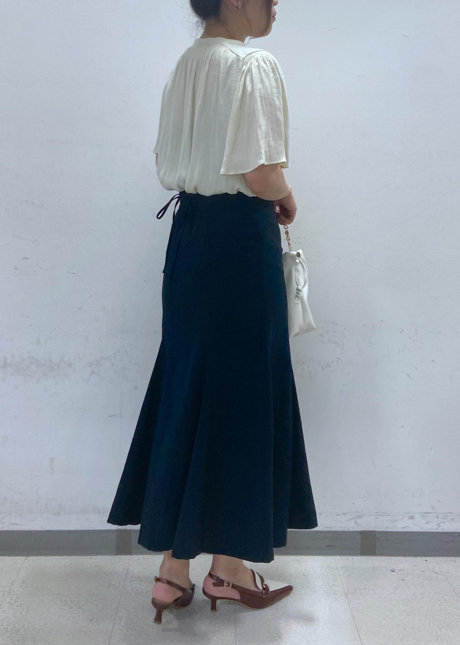 私は骨格ストレートなので、腰回りは程良くフィットしますが、ボディラインは拾い過ぎないシルエットです。