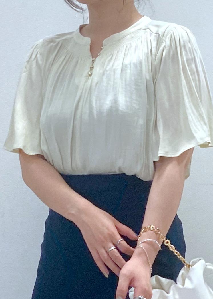 私は骨格ストレートなので、ボタンは全て閉めず2つほど空ける事で顔周りをスッキリするように着ました。 -