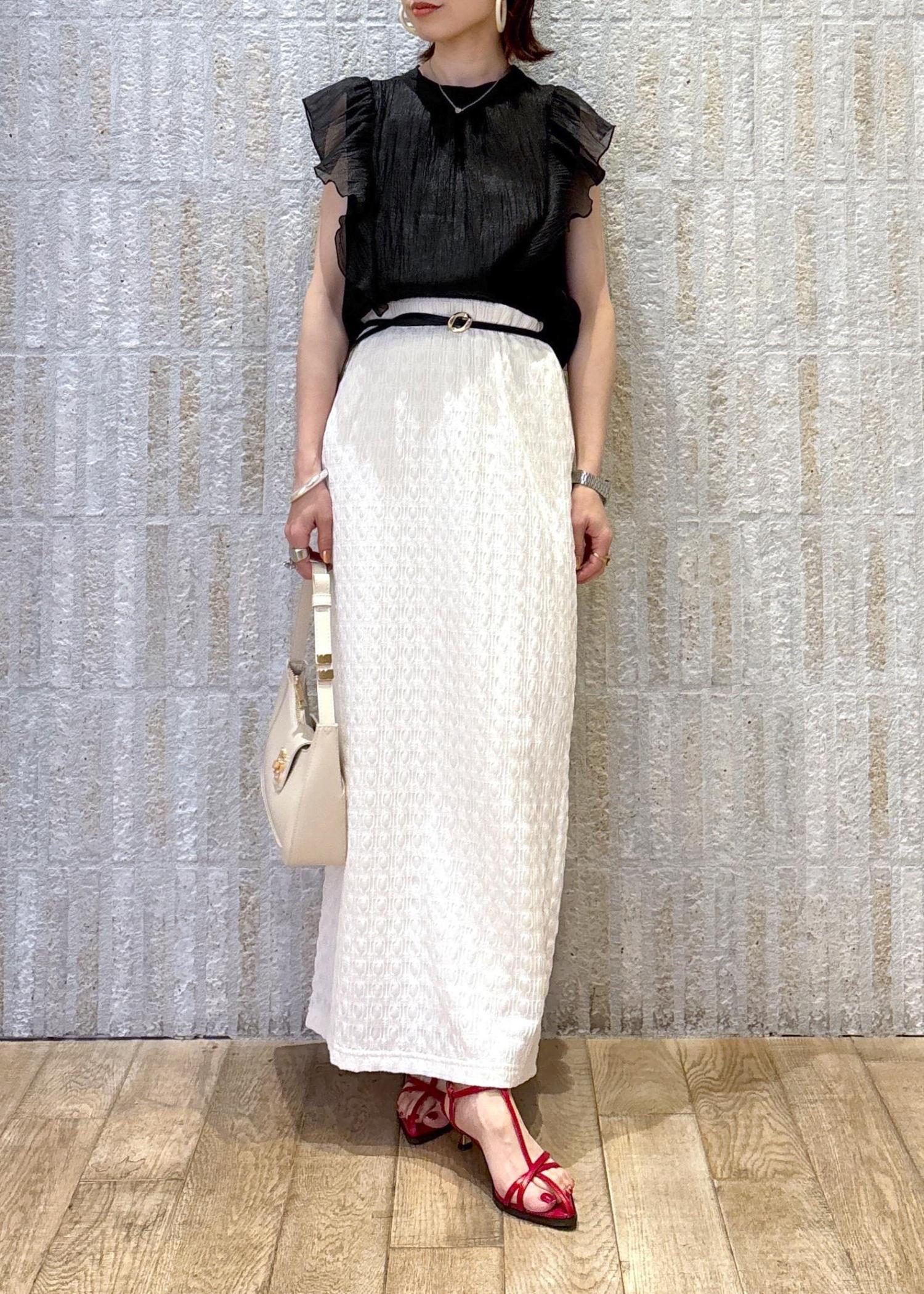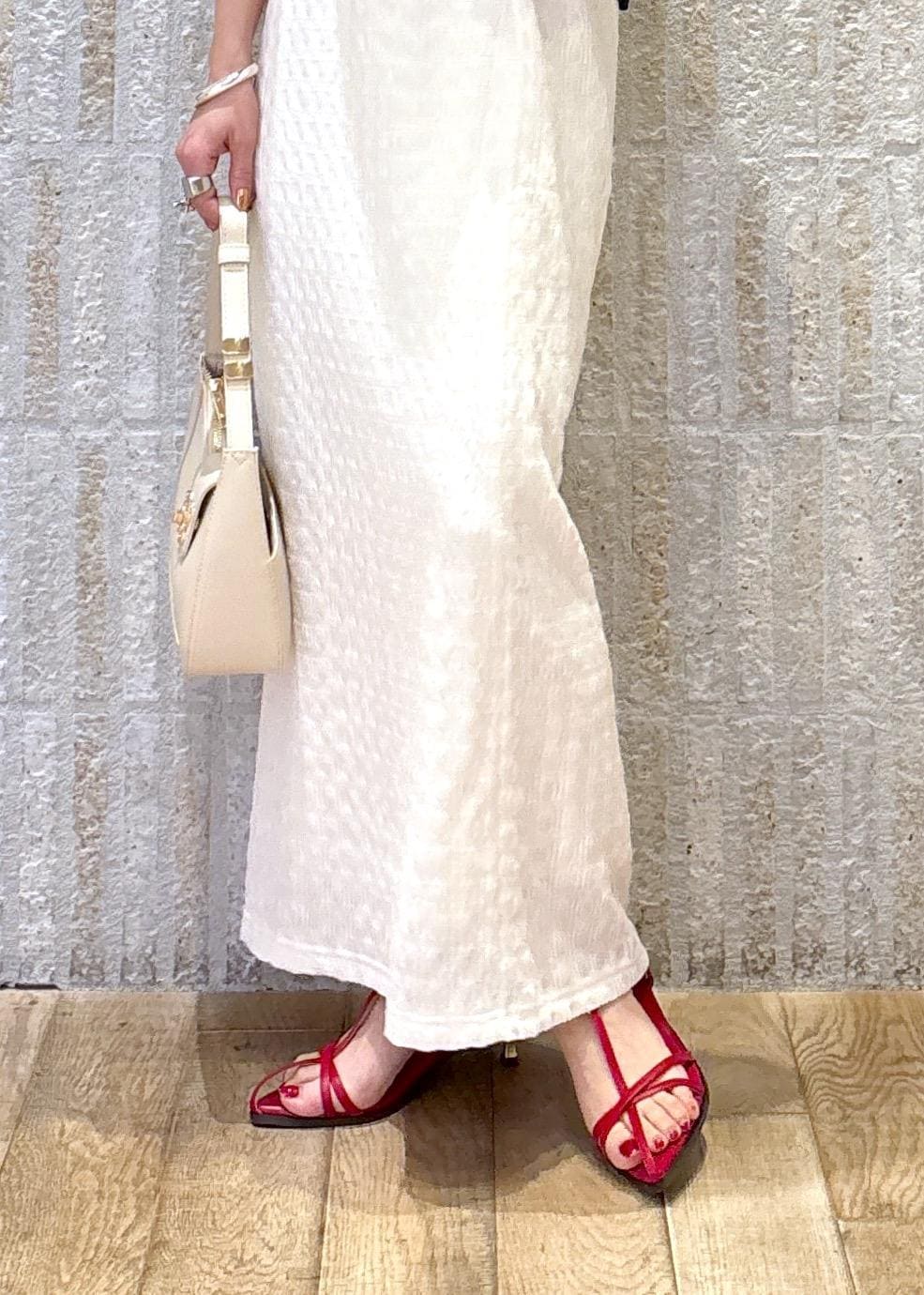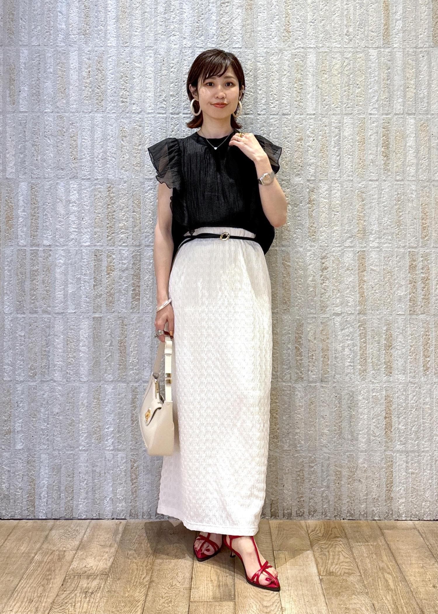 今回は白のタイトスカートとヒールサンダルできれいめカジュアルスタイルにまとめました。