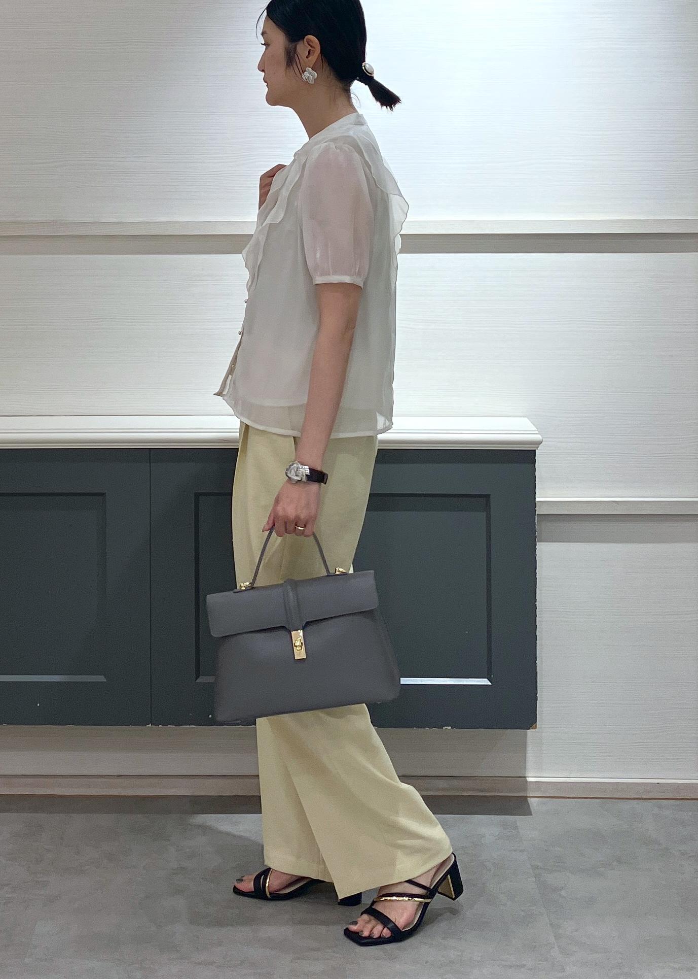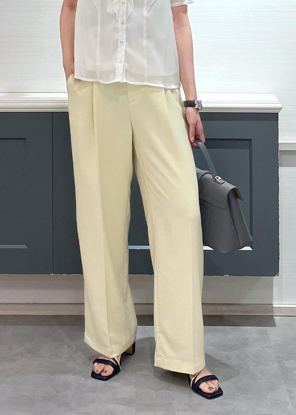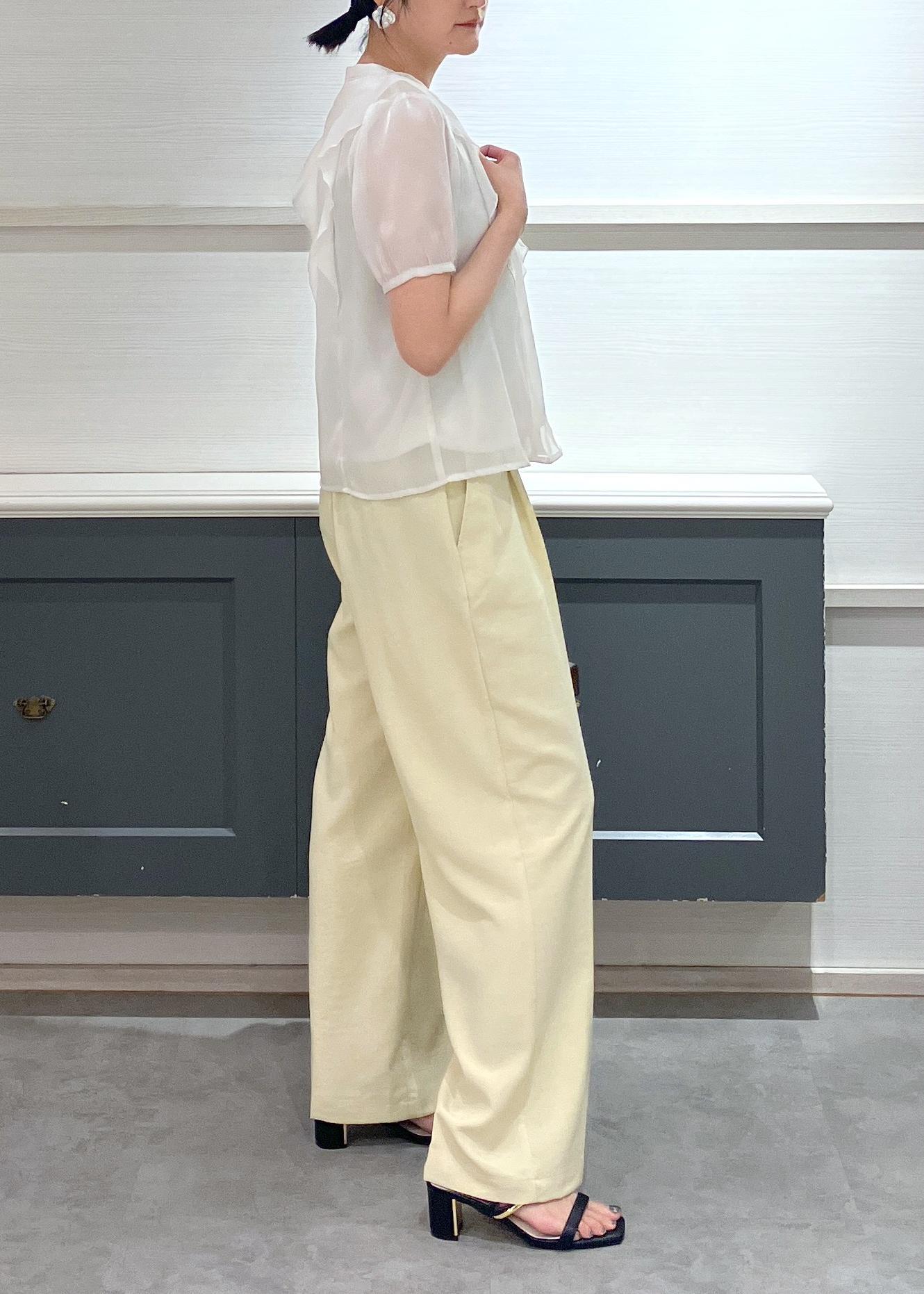 白のフリルブラウスをあえてインせずアウトで着用し、けれどキチンと見えるように美easyの新色パンツを合わせたニューワークスタイルにしました♩