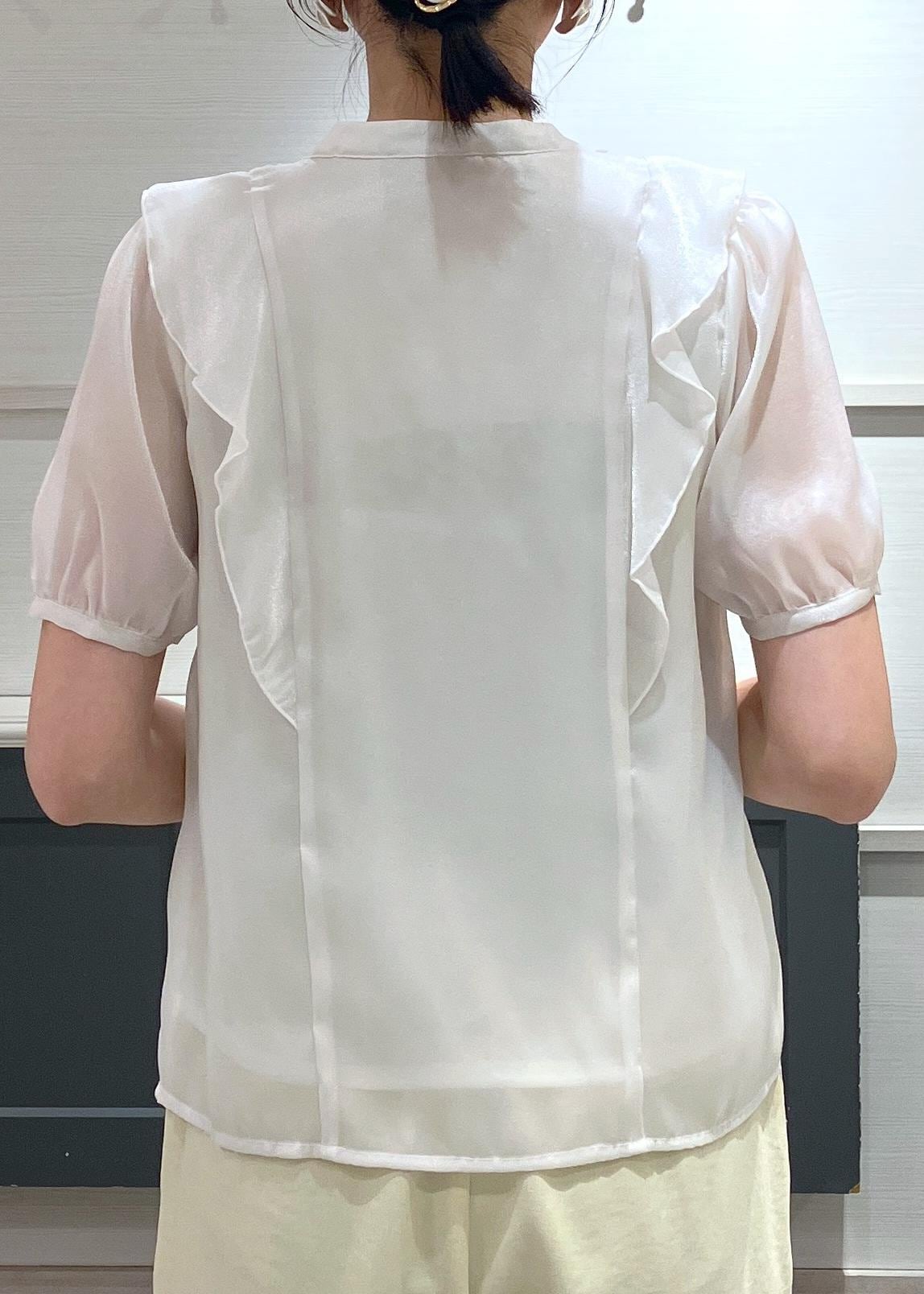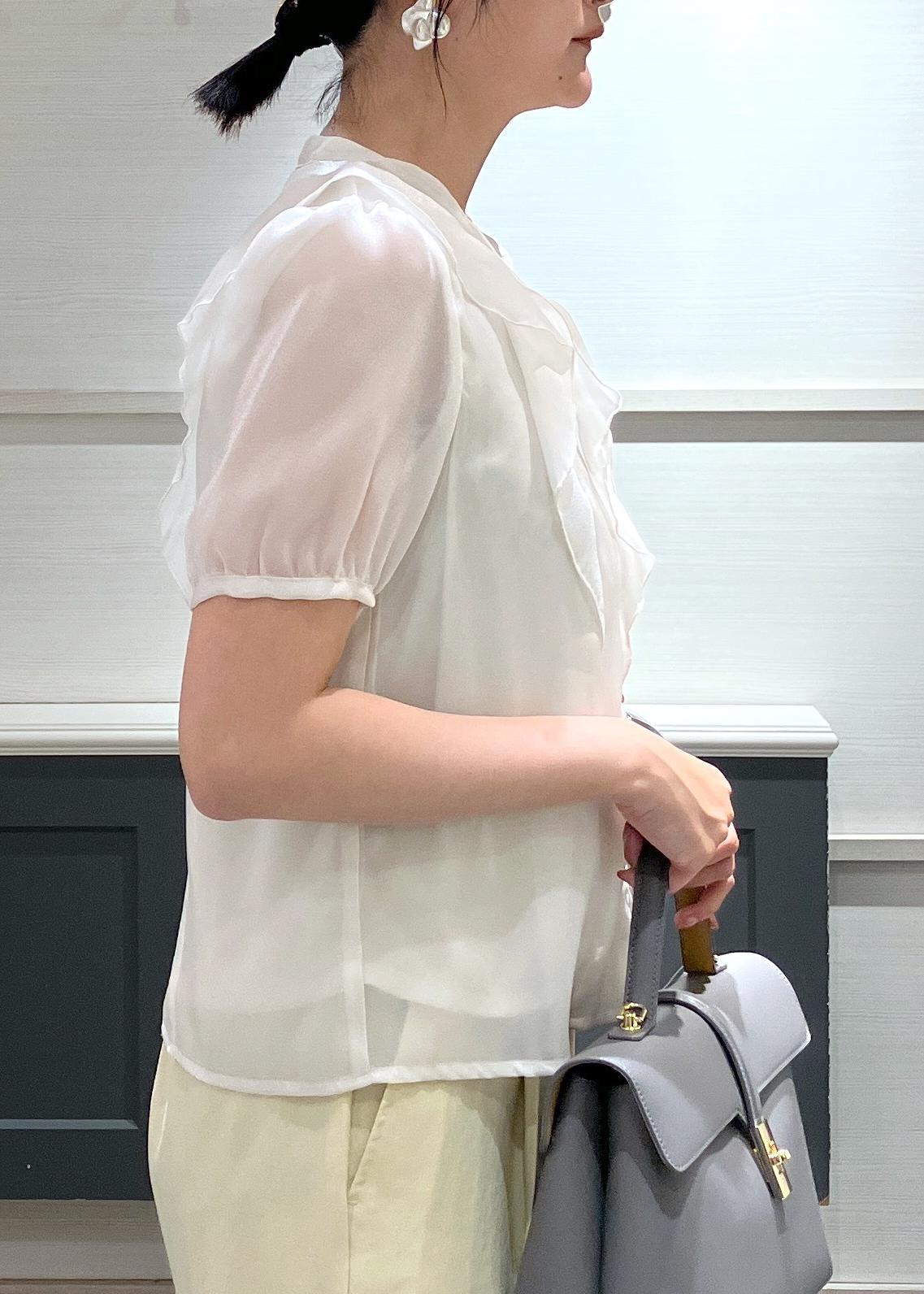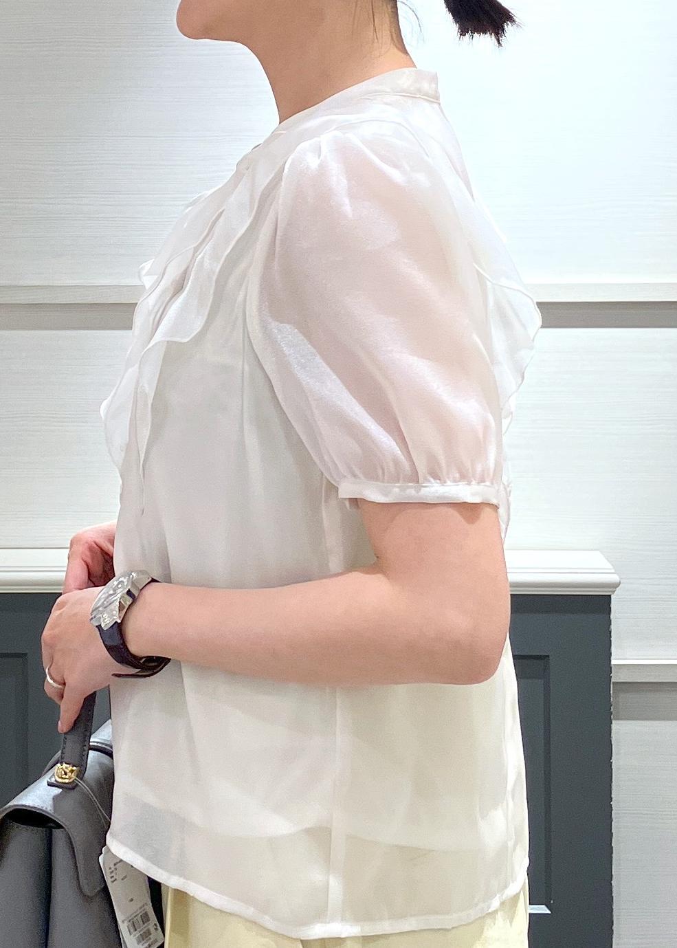 白のフリルブラウスをあえてインせずアウトで着用し、けれどキチンと見えるように美easyの新色パンツを合わせたニューワークスタイルにしました♩