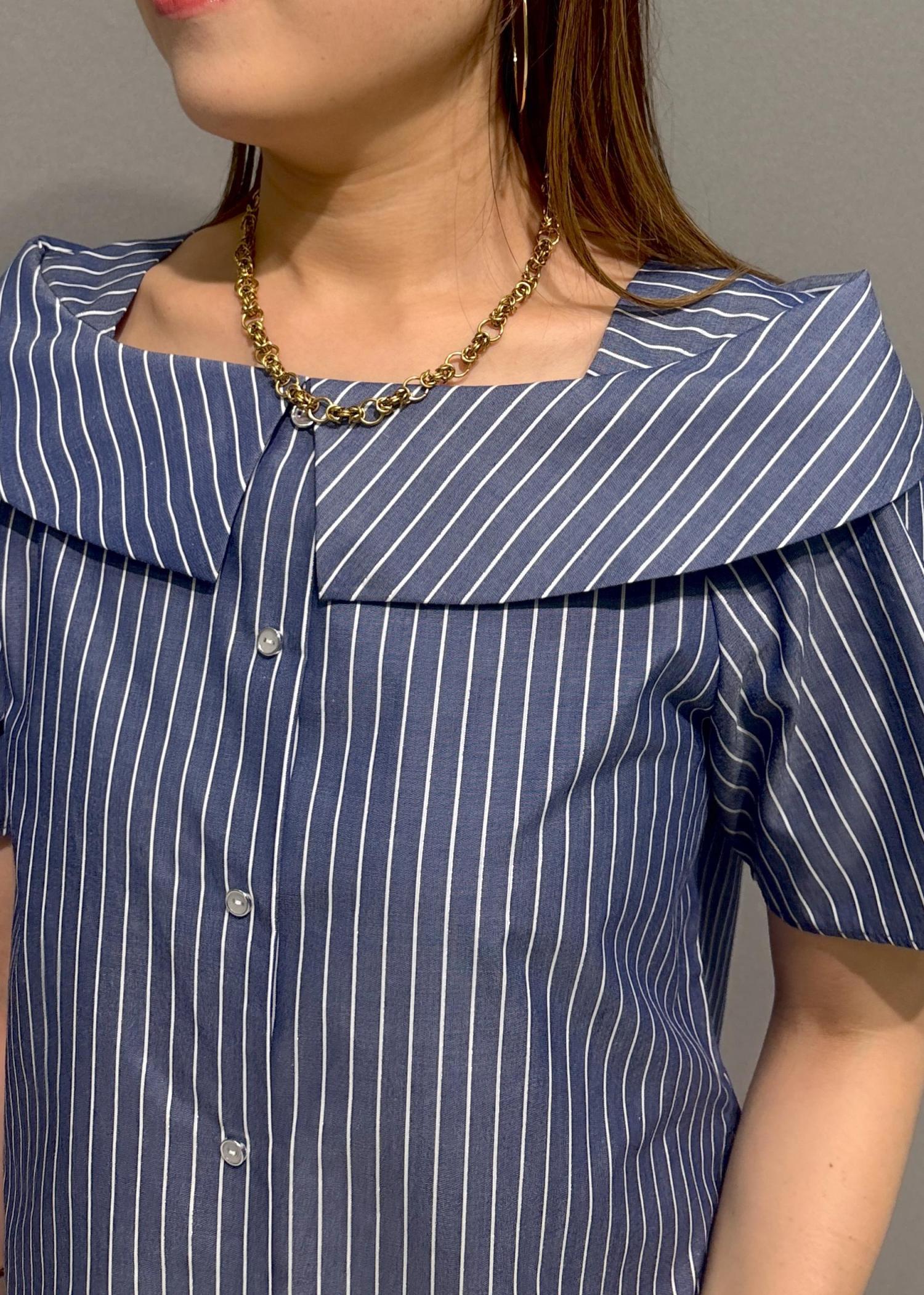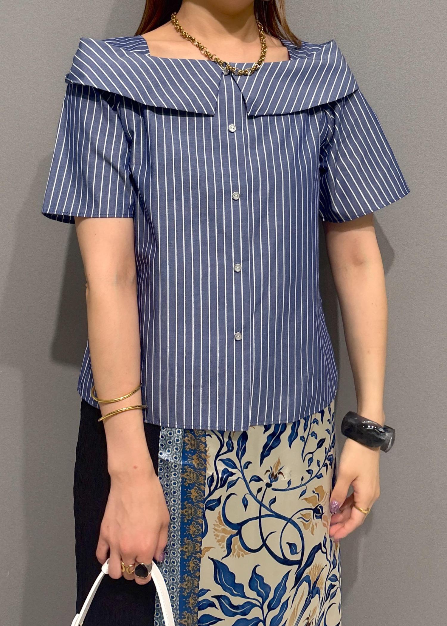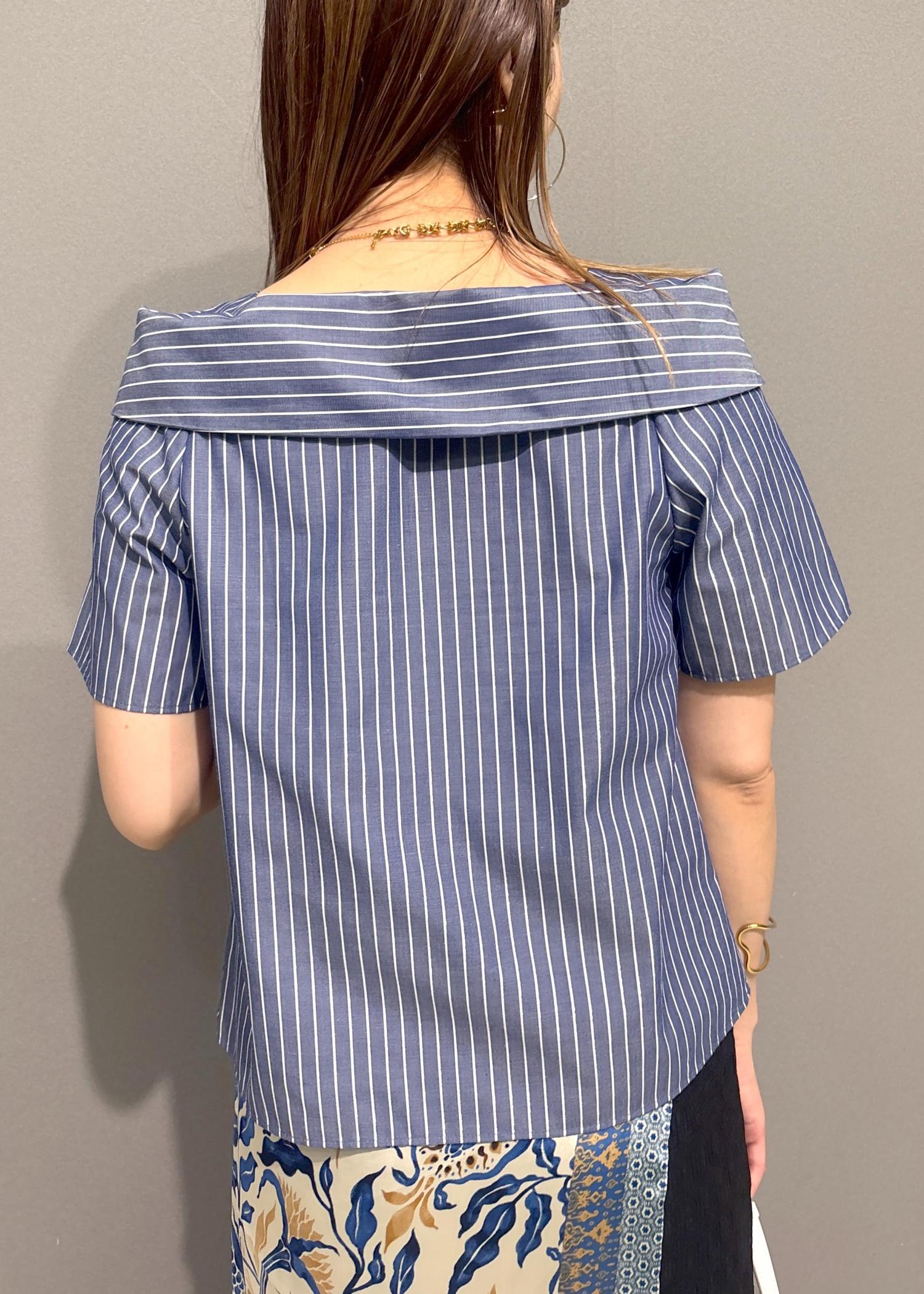 VIS【新色追加】【防シワ】ラメミックスオフショルダー風ストライプシャツブルー系 / F¥5,489レビュー張り感のあるシャツです。