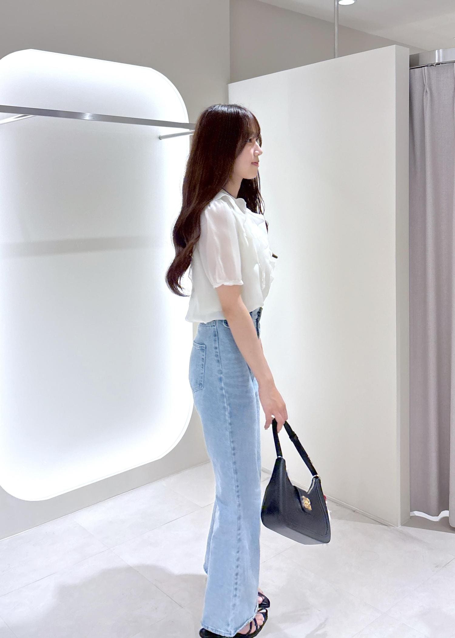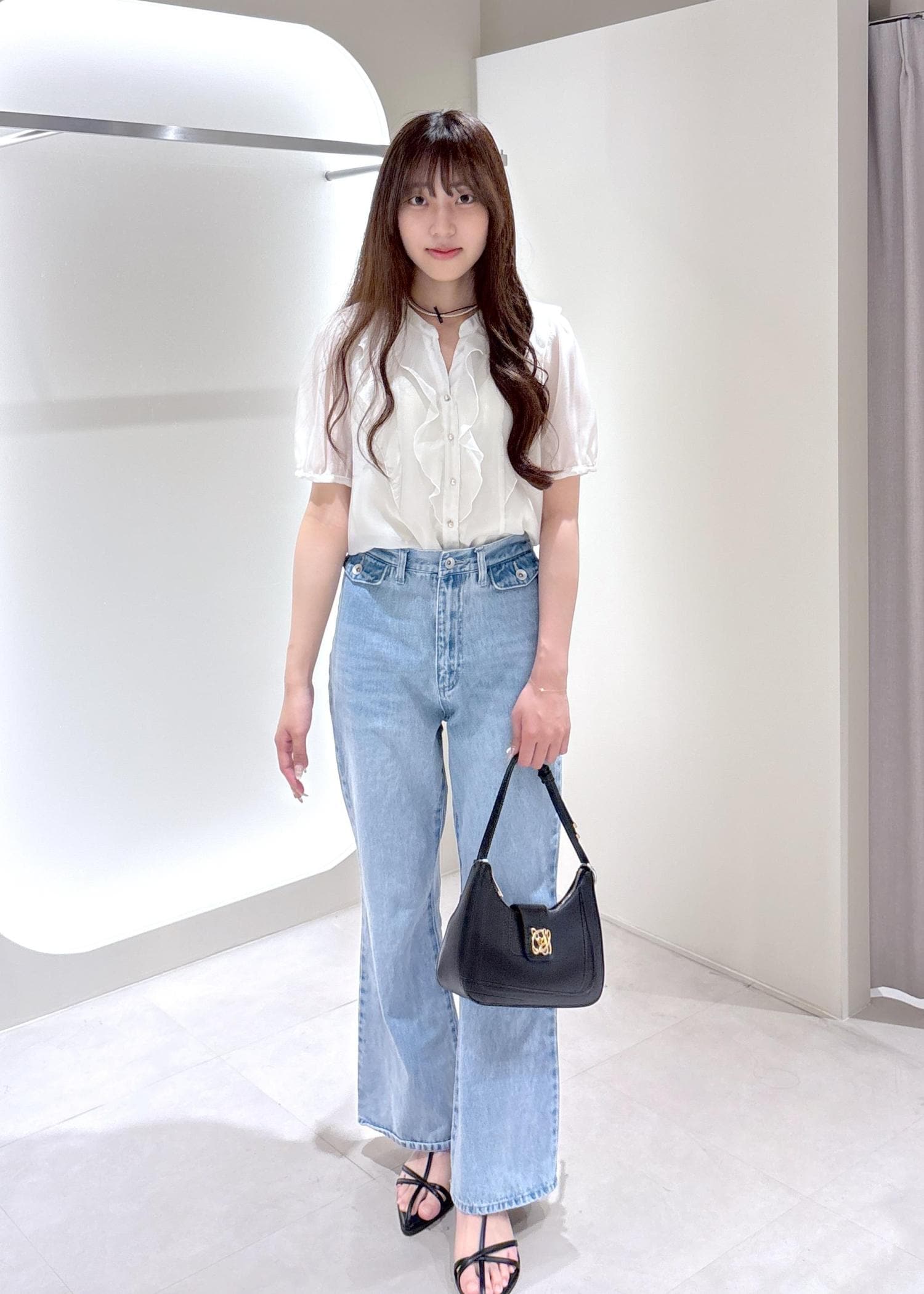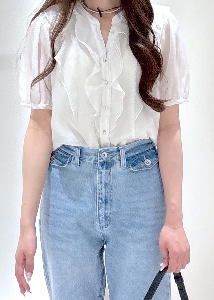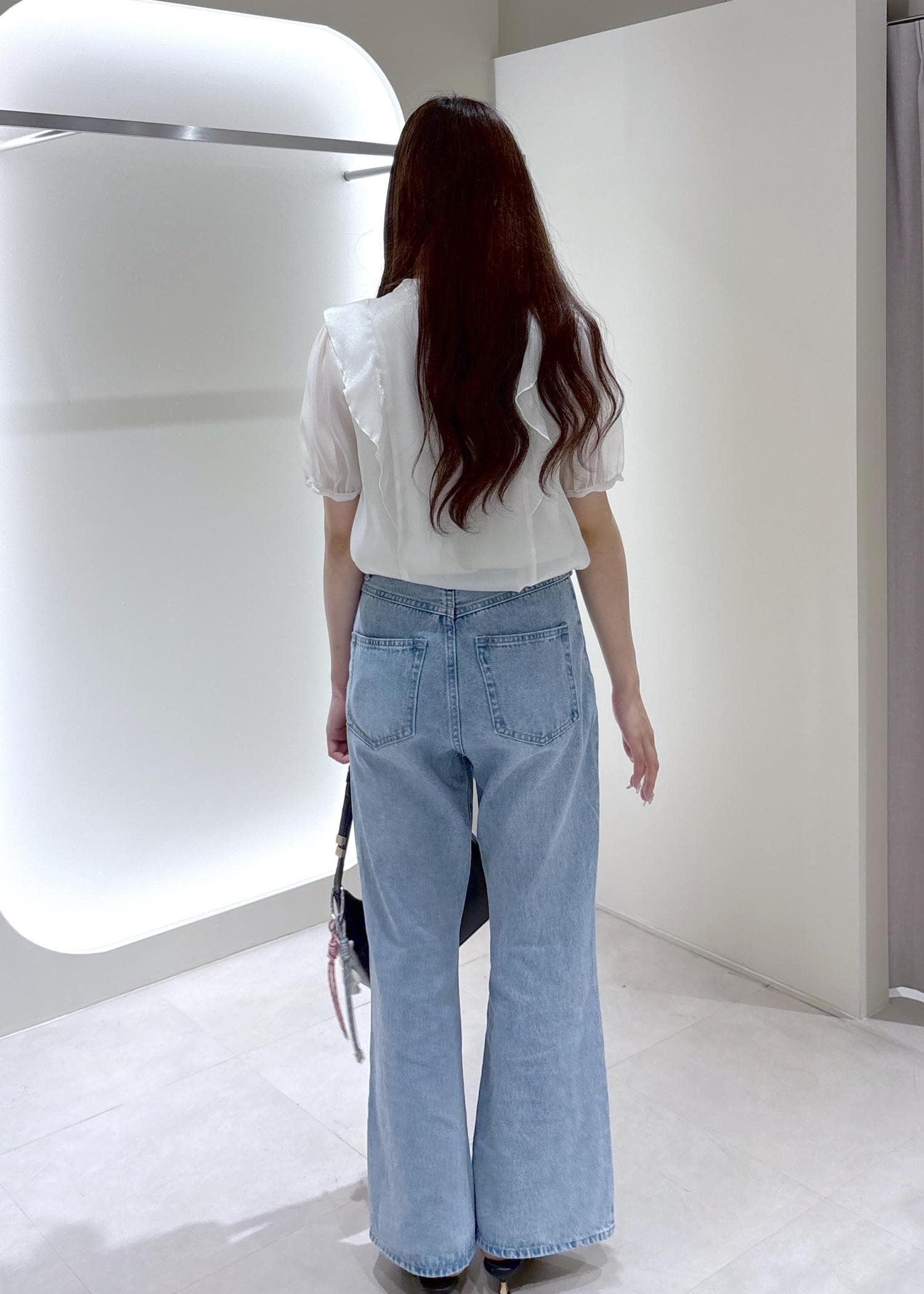 アウトレットVIS【洗える】シアーラッフルフリル半袖ブラウスキナリ / F¥4,391レビュー身長155cmで腰が隠れるくらいの丈感です。真ん中の部分がフリルになっているのでシンプルすぎず少し甘めなコーデになります。