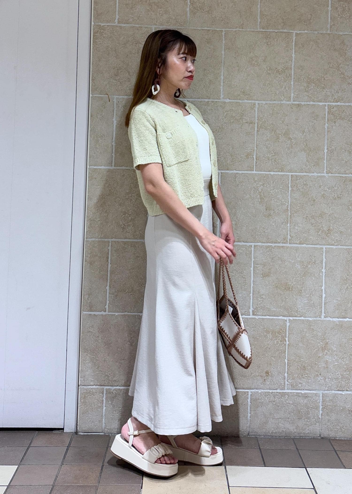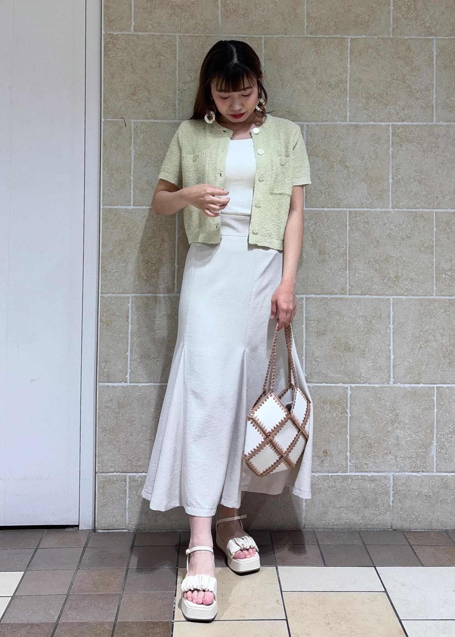 夏らしいライトグリーンのカーディガンに