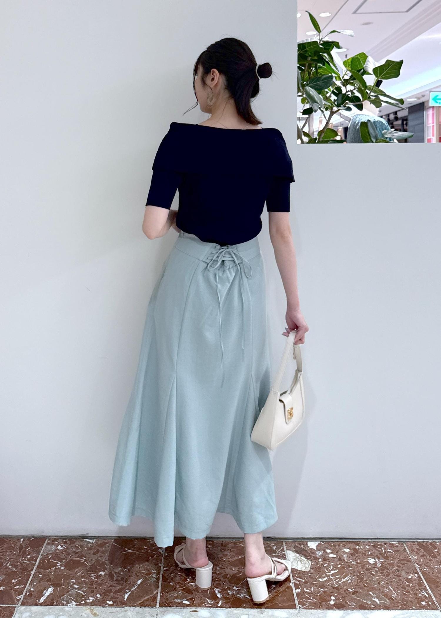 ハイウエストのバックレースアップがポイントで、ウエストが自由に調整できて、薄手のニットやTシャツはインできます◎ -