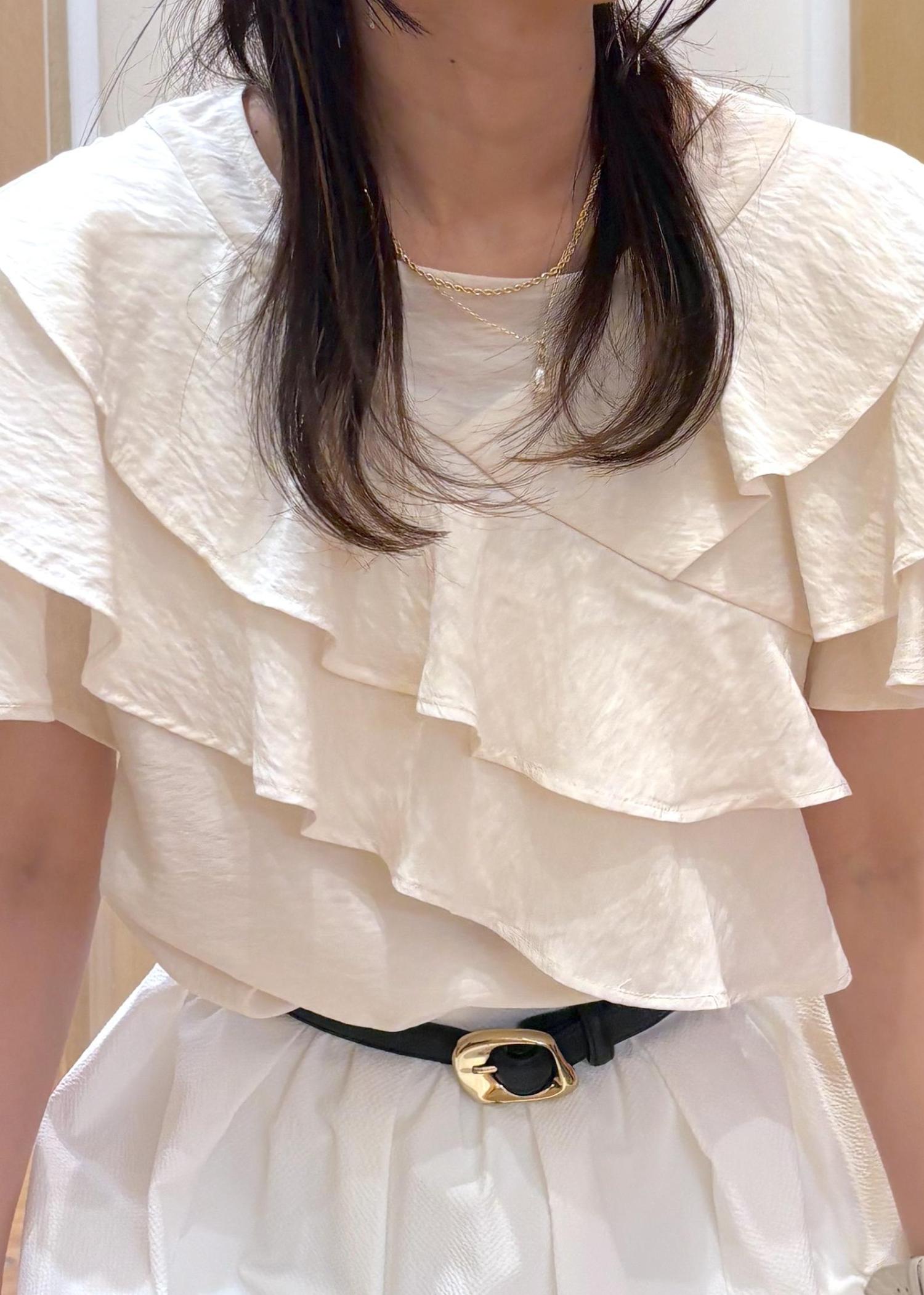 袖の開きはありますが、ティアードがたくさんなのと、袖の長さがしっかりあるので肩や脇が露出しすぎないのも良いです! -