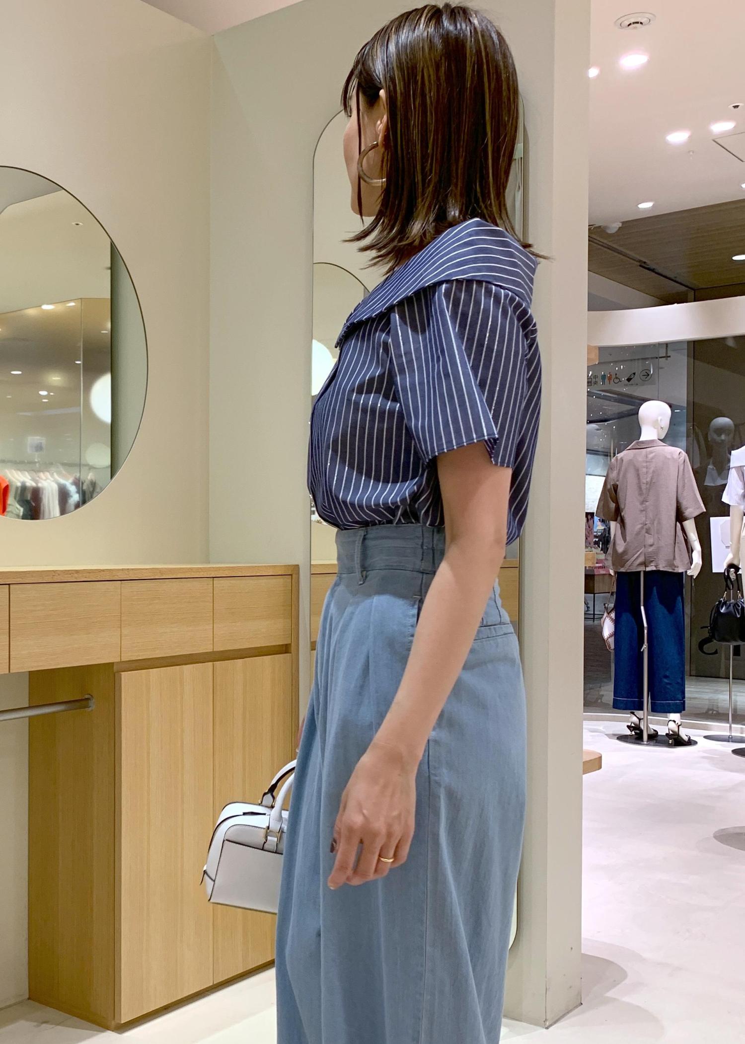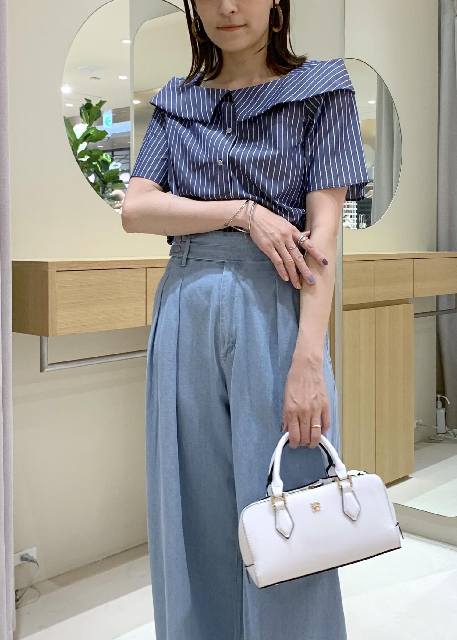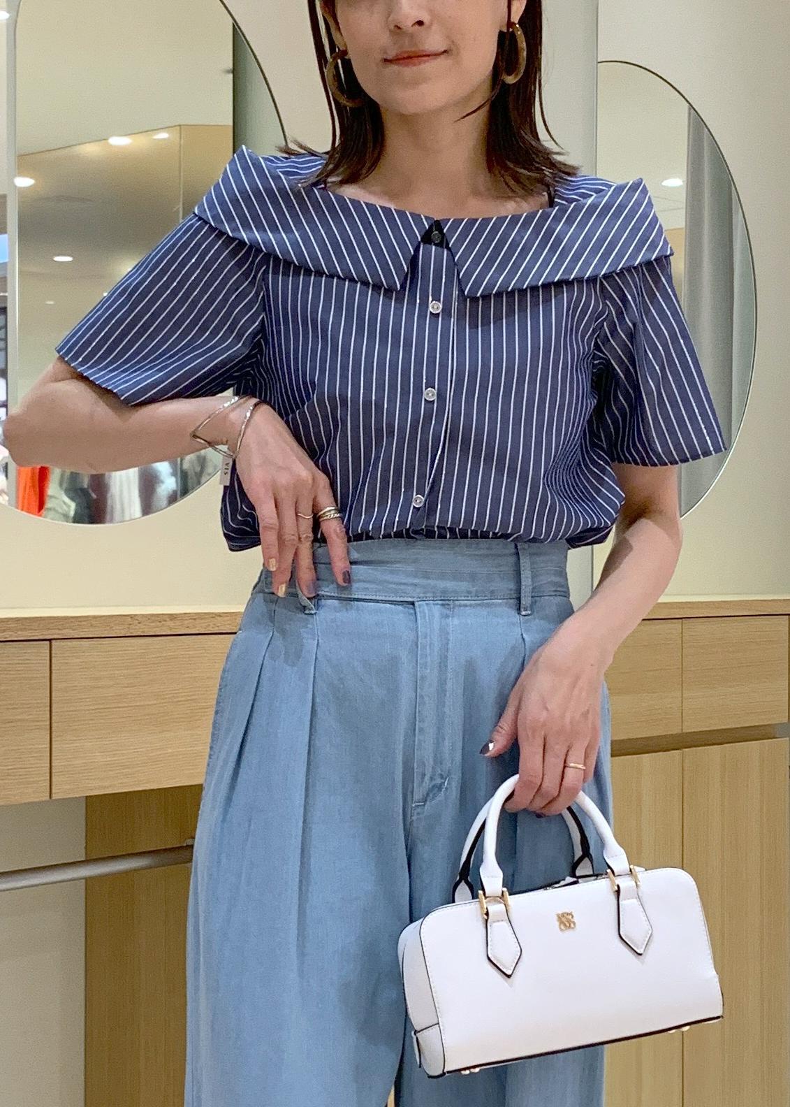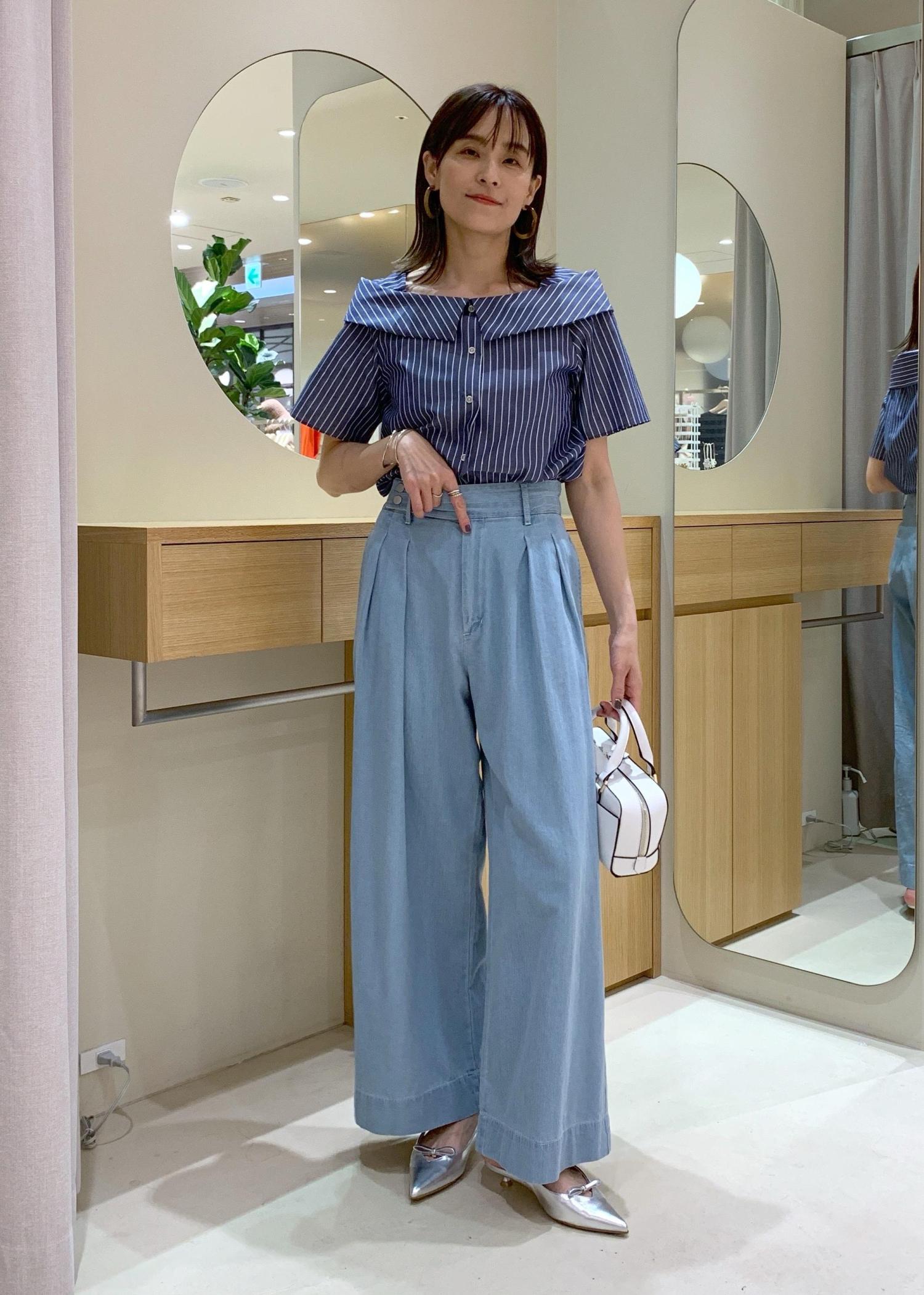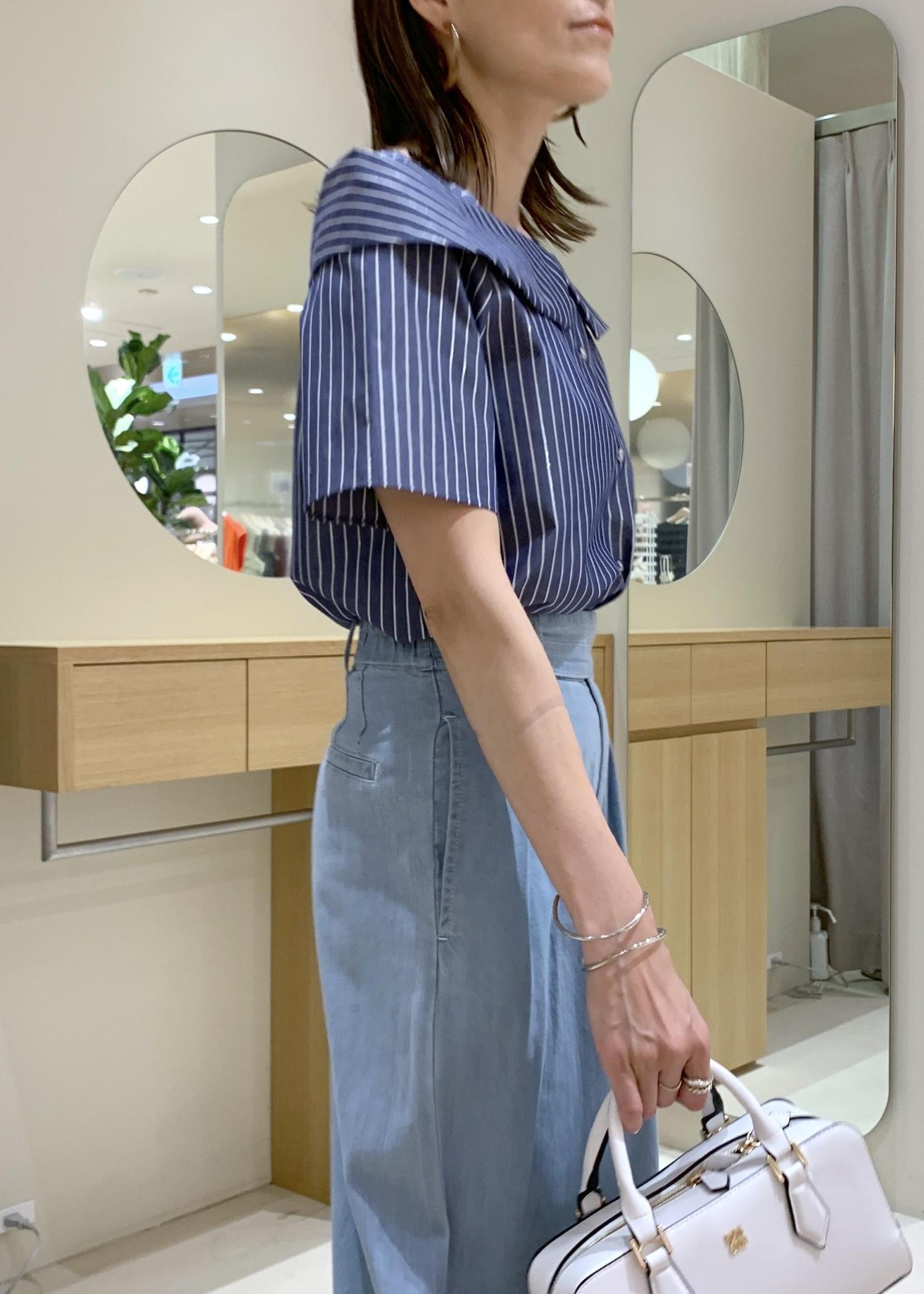 夏にふさわしいブルーとストライプ生地のブラウスコーデ。