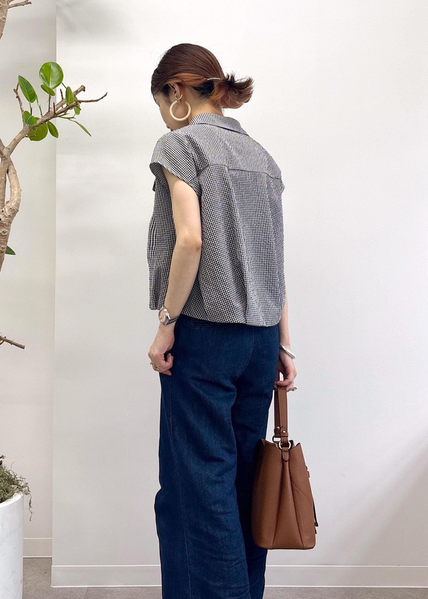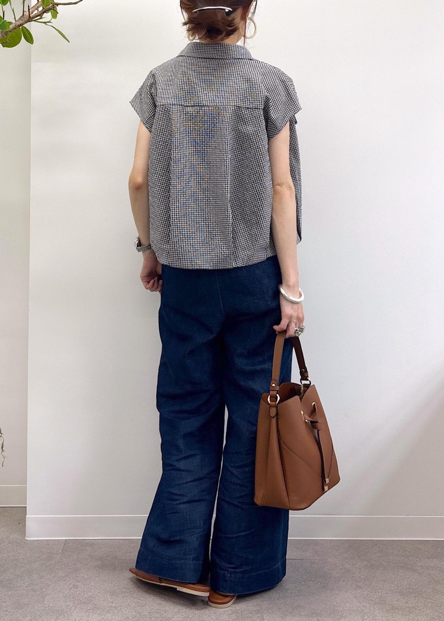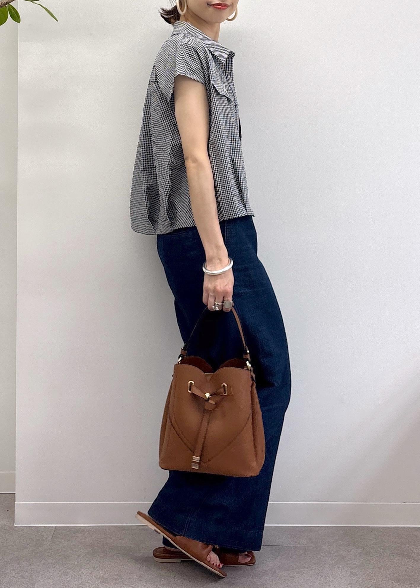 サラッとした、ドライタッチが嬉しいサッカーブラウス♪一枚でも、ボタンを外して羽織としても着回しができる優秀ブラウスです。今回はカジュアルにワイドデニムで羽織ったバージョン。小物はキャメルが好み◎夏に向けてオススメの大人カジュアルコーデ。