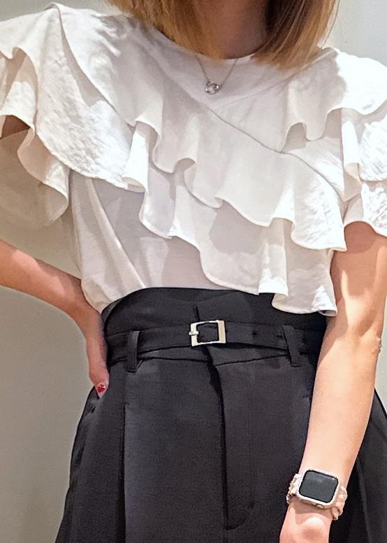 ティアードデザインのフリルが特徴的なブラウスは、一枚で華やかさと可愛らしさを演出。