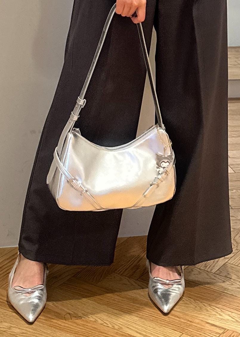 シルバーカラーの小物はアイボリーとチャコールグレーの落ち着いたトーンの中に、さりげないエッジが効いてて◎