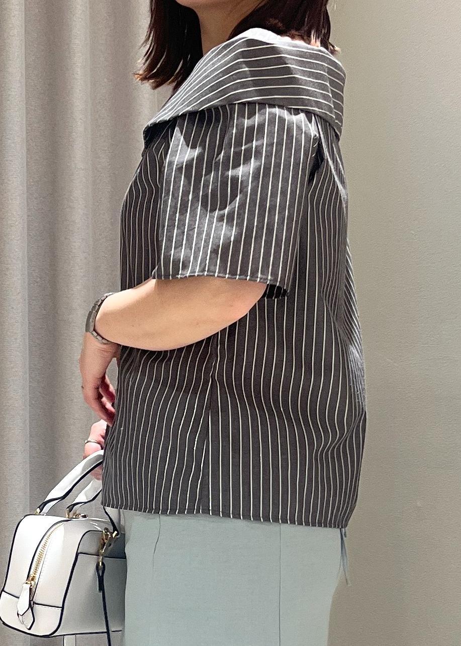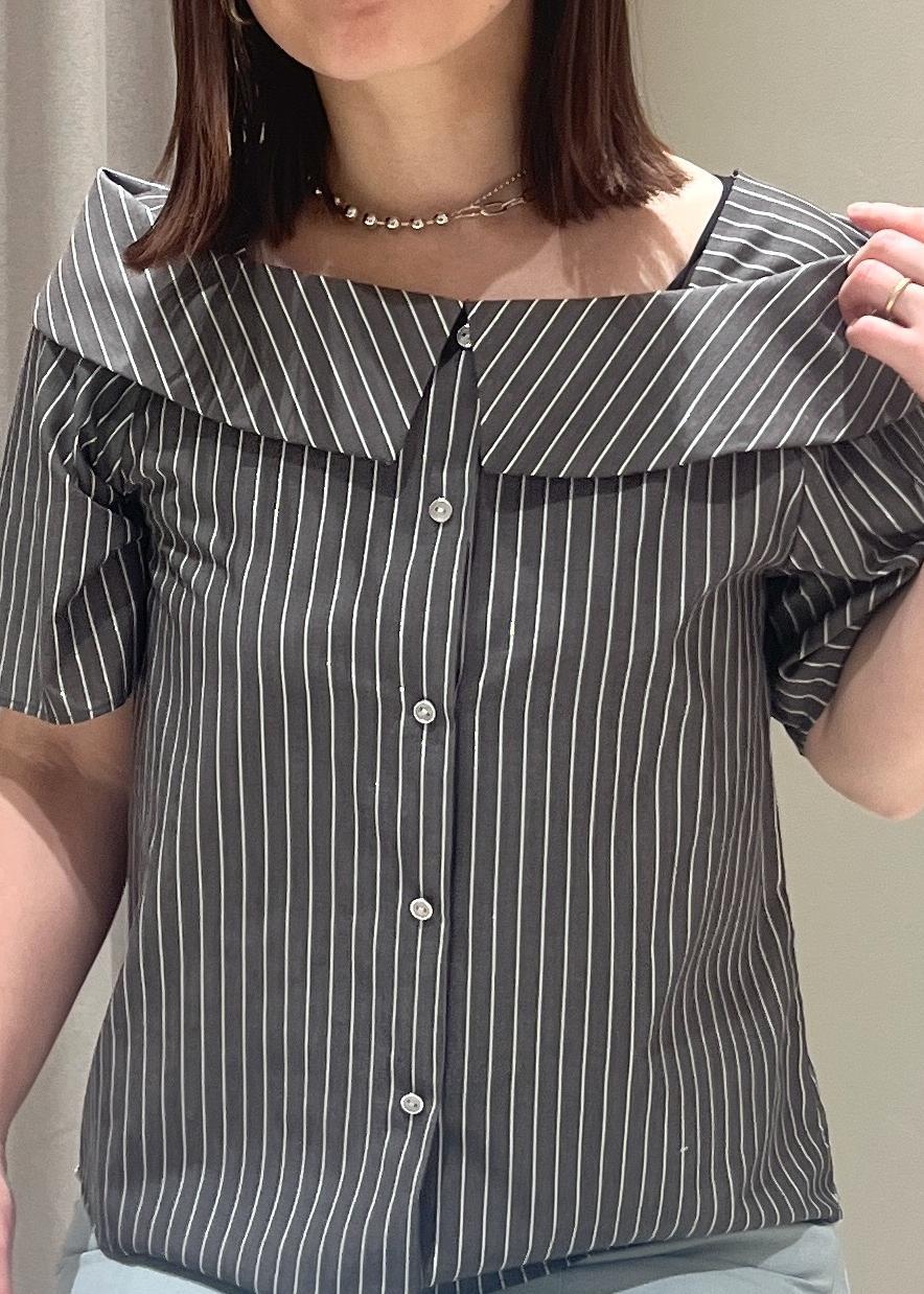 VIS【新色追加】【防シワ】ラメミックスオフショルダー風ストライプシャツダークブラウン系 / F¥5,489レビューキラッとしたラメ感とデザインが可愛く着映えするブラウスです!