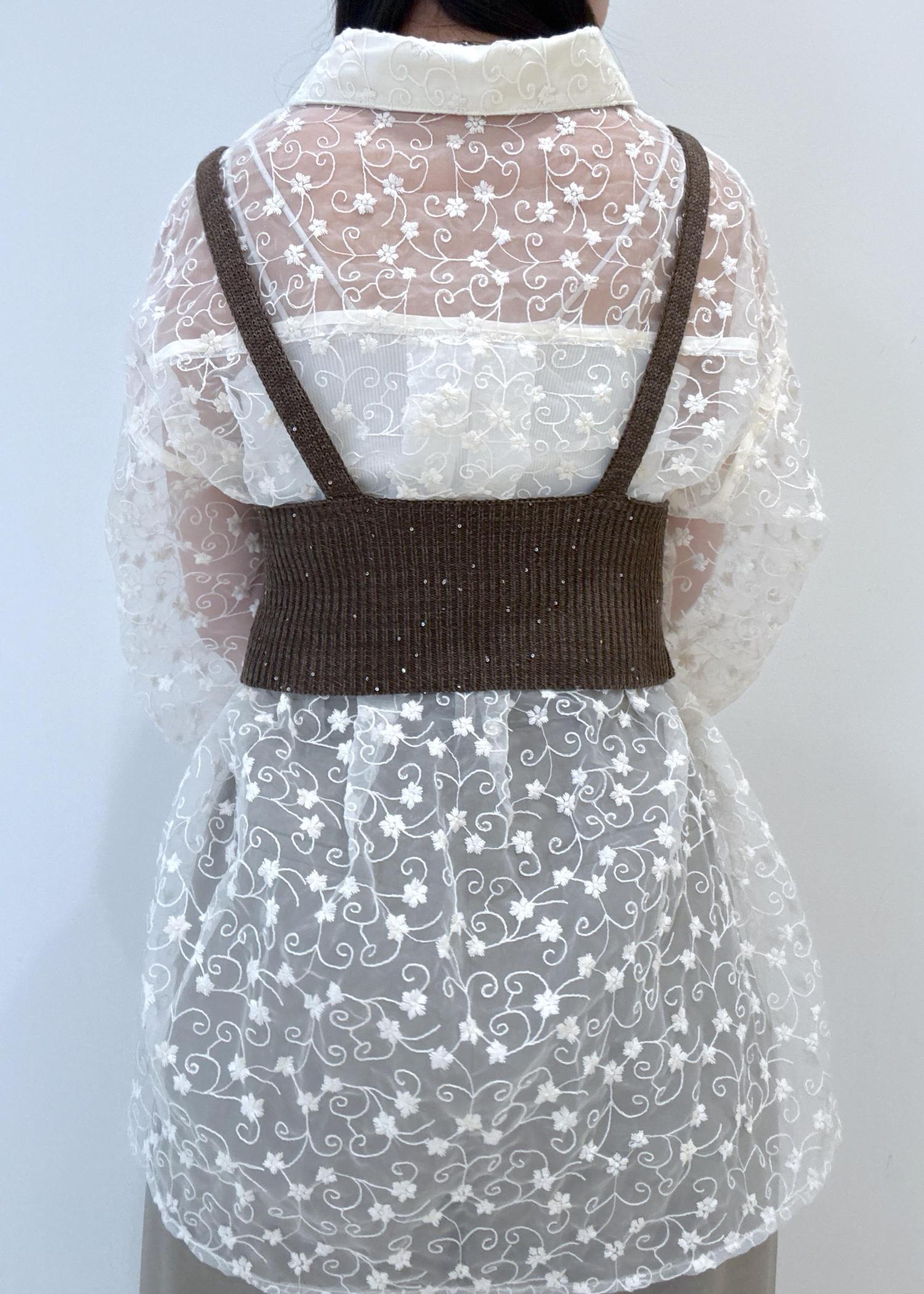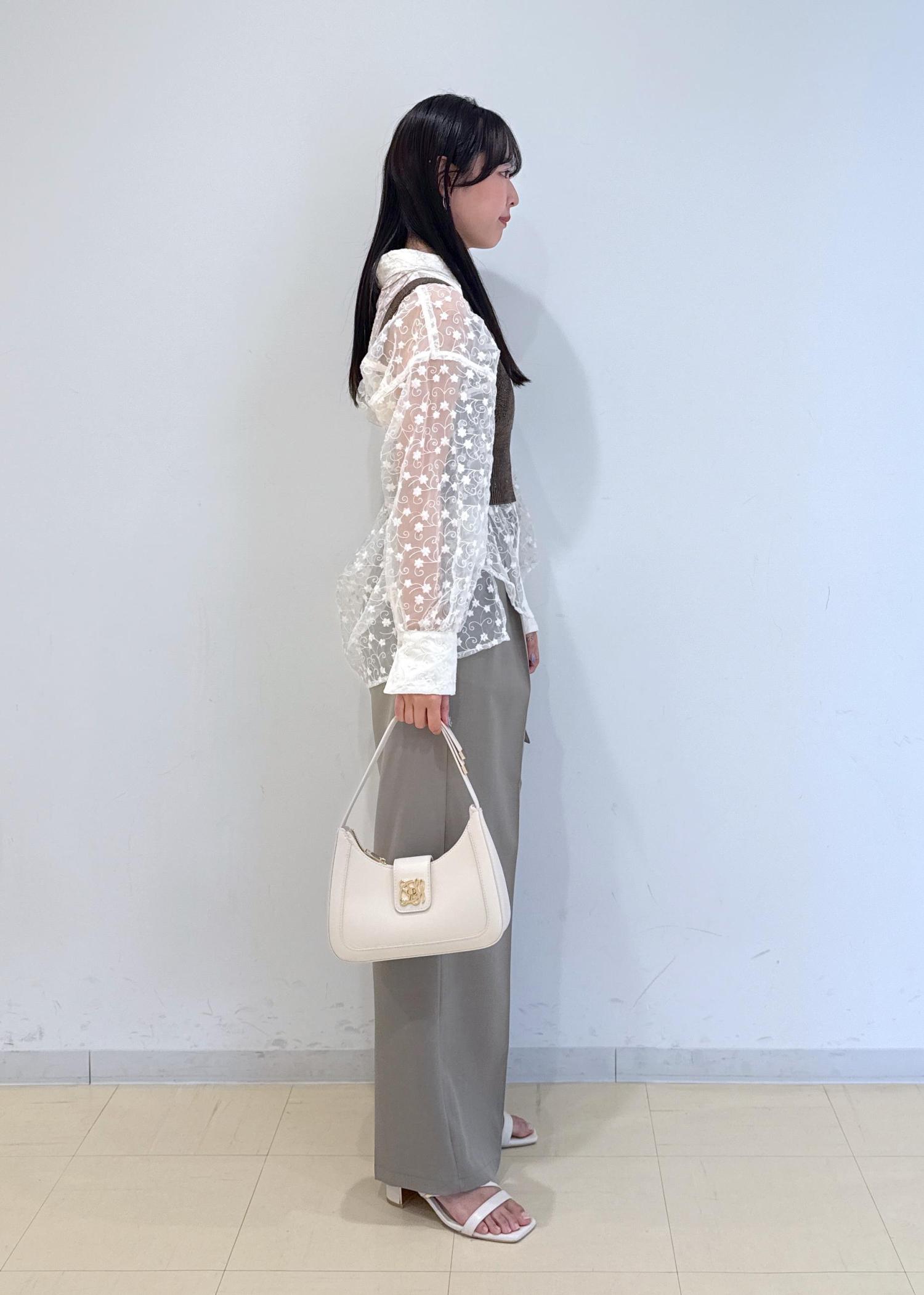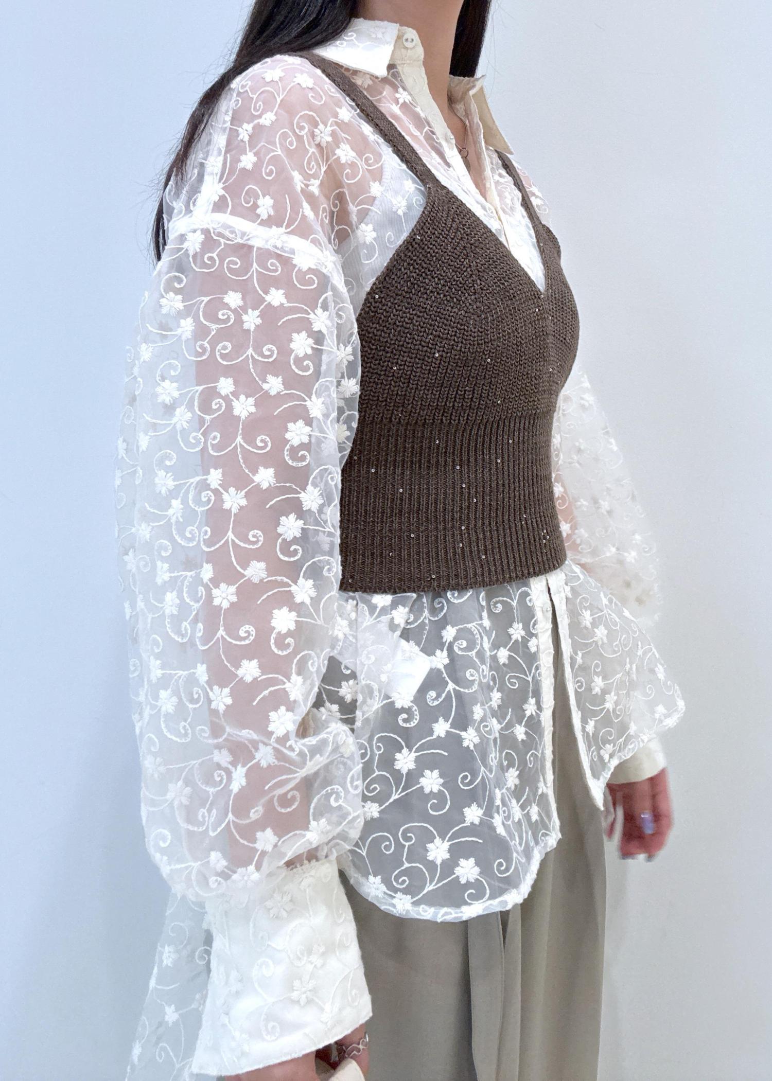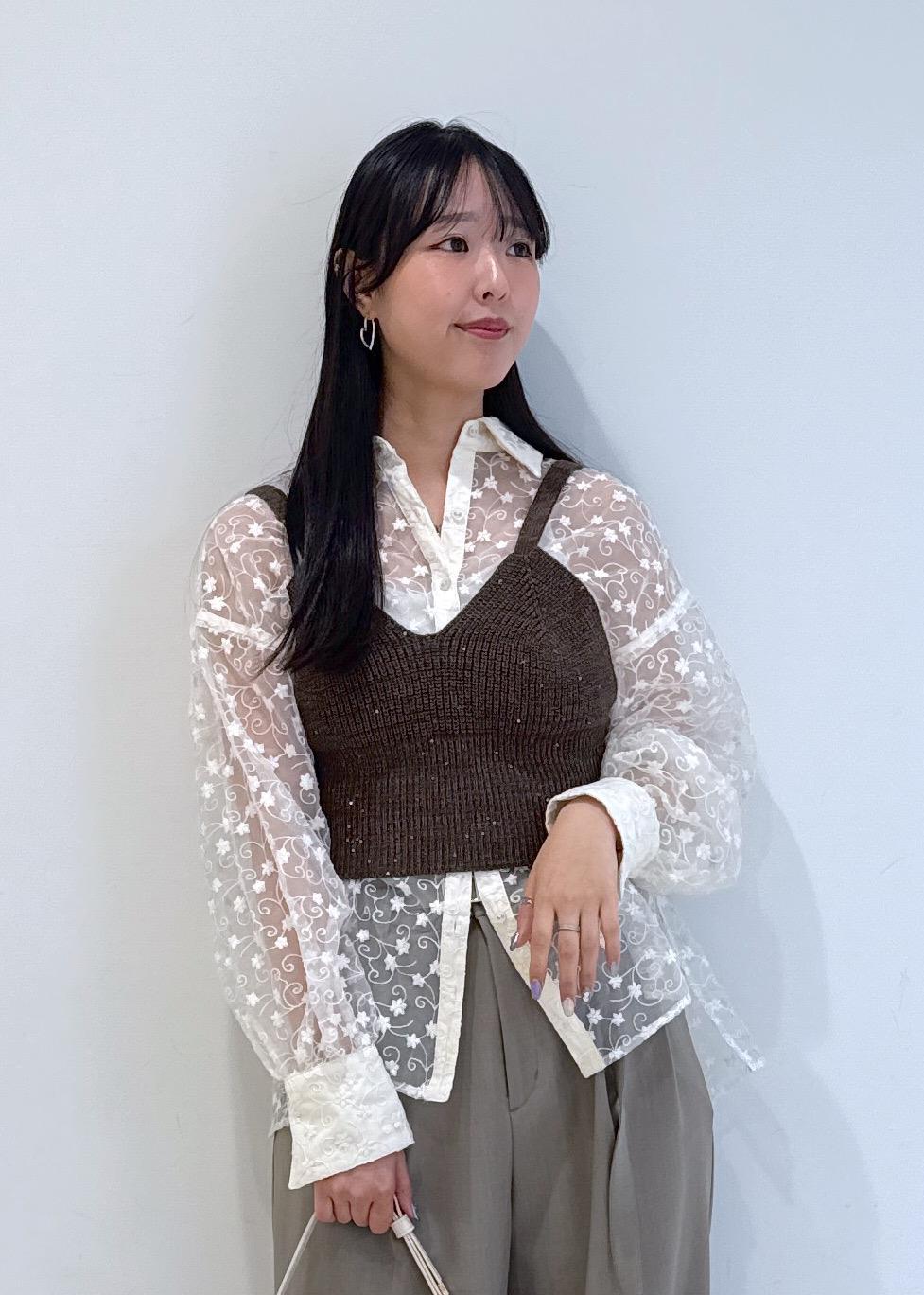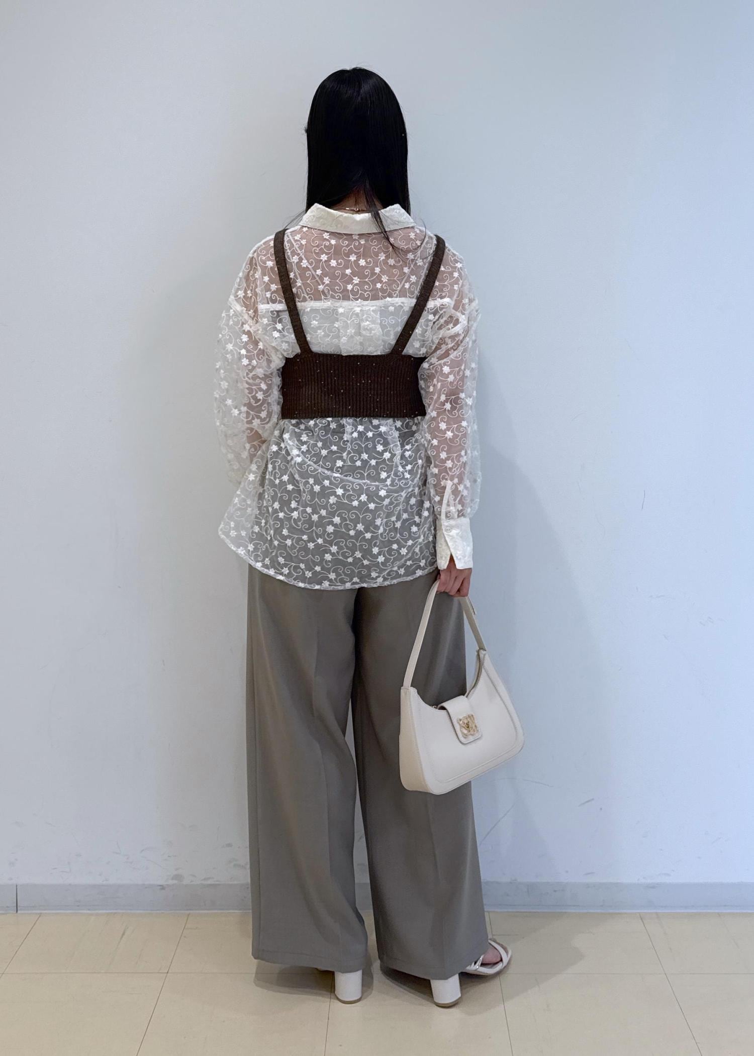 キャッチーでオシャレなシアーシャツにビスチェをレイヤードしたオシャレな淡色コーデです