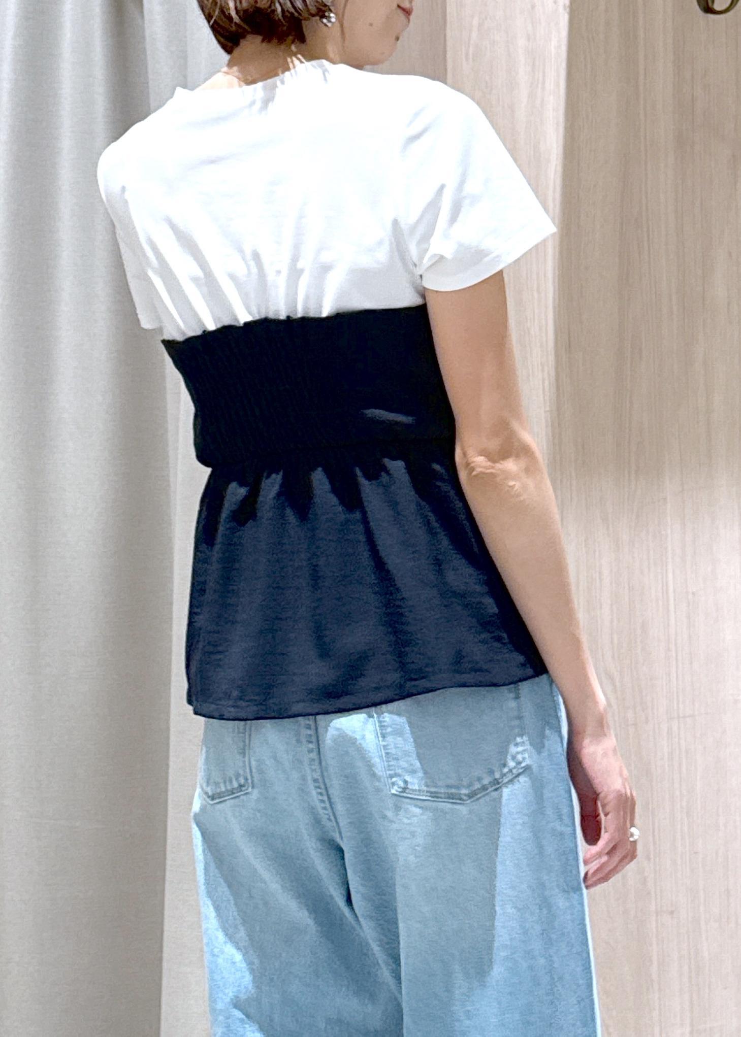 Tシャツ生地にビスチェが付いていて、切り替え部分はゴムが入っているので着ると腰辺りをふんわりカバーしてくれるデザインです。