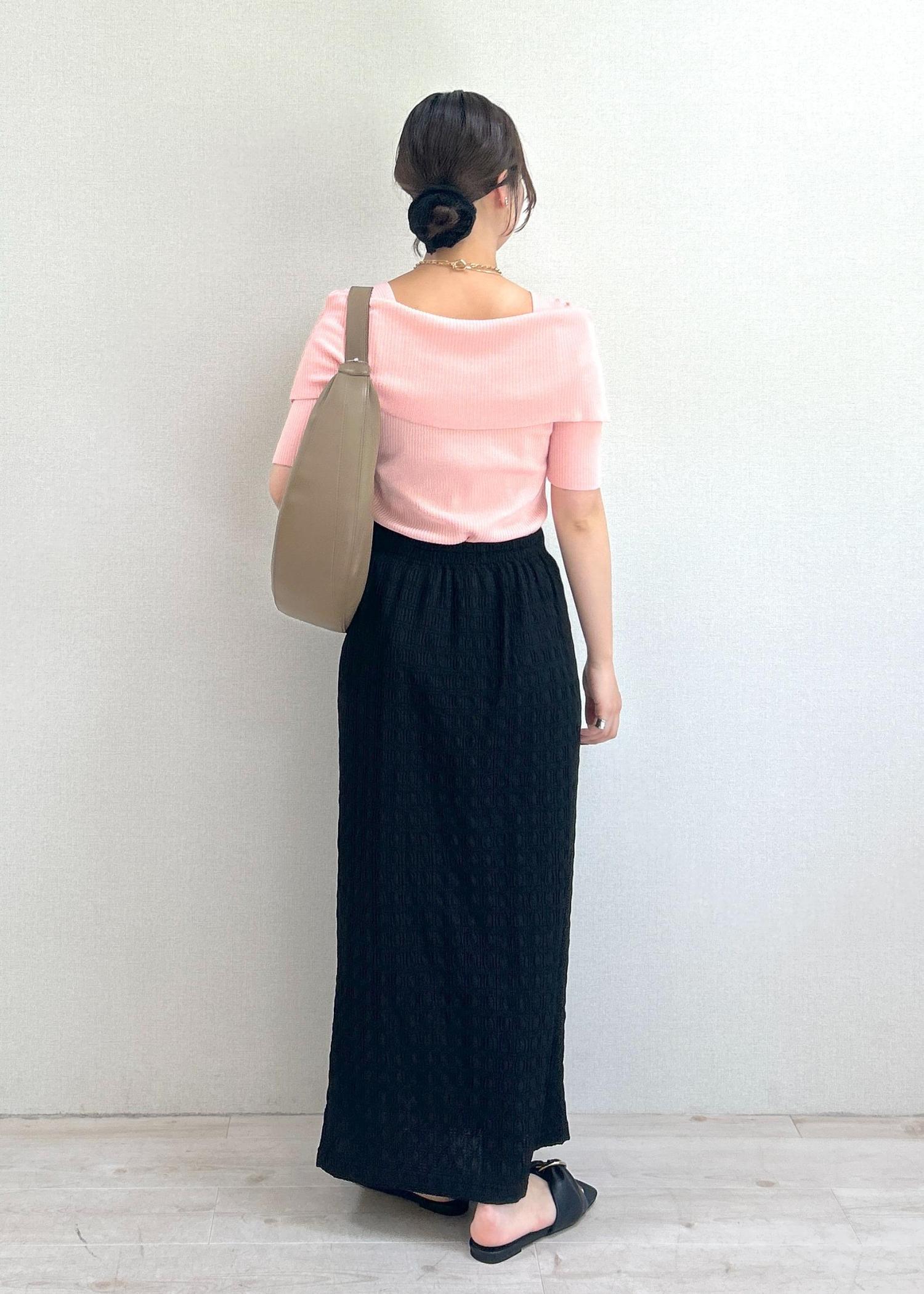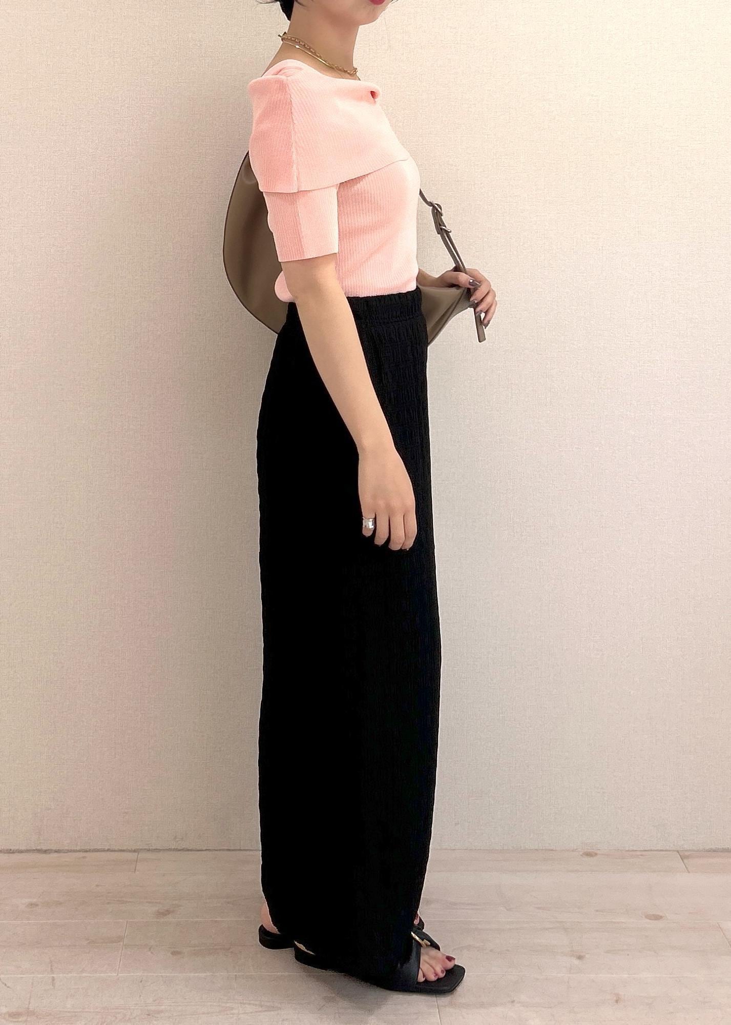 ピンクの少し甘めなオフショルニットを使った、大人っぽくてフェミニンなコーデです。