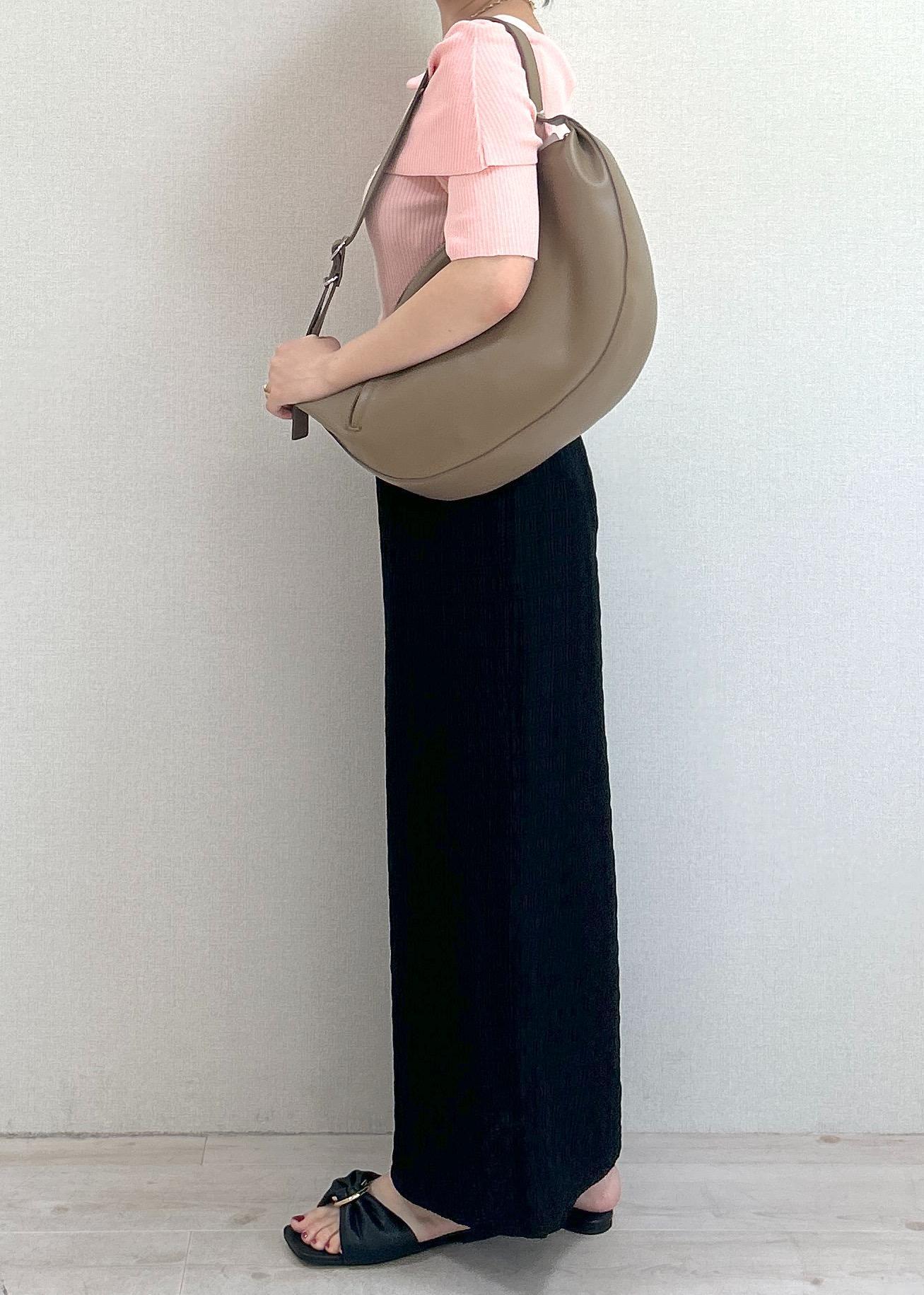 女性らしさやキレイめな印象のスタイリングですが、上下ともコンパクトなシルエットで細見えするのに伸縮性の高く締め付け感がないので着心地がとっっっても楽なのがポイントです!