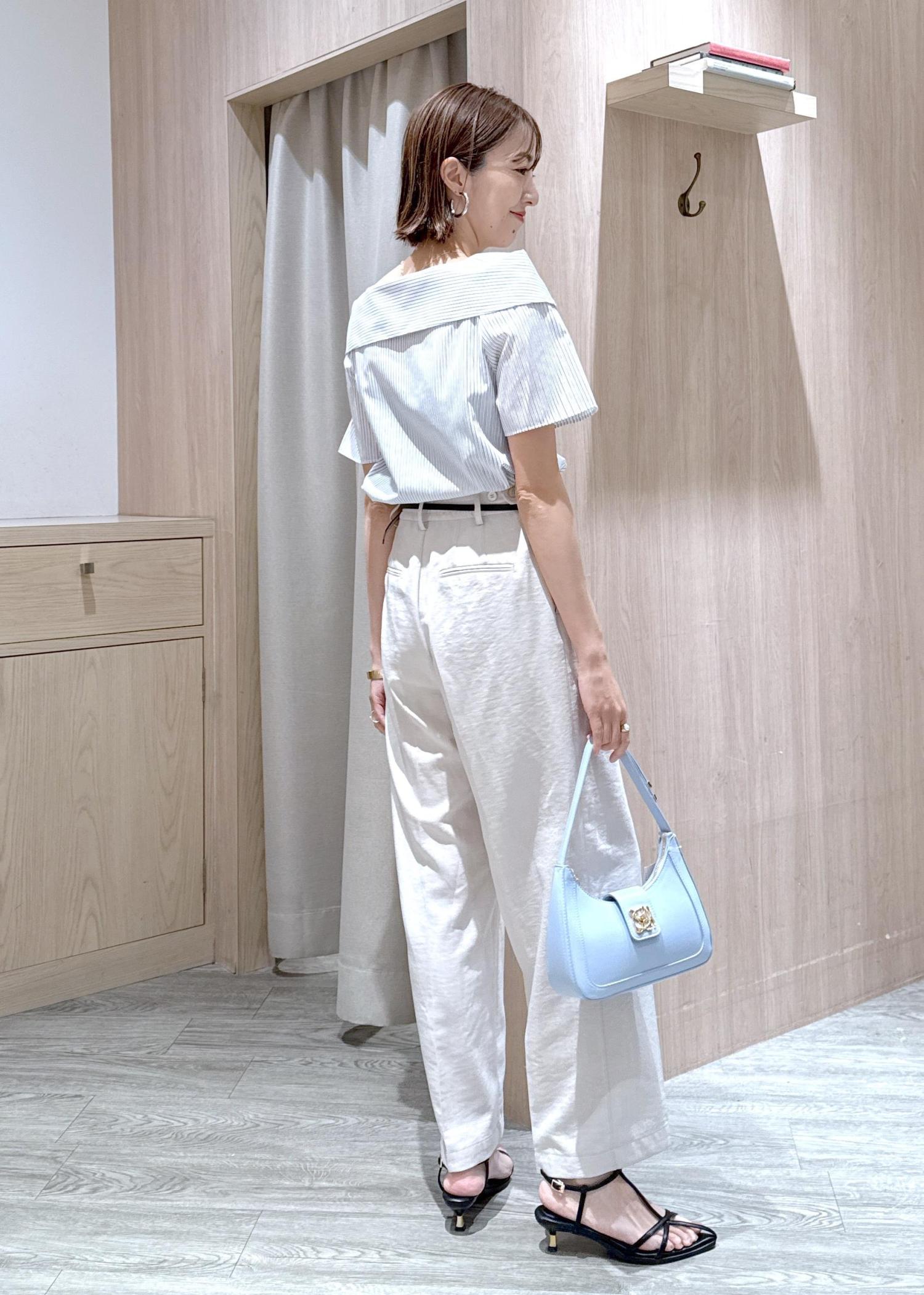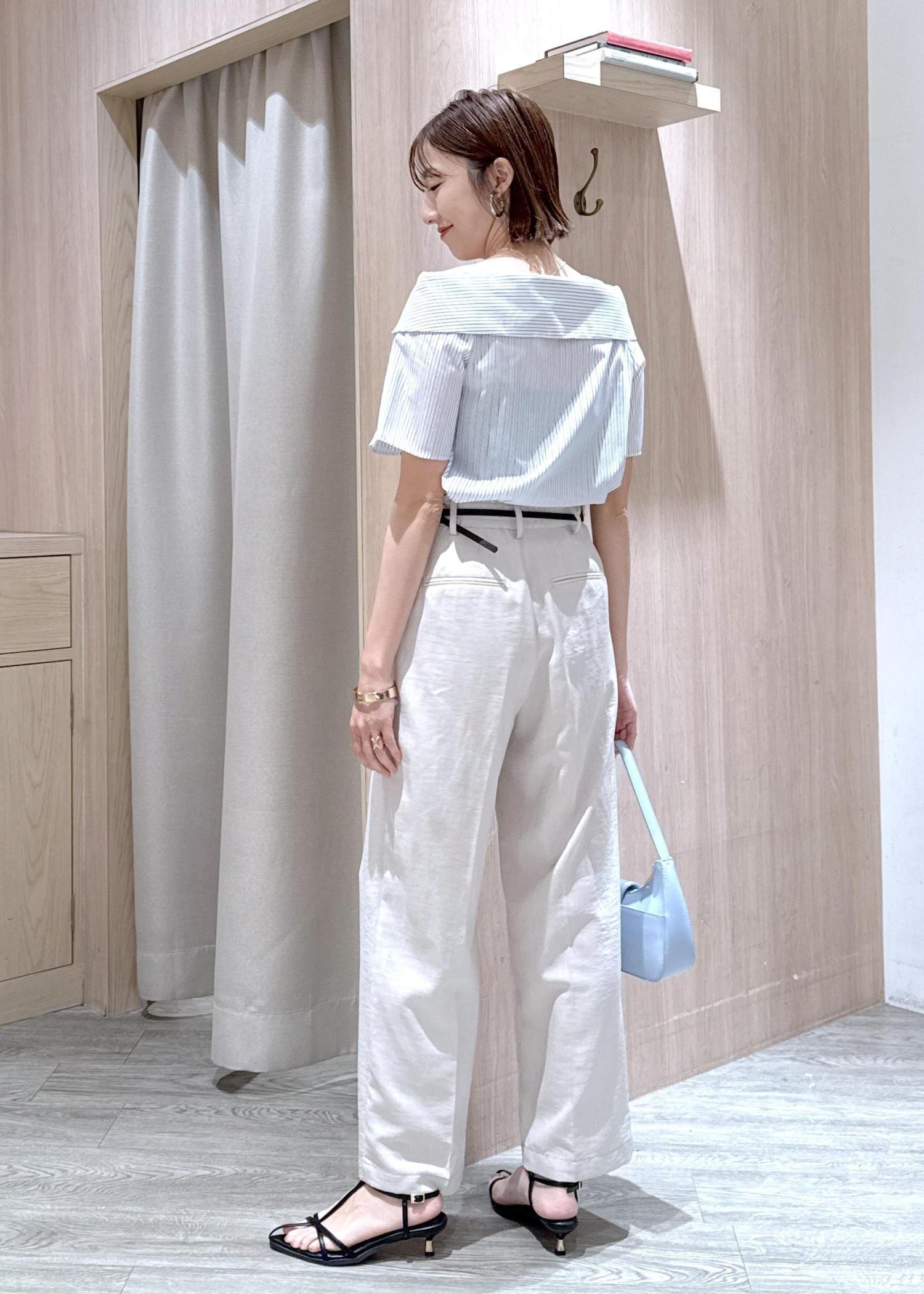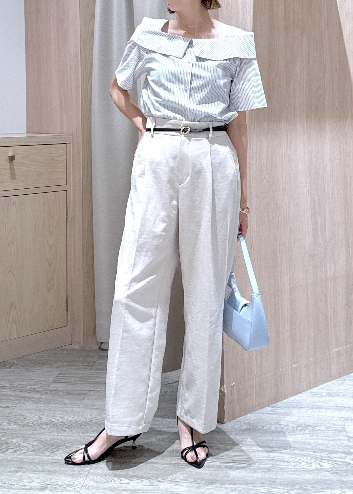 一枚でオシャレ見えするオフショルダー風ブラウスを使ったワントーンコーデです♪