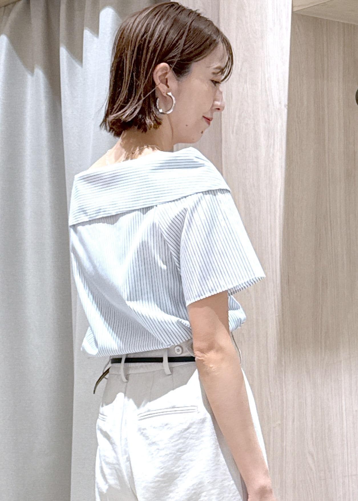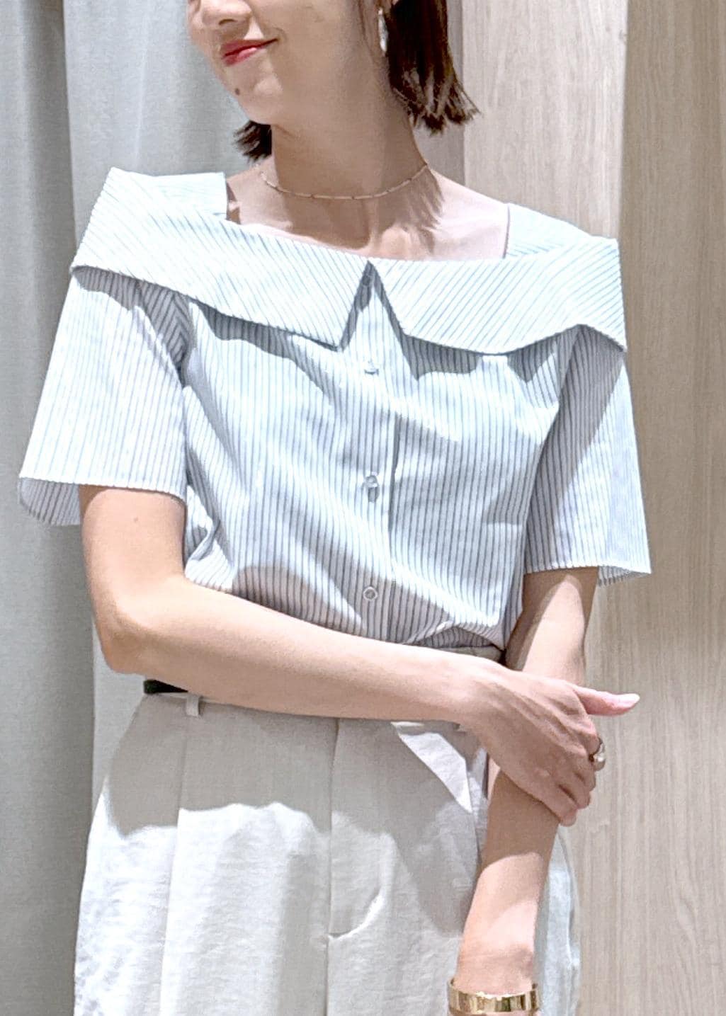オフショルダー風のデザインで一枚でオシャレ感のあるブラウス。