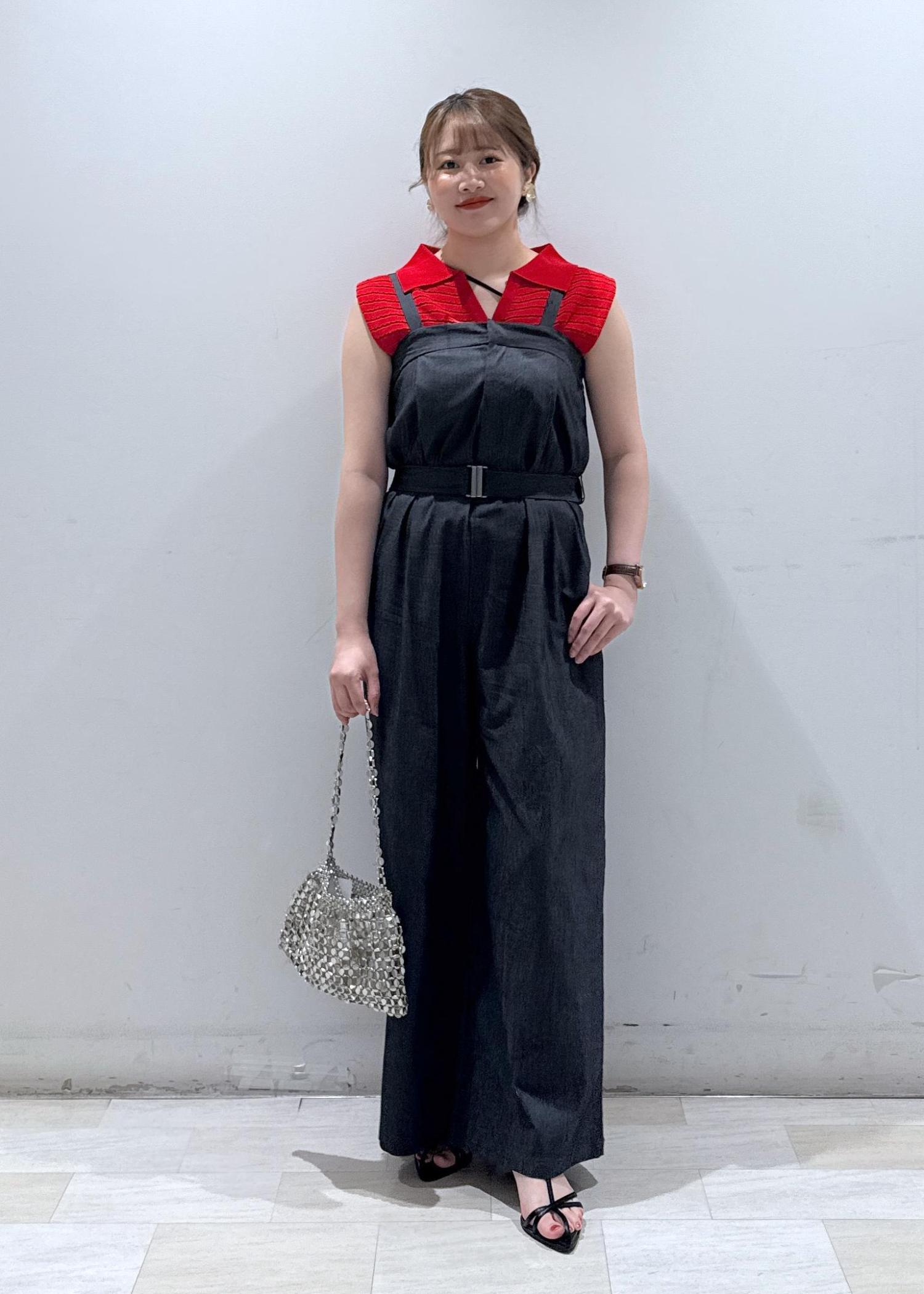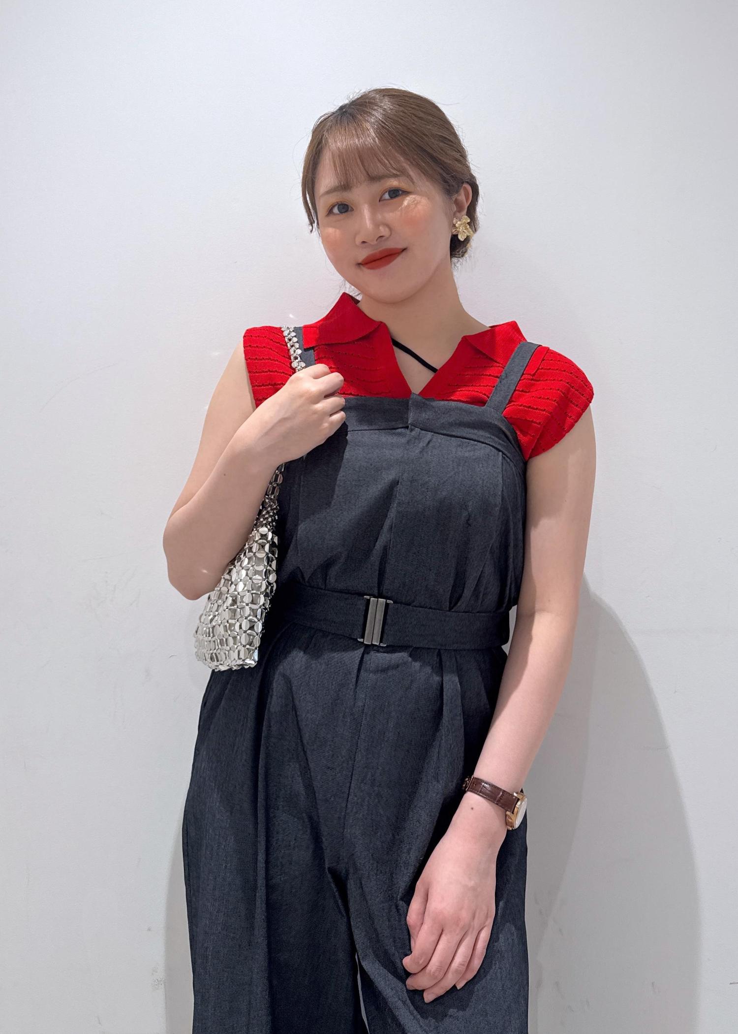 発色が綺麗な赤を差し色にインナーに入れて、デニムのサロペと合わせて綺麗めカジュアルにしてみました☆