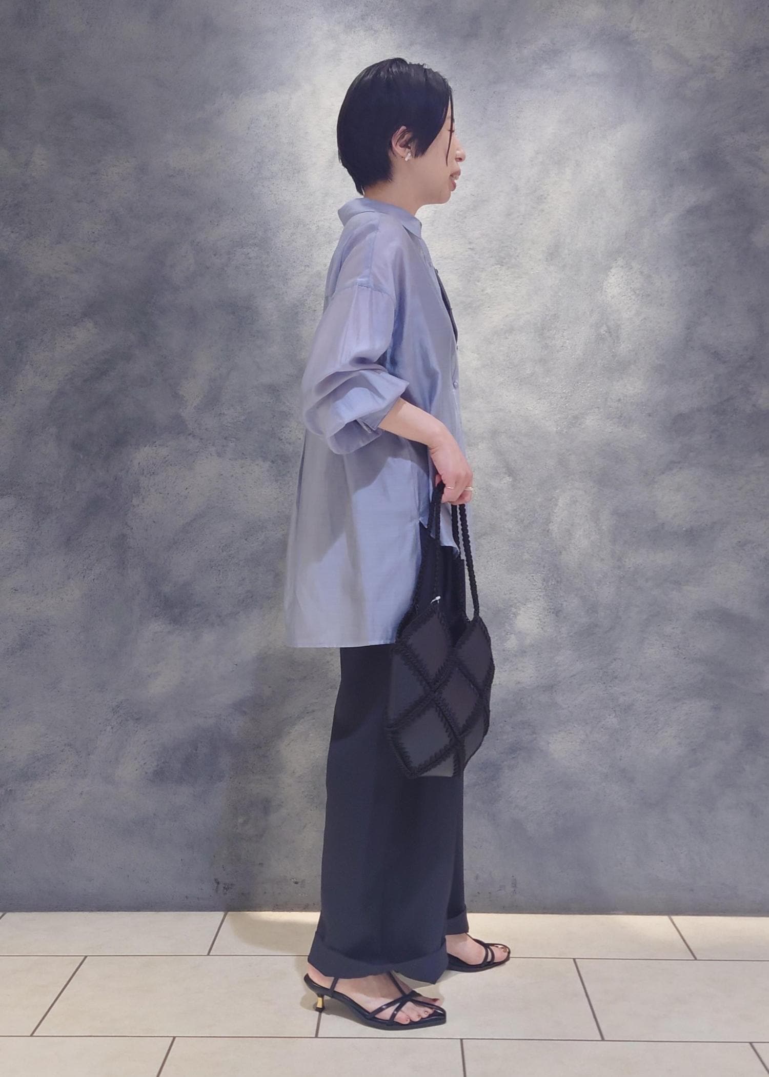 ゆったり目のシアーシャツにワイドパンツのリラックススタイルです。