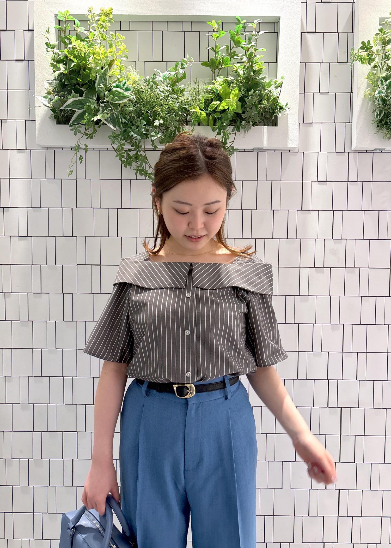 VIS【新色追加】【防シワ】ラメミックスオフショルダー風ストライプシャツダークブラウン系 / F¥5,489レビュー身長150センチで、お尻半分隠れる丈感。