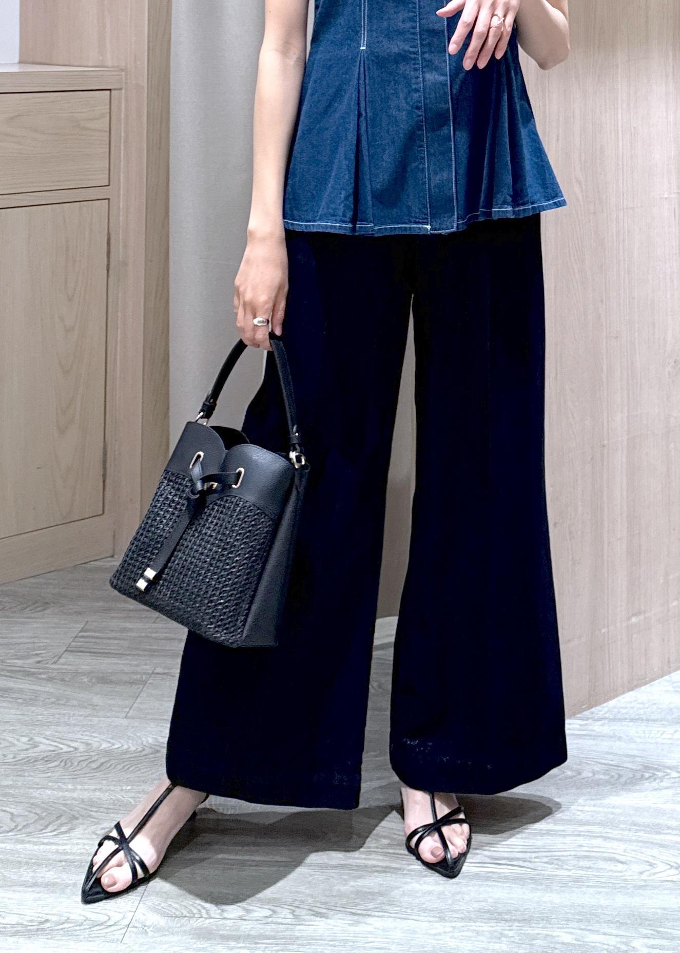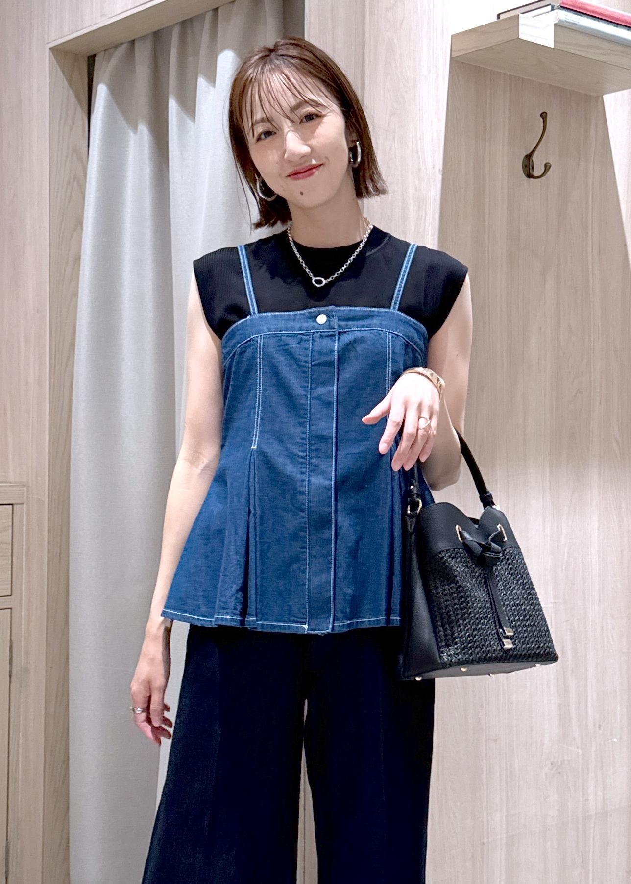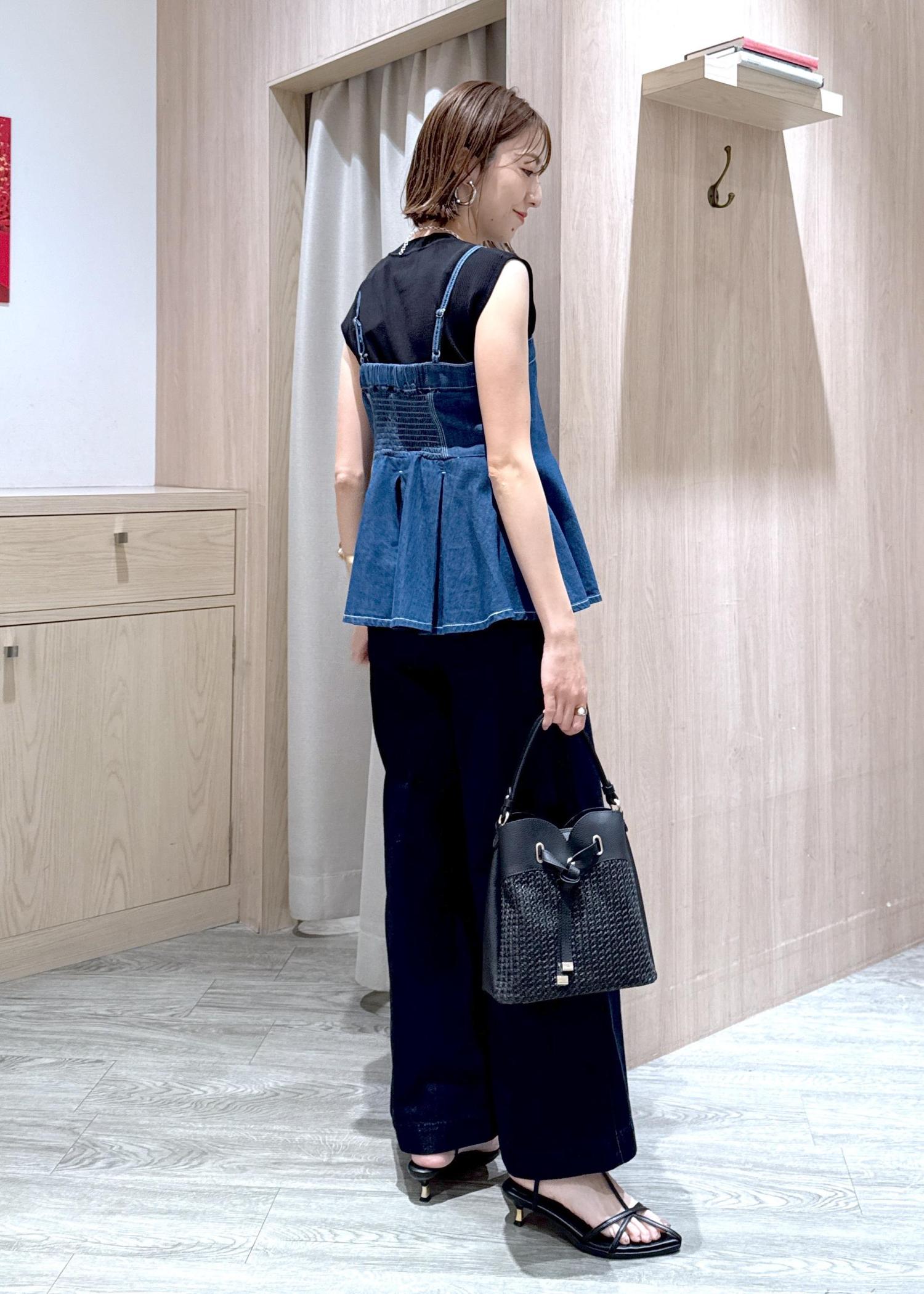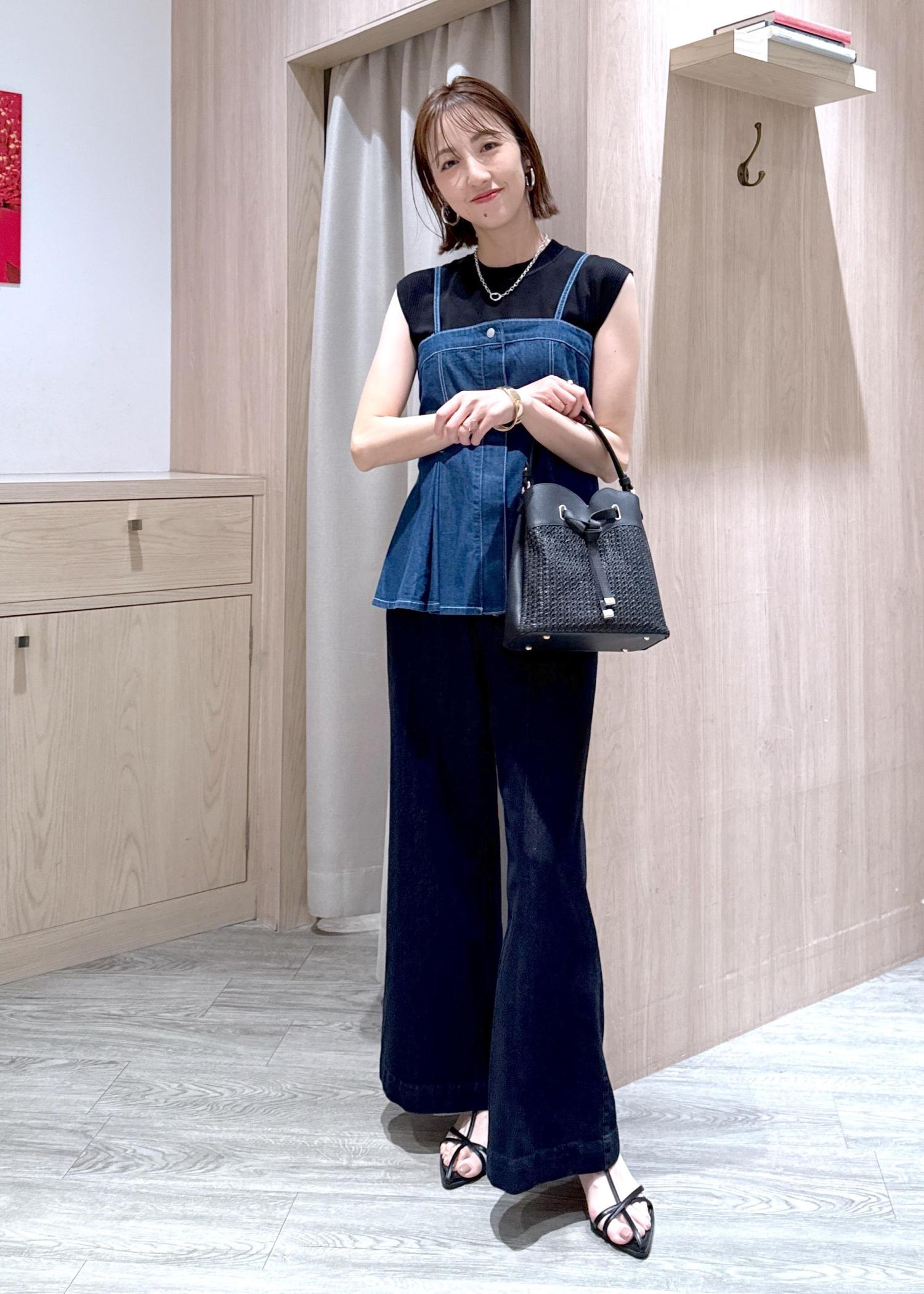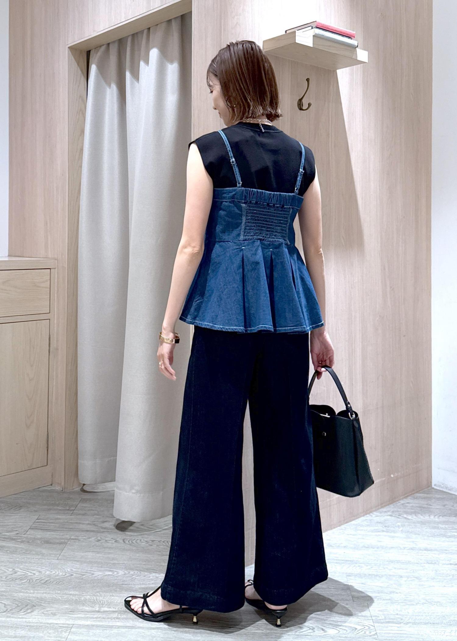 同じ素材のデニムとセットアップでも着られますが、ブラック系でまとめてデニムビスチェを大人っぽくスタイリングしました♪