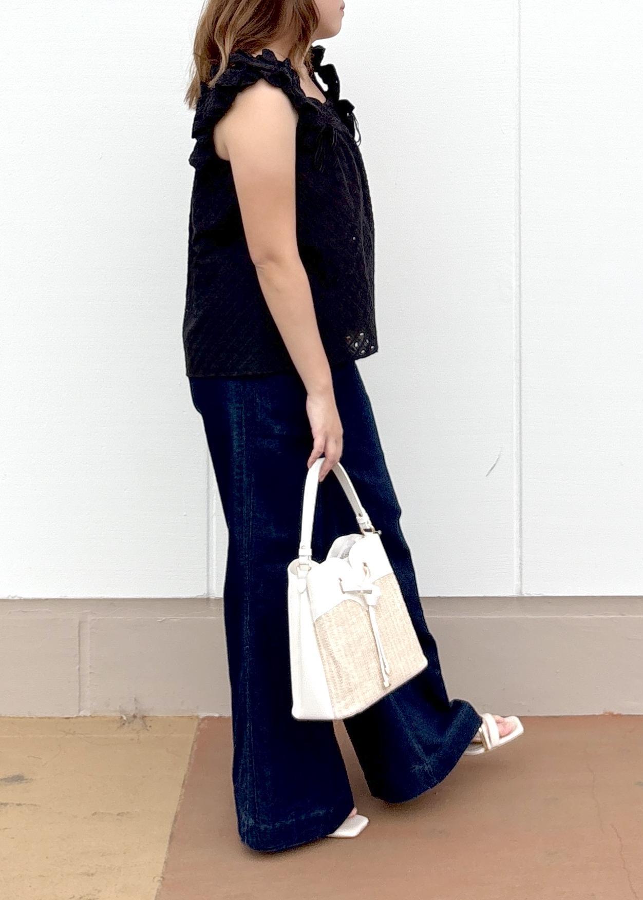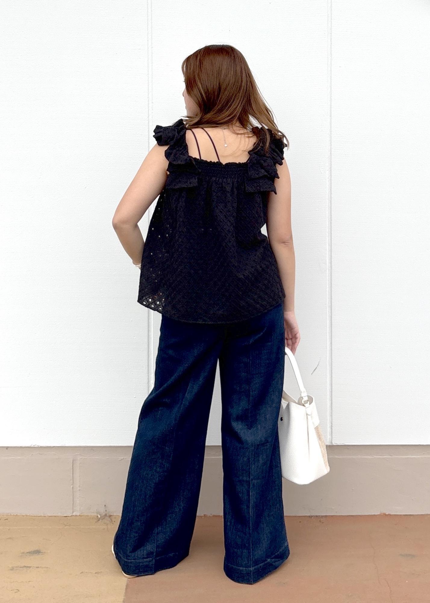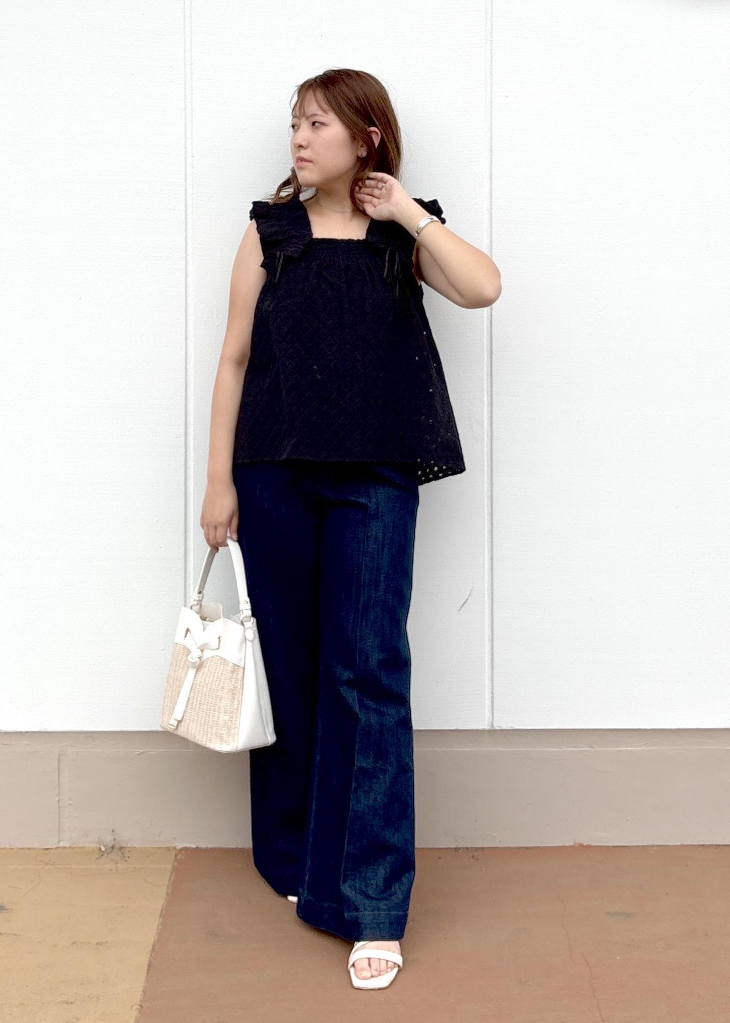 トレンドのコットンレースデザイントップスとデニムを合わせたカジュアルコーデです!
