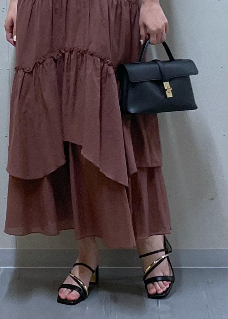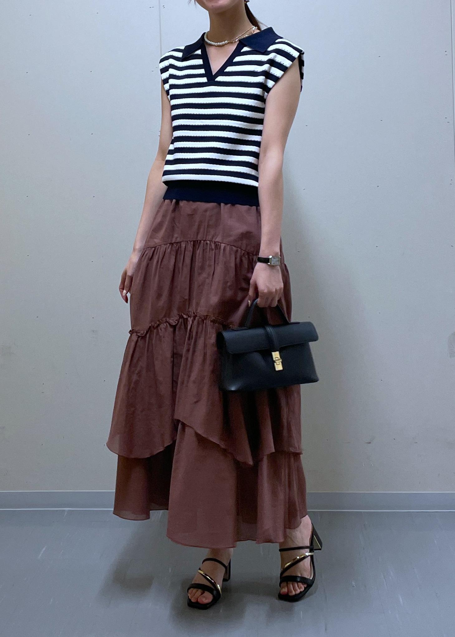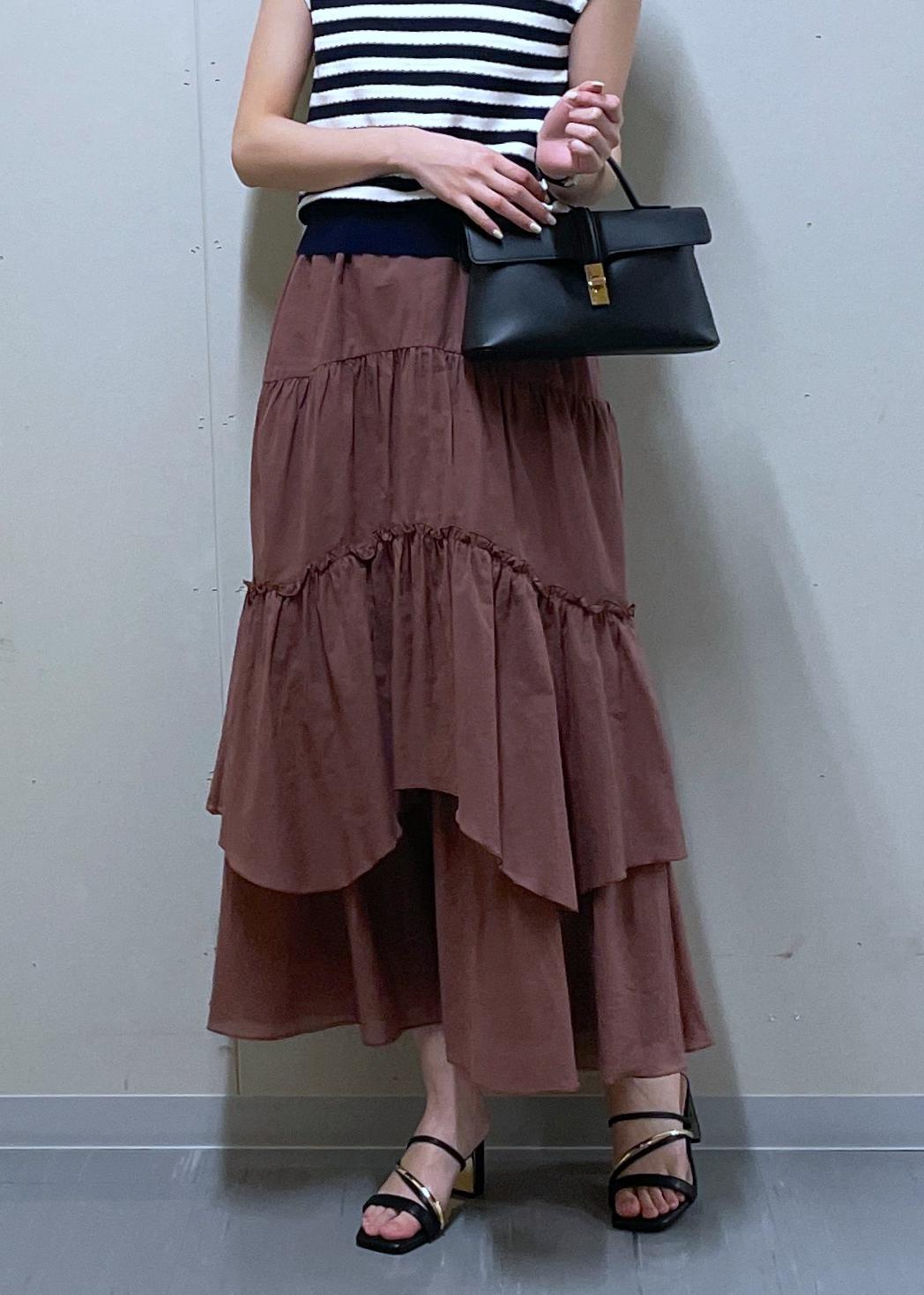 アウトレットVISボイルティアードスカートダークブラウン / F¥3,955レビュー夏らしい素材のティアードスカートです。ボリューム感があって存在感があるので、シンプルなトップスでもバランスよく着れると思います。