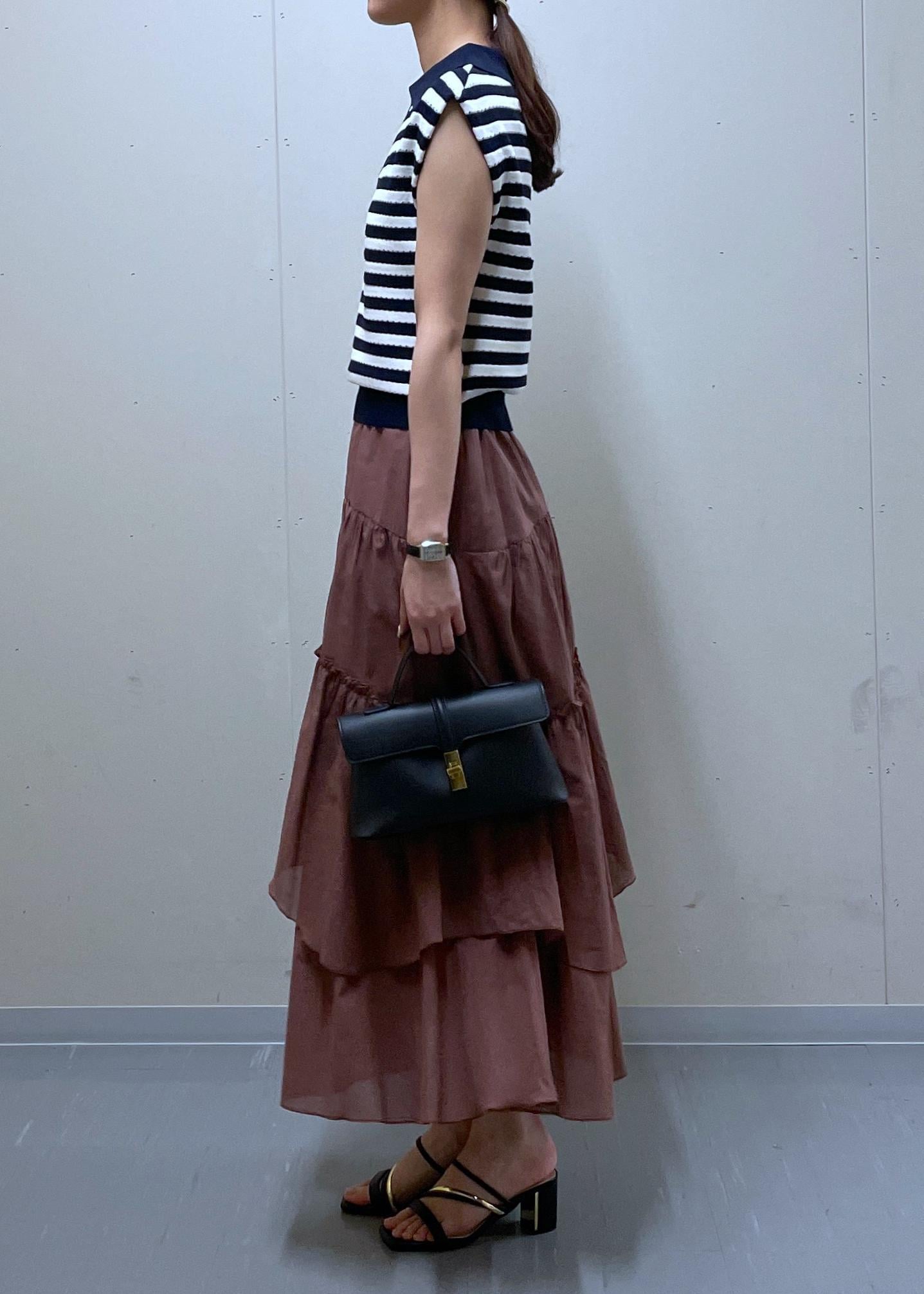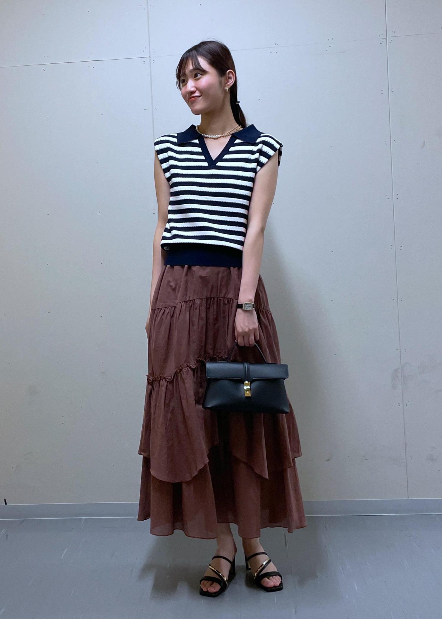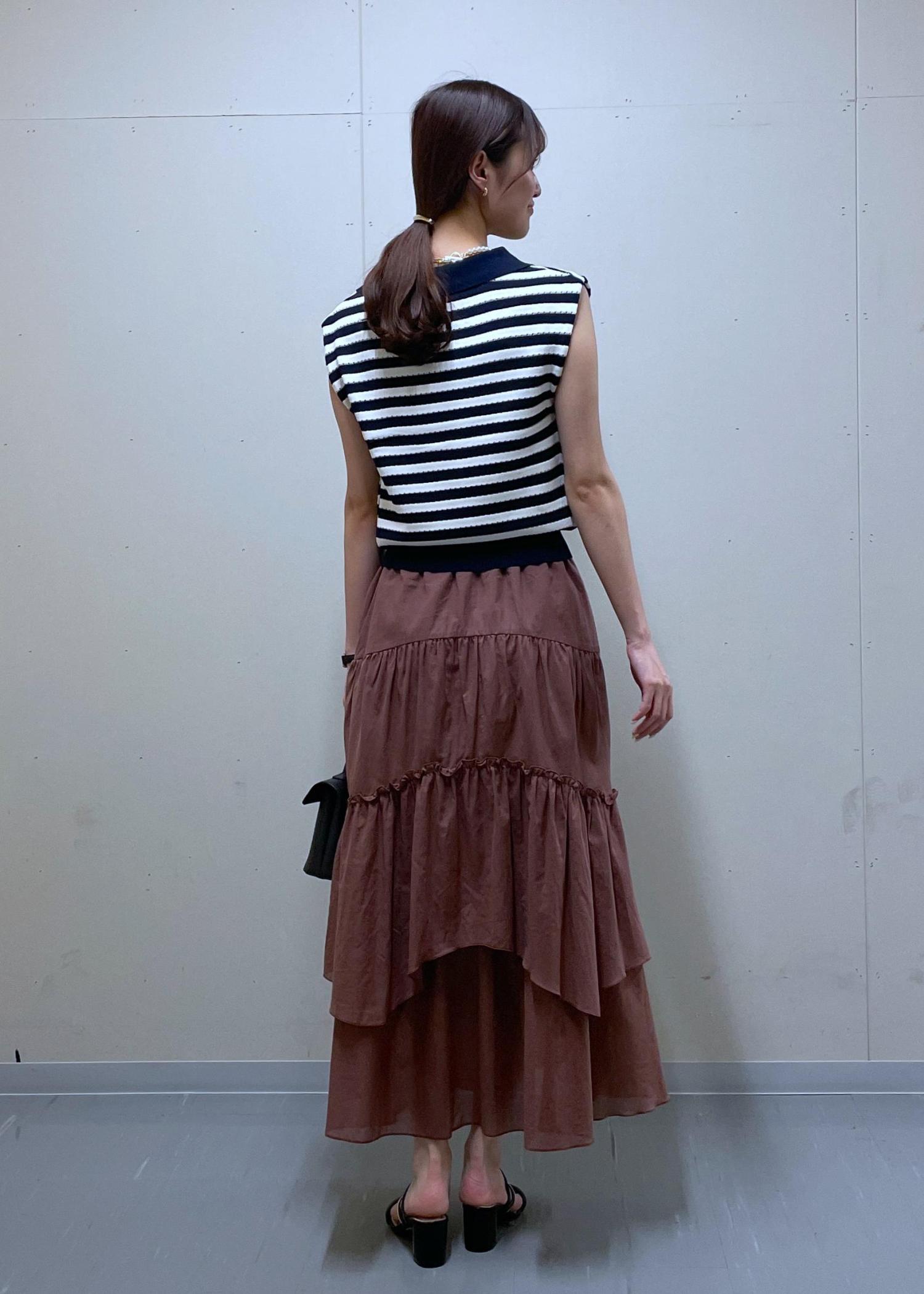 アウトレットVISボイルティアードスカートダークブラウン / F¥3,955レビュー夏らしい素材のティアードスカートです。ボリューム感があって存在感があるので、シンプルなトップスでもバランスよく着れると思います。
