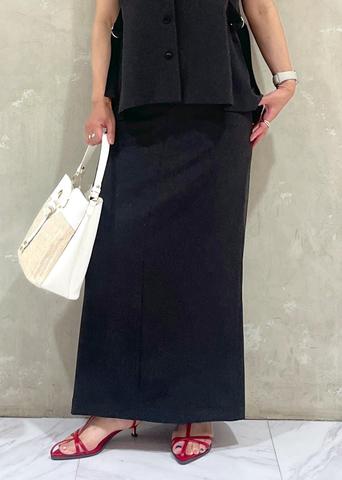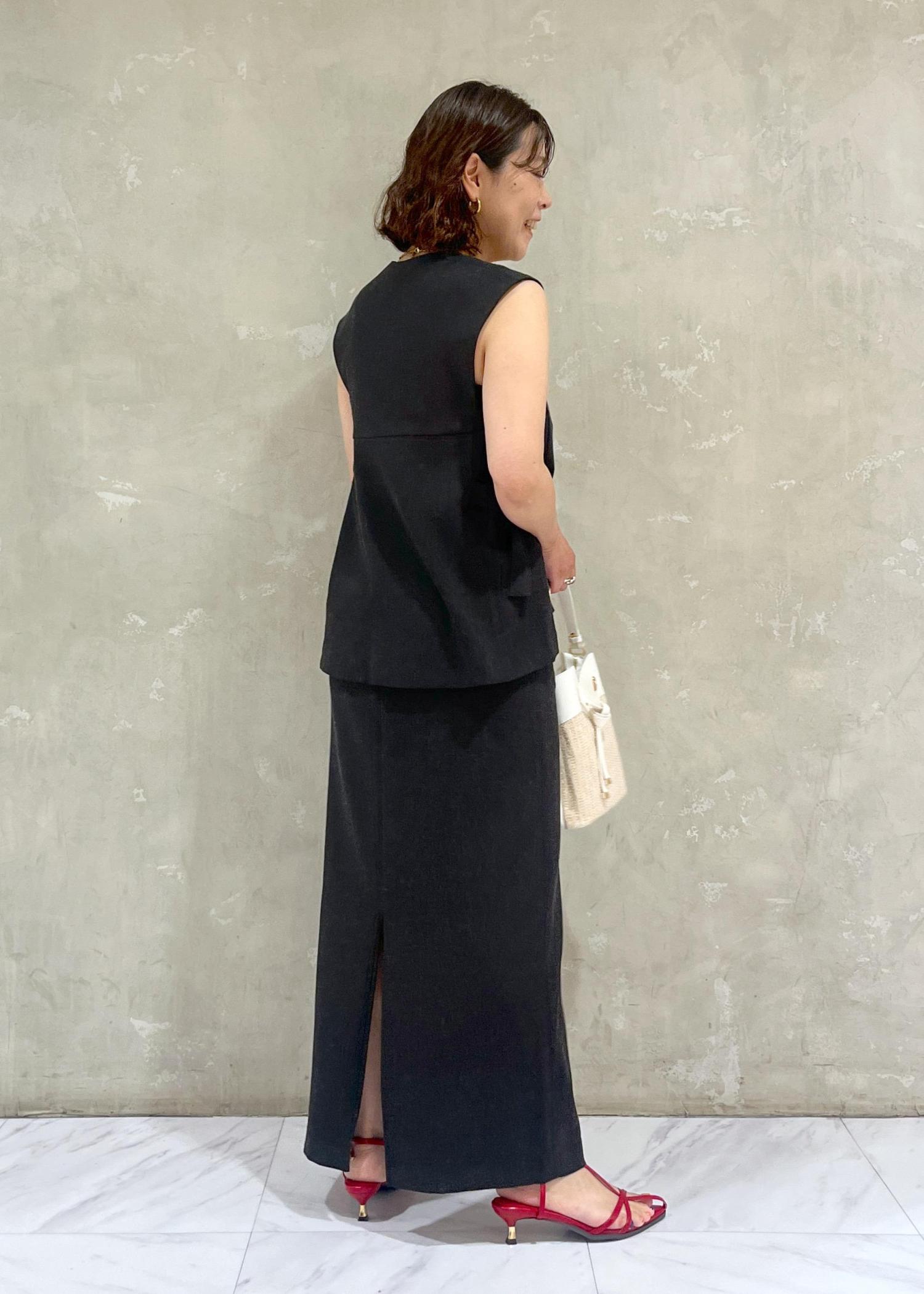 着丈は少し長めのIラインスカートなので、くるぶしくらいの長さになりますが、縦長のラインがきれいに出て脚長効果ありです。